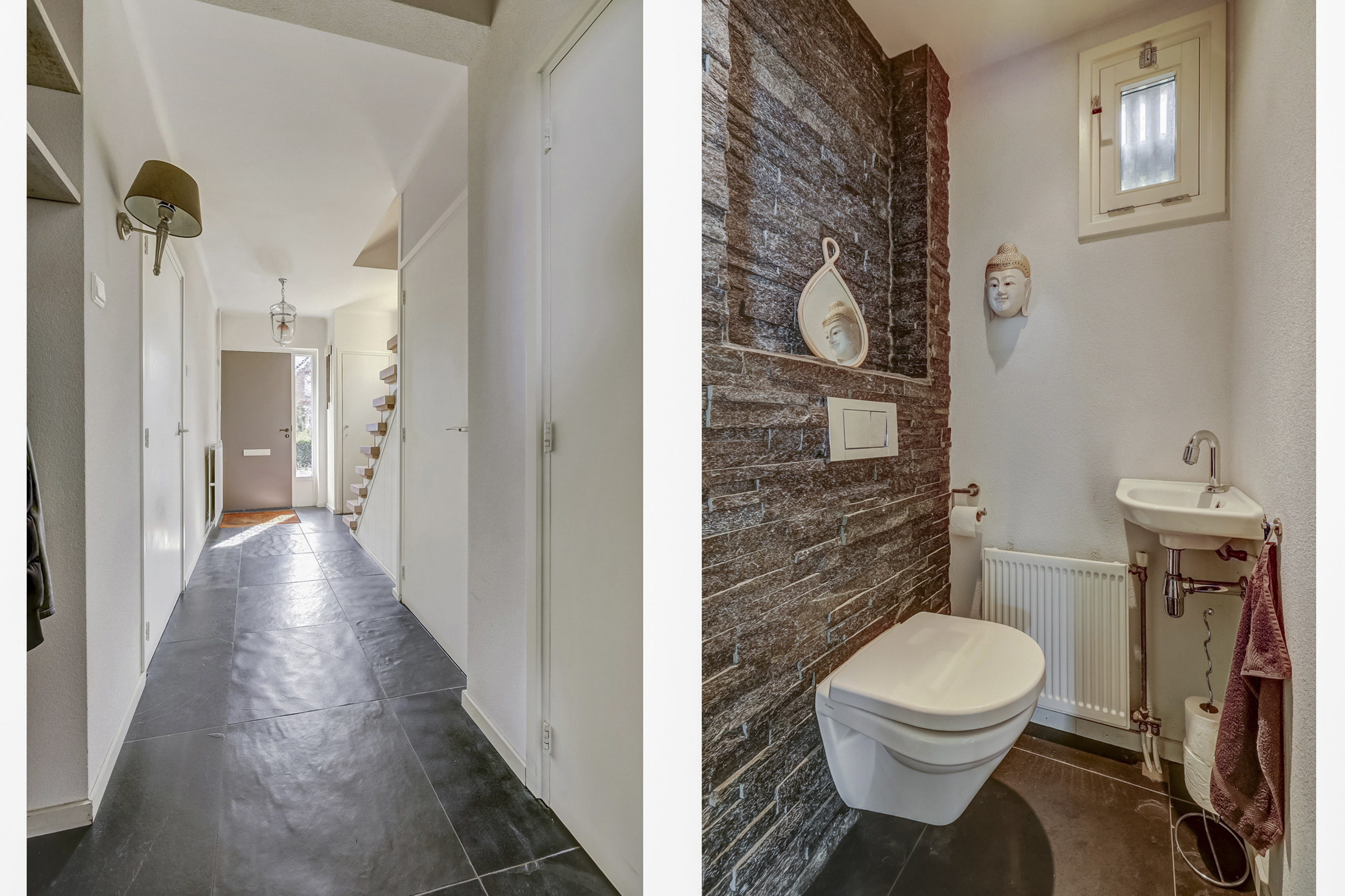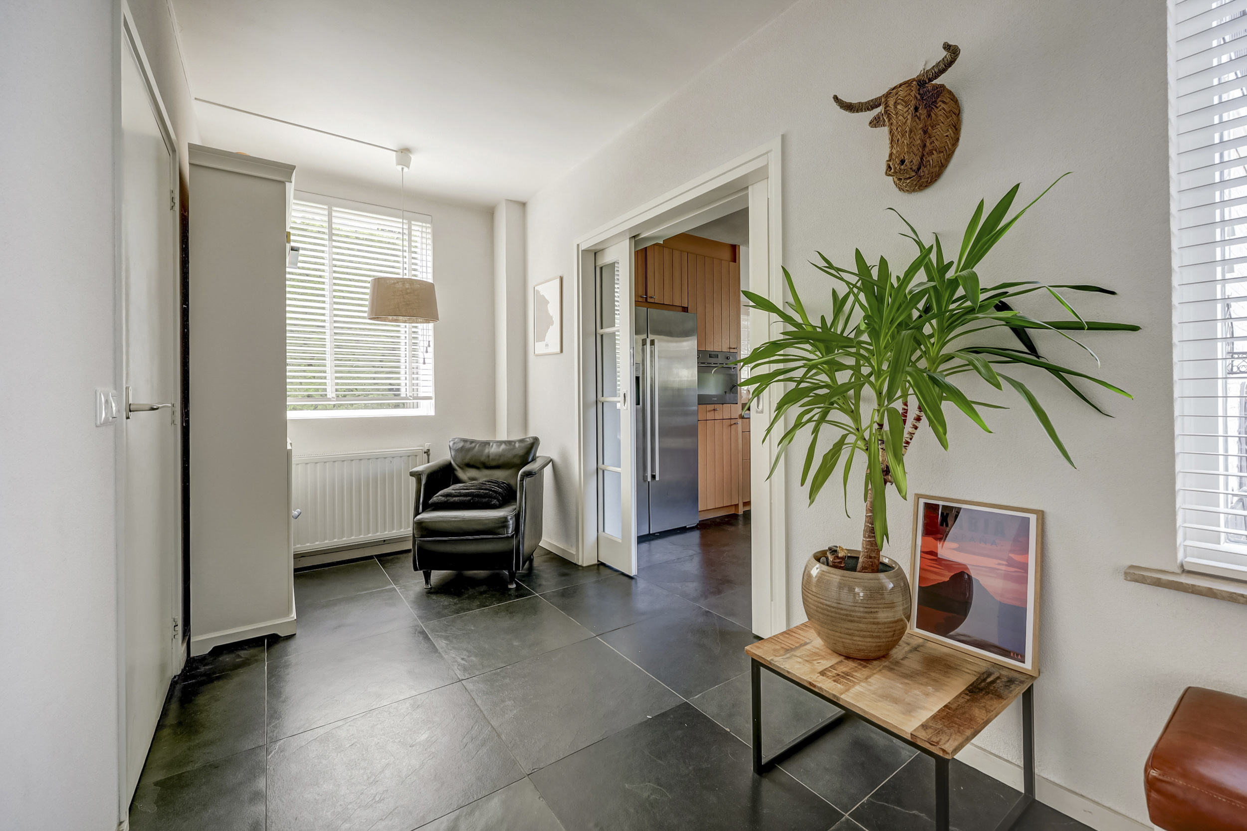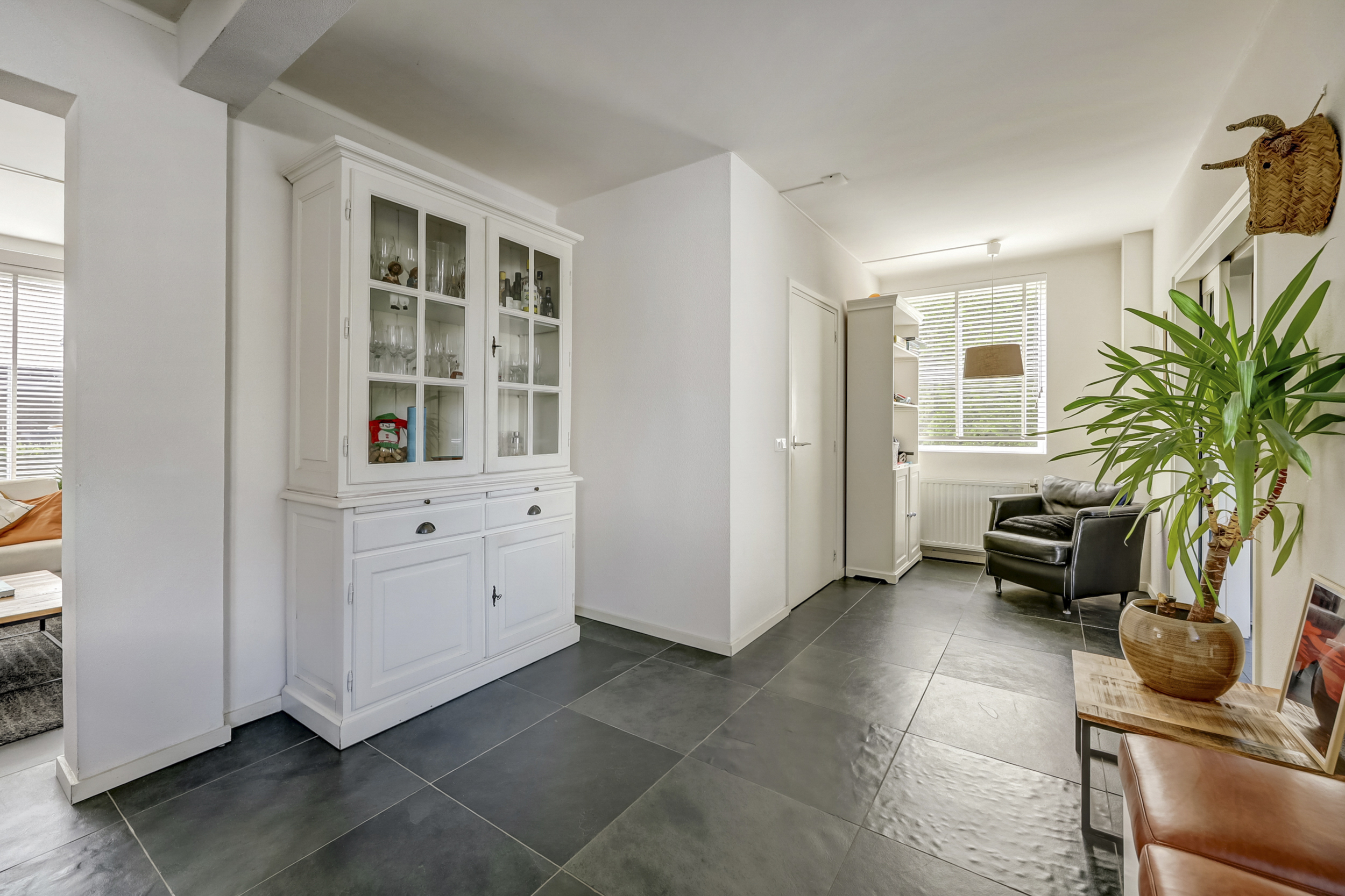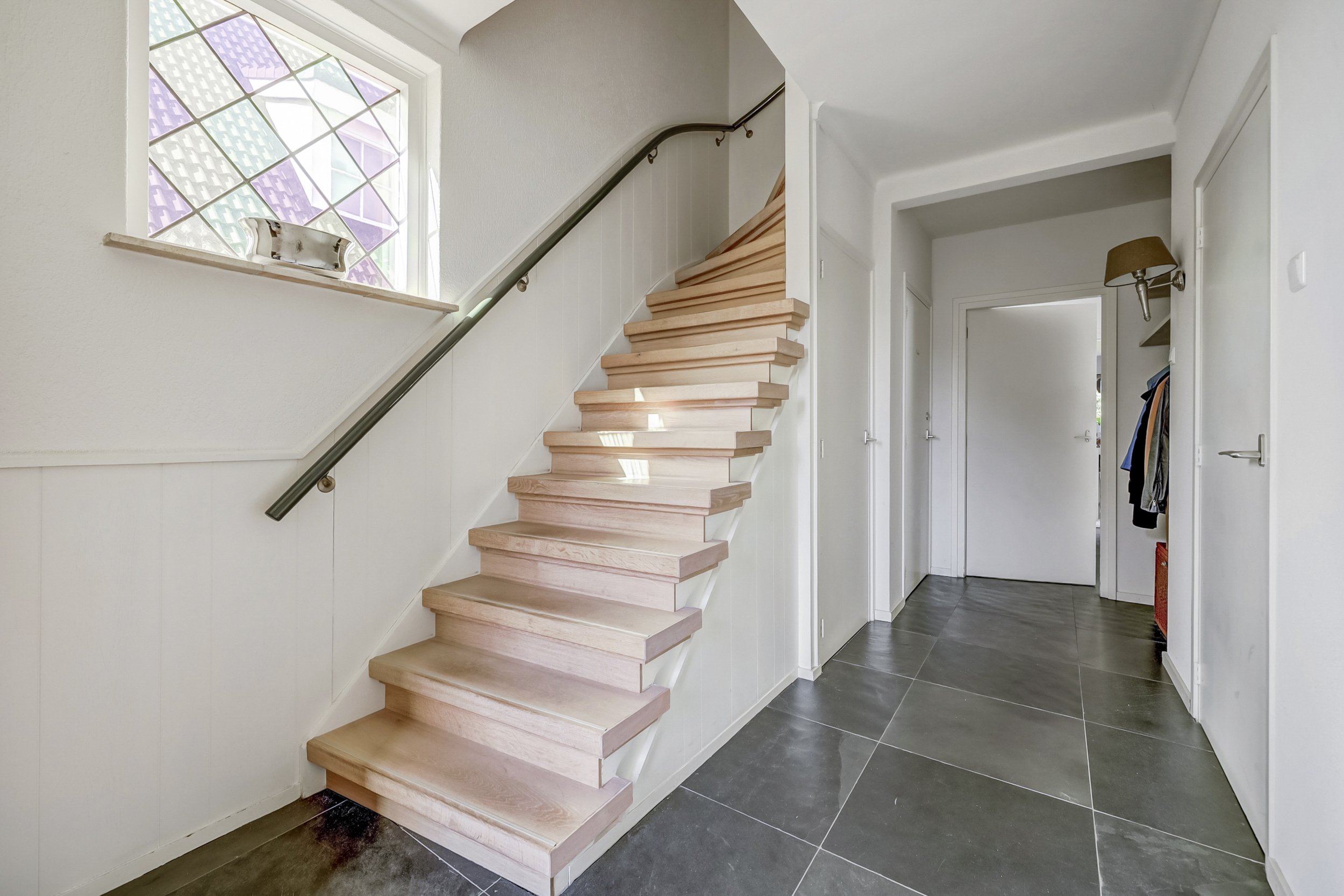 Bij binnenkomst in de ruime entree vindt u de toegang tot zowel de woonkamer als de eetkamer. De entree wordt extra karakter gegeven door sfeervolle glas-in-loodramen die de ruimte een karakteristieke uitstraling geven.