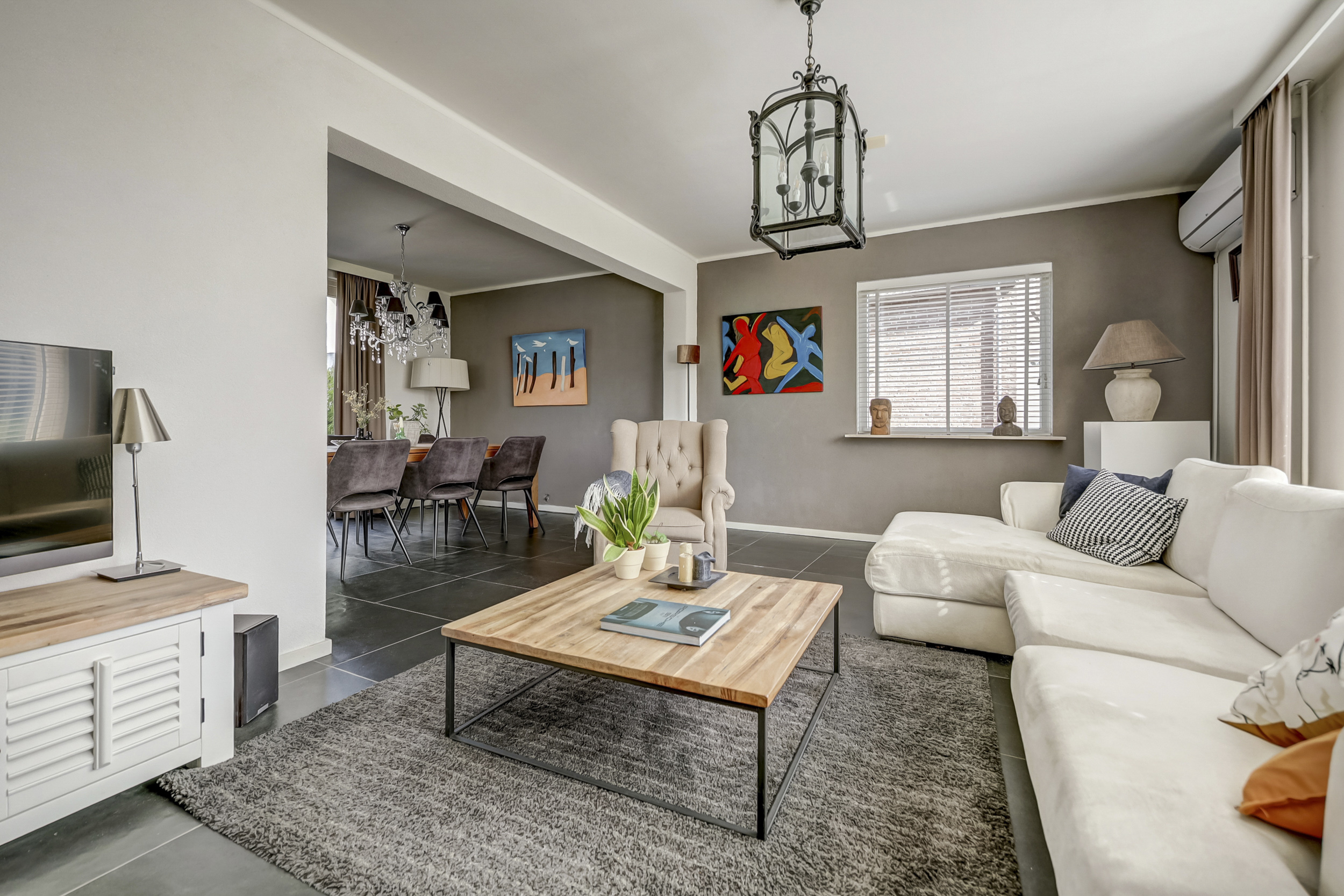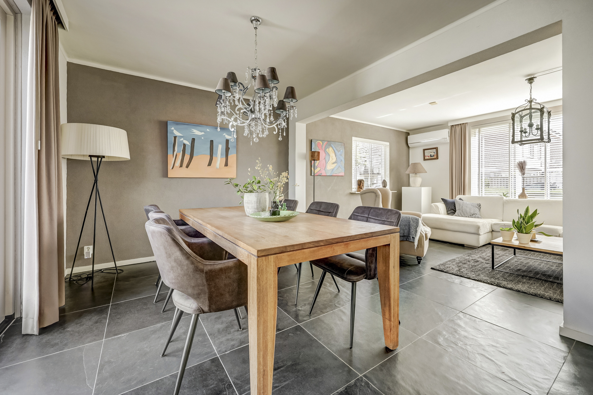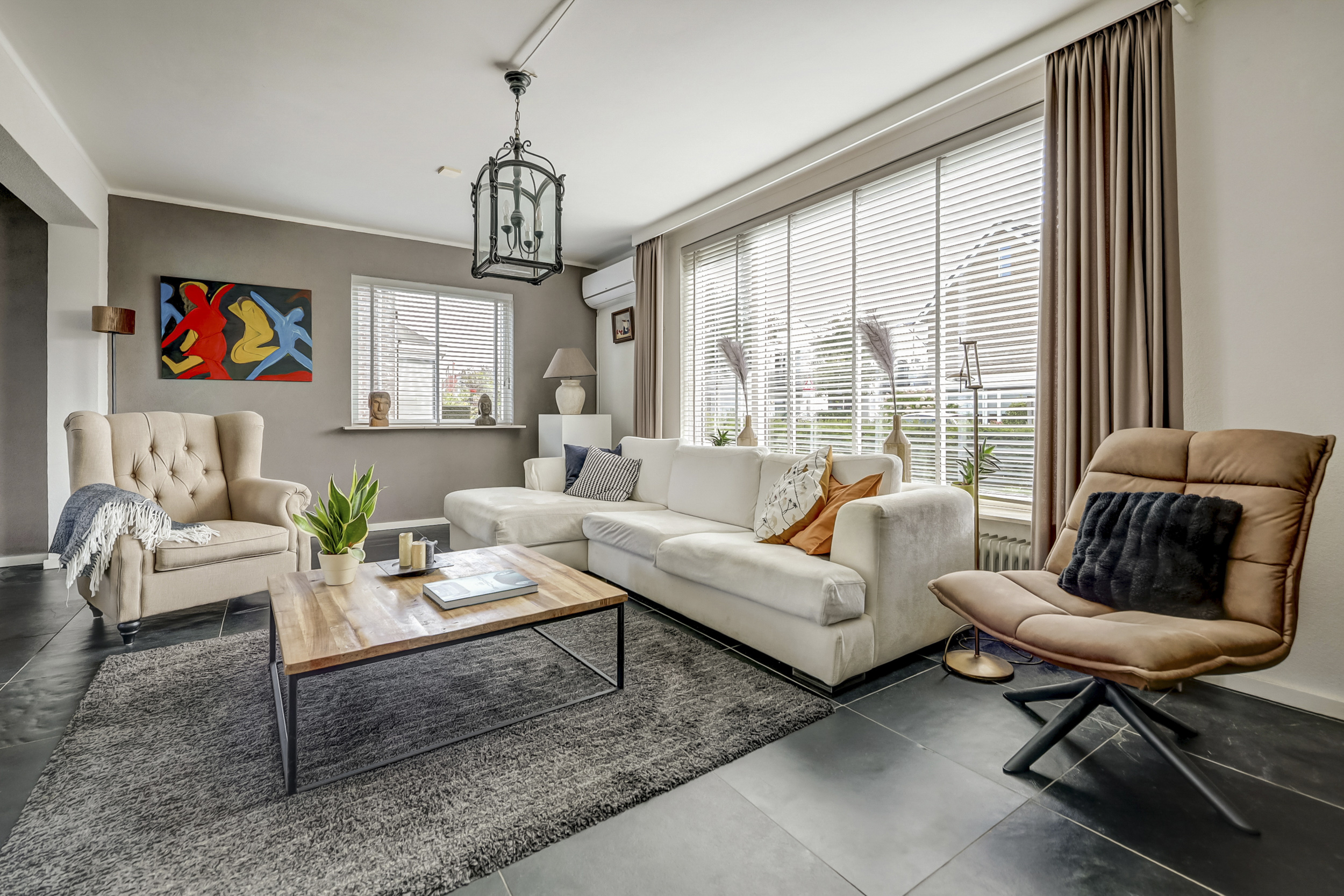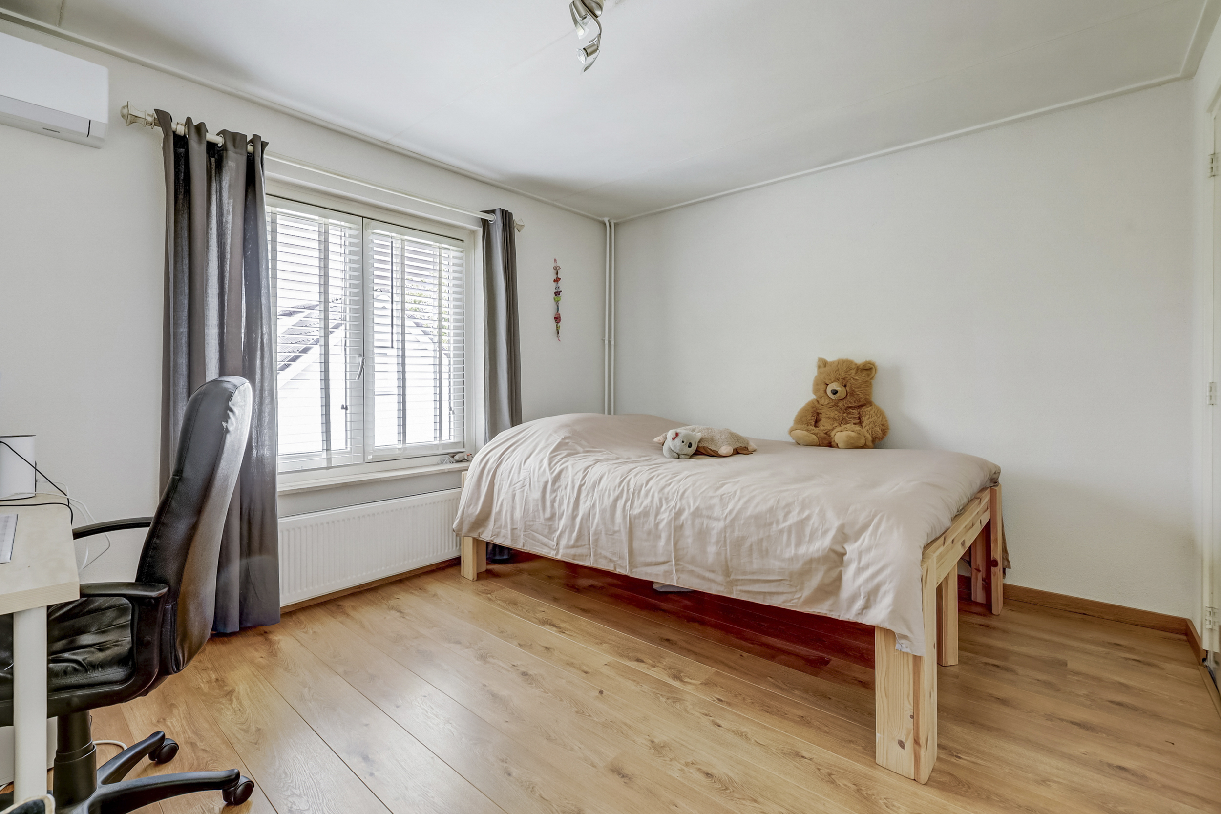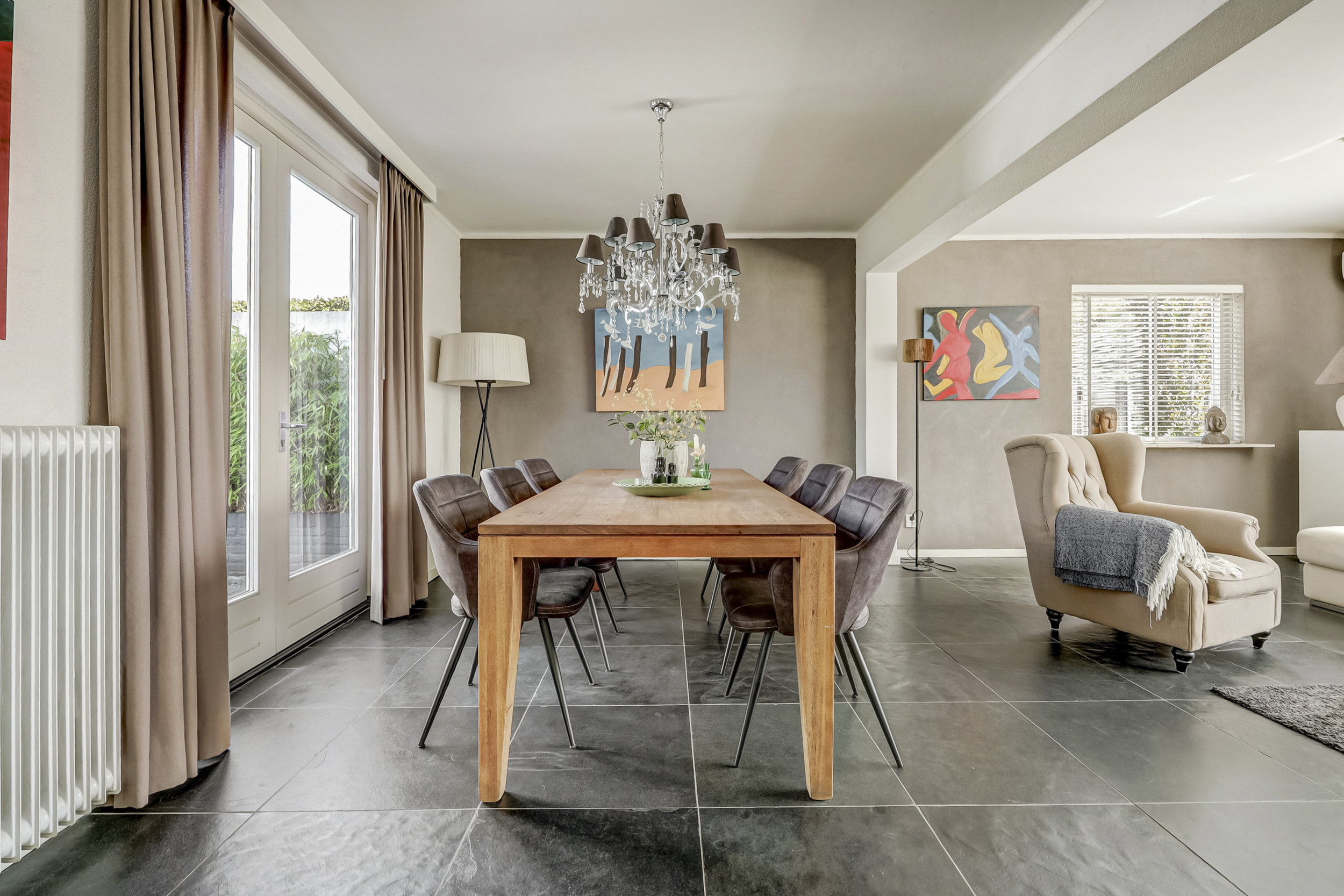 De woonkamer straalt ruimte en licht uit, dankzij de royale raampartijen die voor een prettige daglichtinval zorgen. Hier vindt een grote zithoek gemakkelijk een plek, en de aanwezige airconditioning maakt de ruimte in alle jaargetijen aangenaam. Met voldoende ruimte voor een grote eettafel is deze kamer ideaal voor gezellige momenten met familie en vrienden. Dankzij de directe doorgang naar de tuin ontstaat een prettige verbinding tussen binnen en buiten, en ook een extra zithoek of kastruimte kan hier eenvoudig worden ingericht.