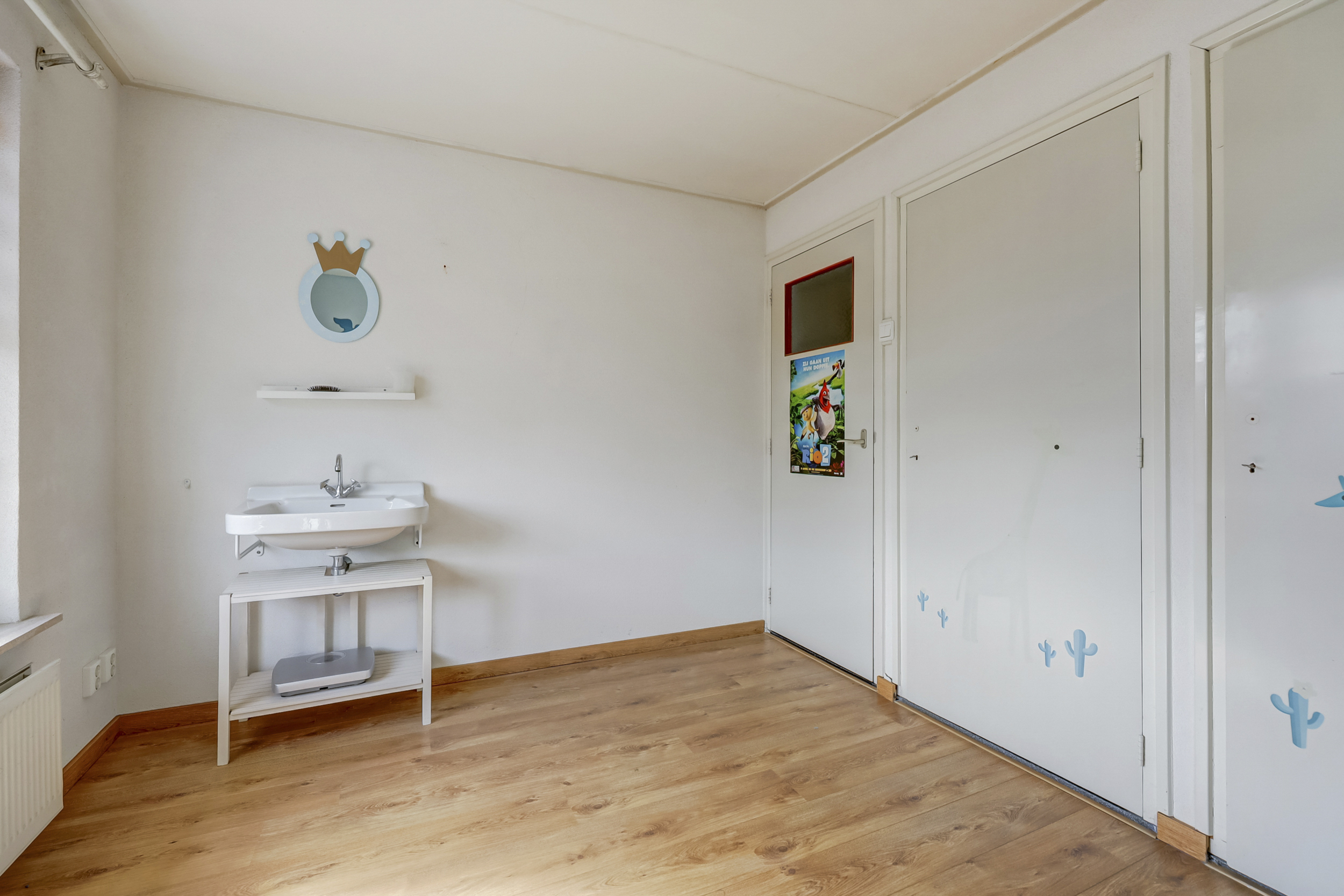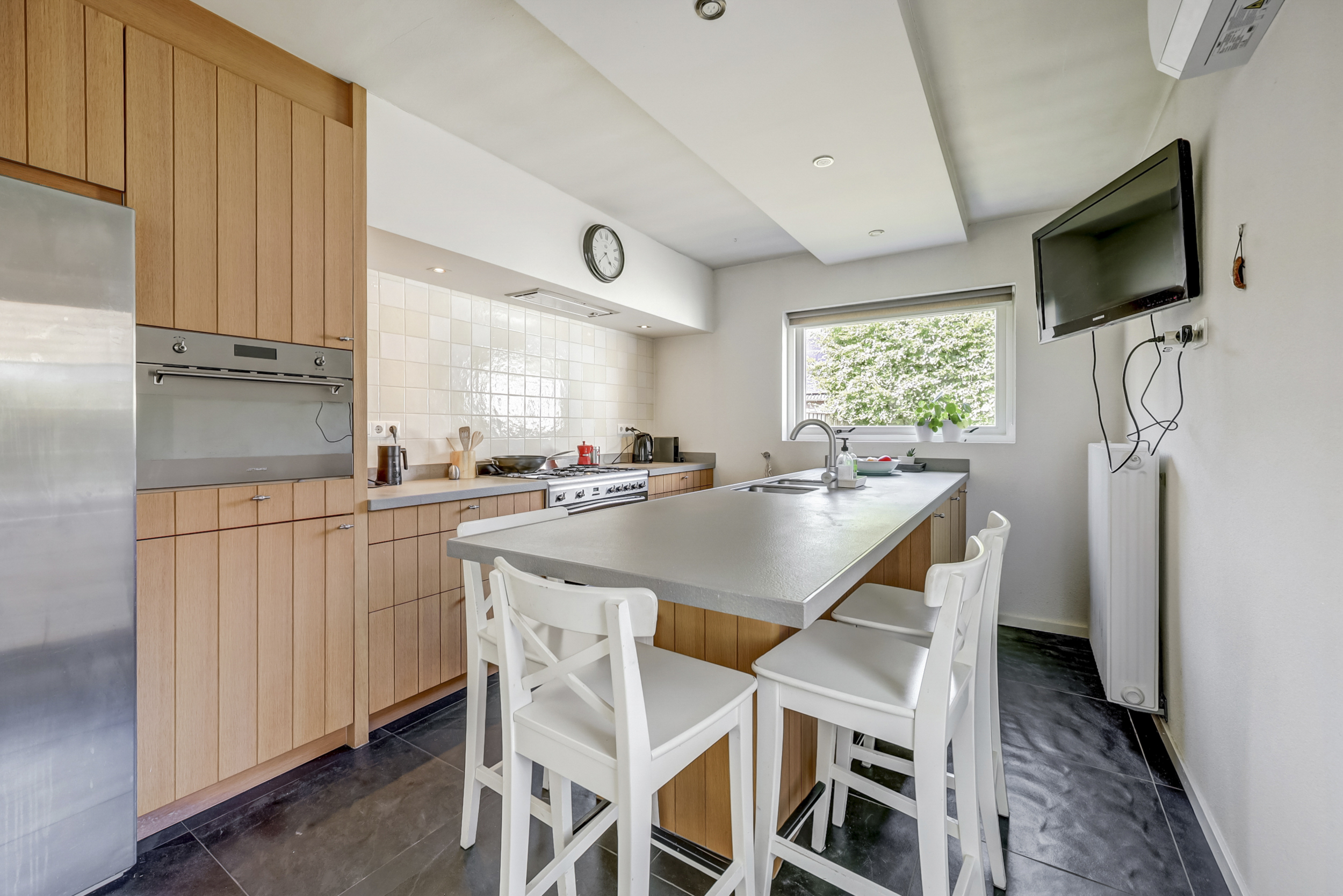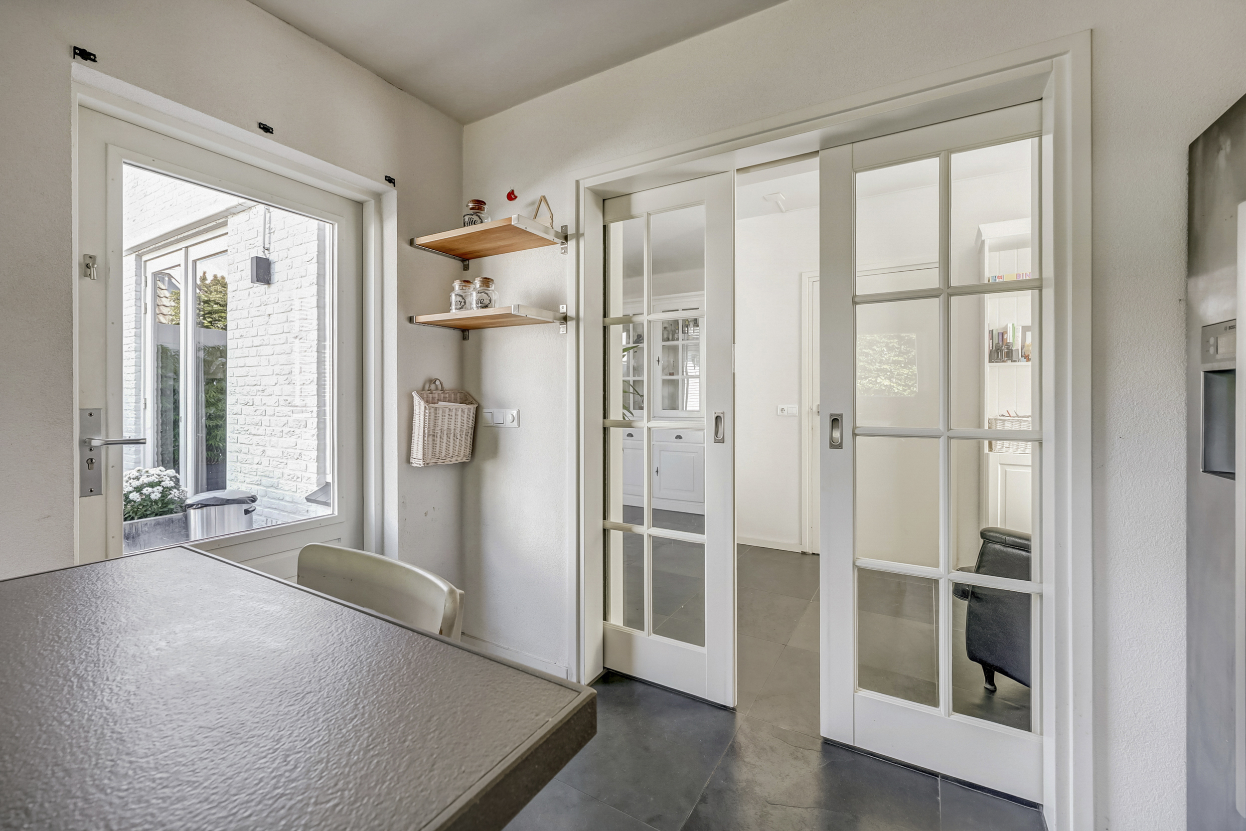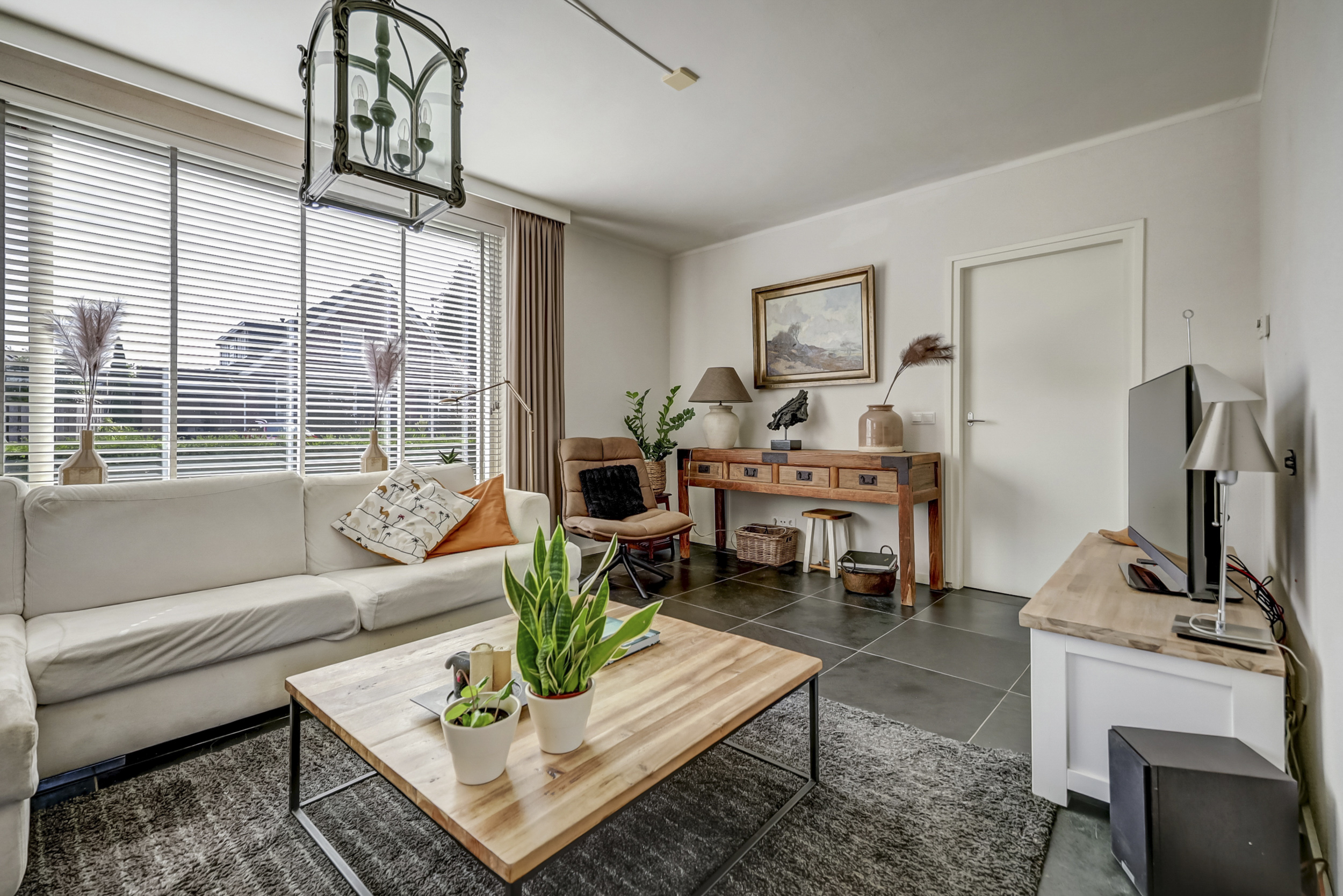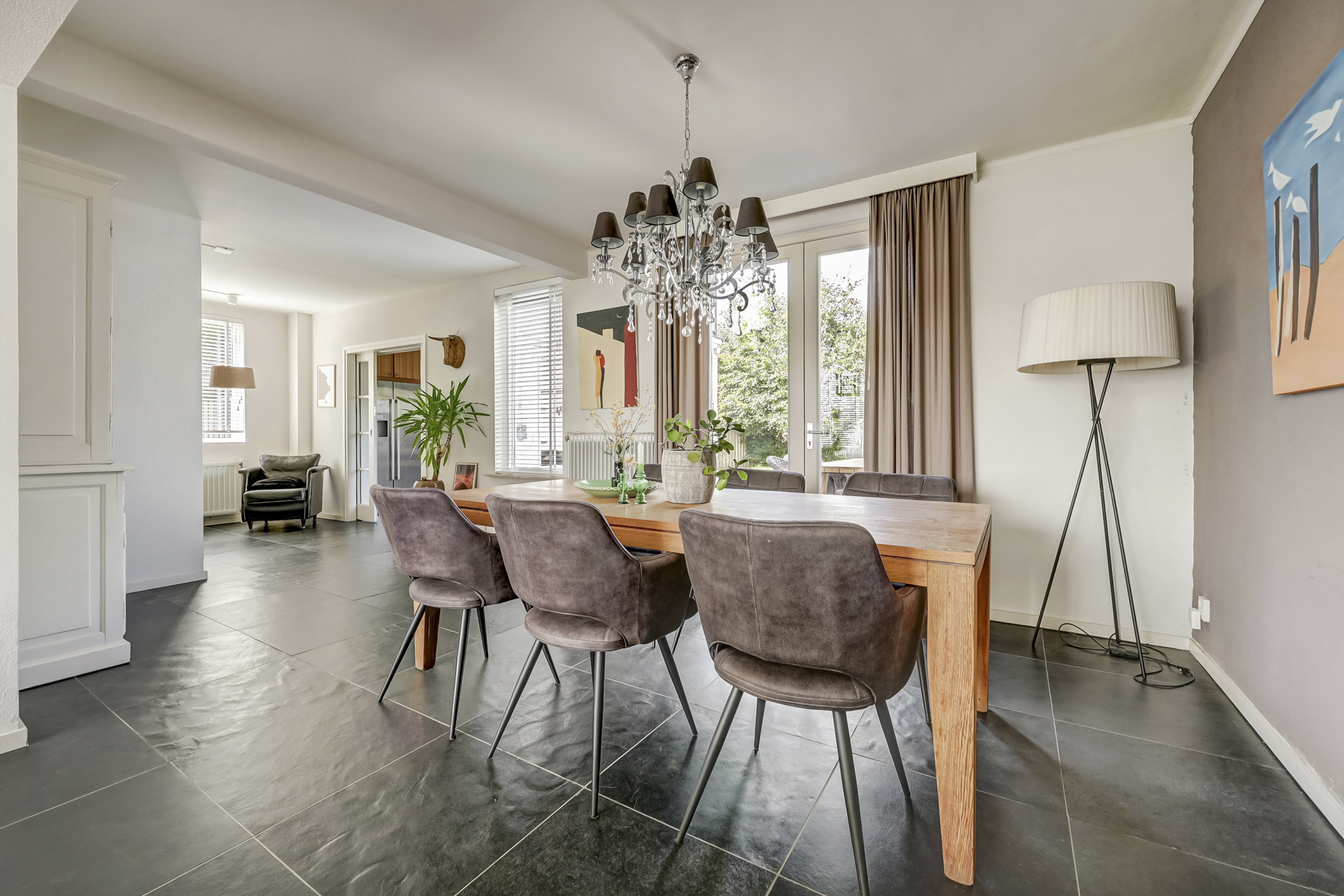 De woonkamer straalt ruimte en licht uit, dankzij de royale raampartijen die voor een prettige daglichtinval zorgen. Hier vindt een grote zithoek gemakkelijk een plek, en de aanwezige airconditioning maakt de ruimte in alle jaargetijen aangenaam. Met voldoende ruimte voor een grote eettafel is deze kamer ideaal voor gezellige momenten met familie en vrienden. Dankzij de directe doorgang naar de tuin ontstaat een prettige verbinding tussen binnen en buiten, en ook een extra zithoek of kastruimte kan hier eenvoudig worden ingericht.