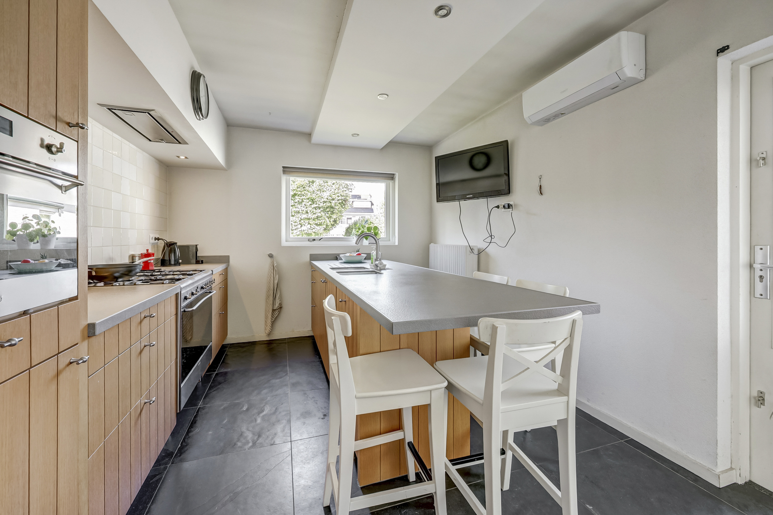 Via elegante en-suite deuren komt u in de half-open keuken, uitgevoerd in een warme houten look met een royaal spoeleiland inclusief een gezellig barretje. Het eiland biedt dus niet alleen extra werk- en kastruimte, maar ook een gezellige plek voor een kop koffie of een snelle hap. De keuken is volledig uitgerust met ingebouwde apparatuur, waaronder een oven, gasfornuis, afzuigkap en een spoelgedeelte. Ook hier is airconditioning aanwezig, waardoor dit leefgedeelte het hele jaar door prettig te gebruiken is. Om extra sfeer toe te voegen aan deze ruimte, is er gebruik gemaakt van inbouwspots in het plafond. Tot slot is er vanuit de keuken een deur die directe toegang tot de buitenruimte biedt.