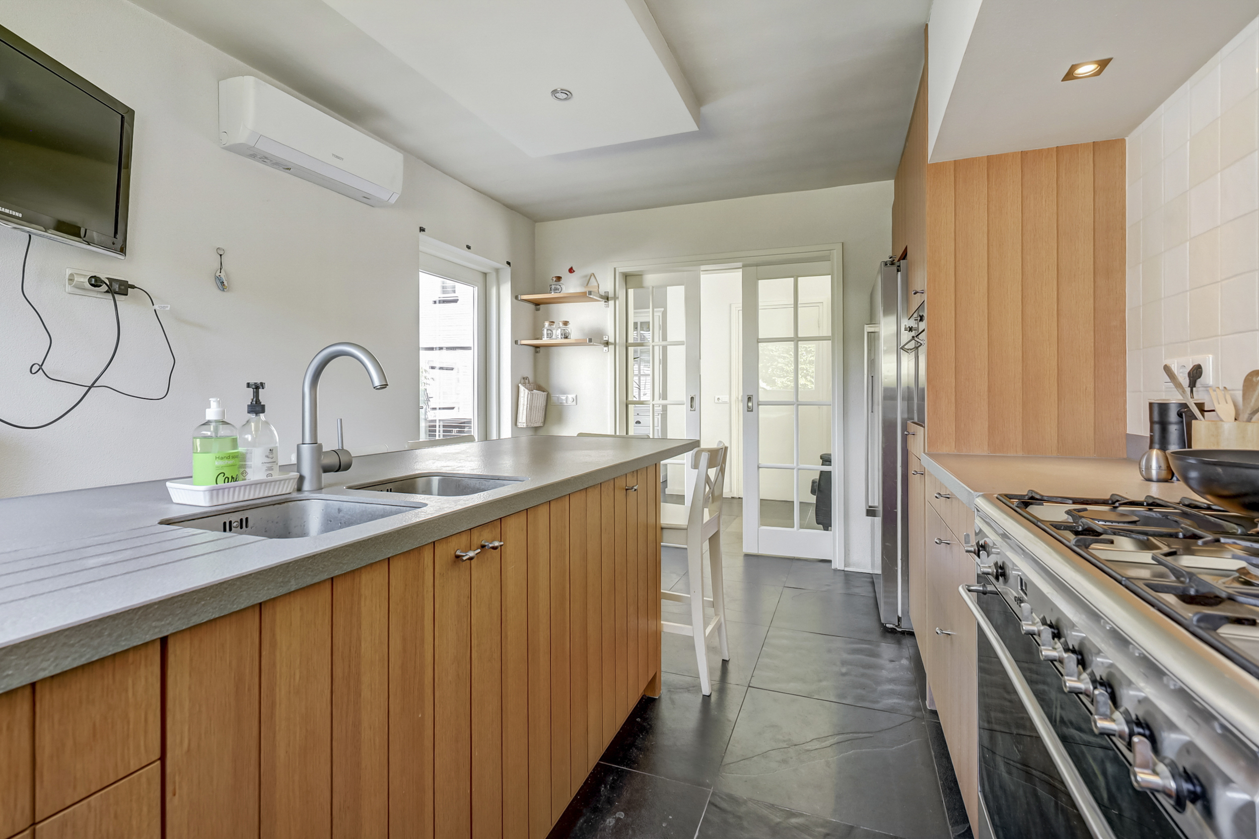 - Moderne keuken met een sfeervol spoeleiland en en-suite deuren;
