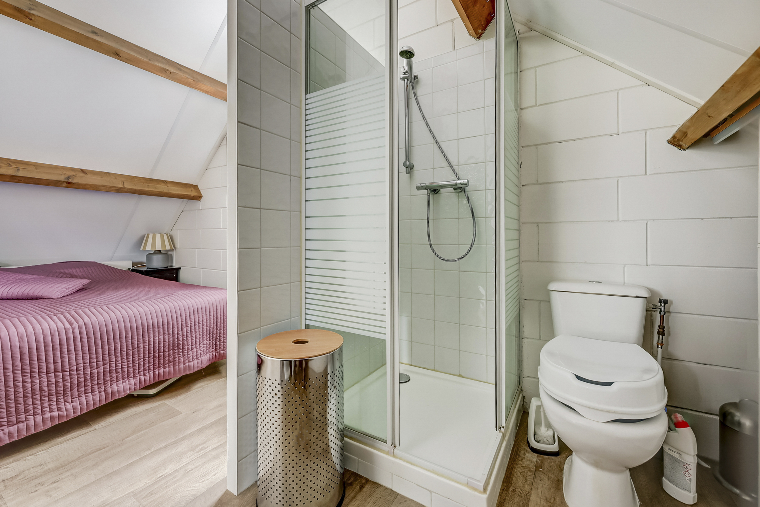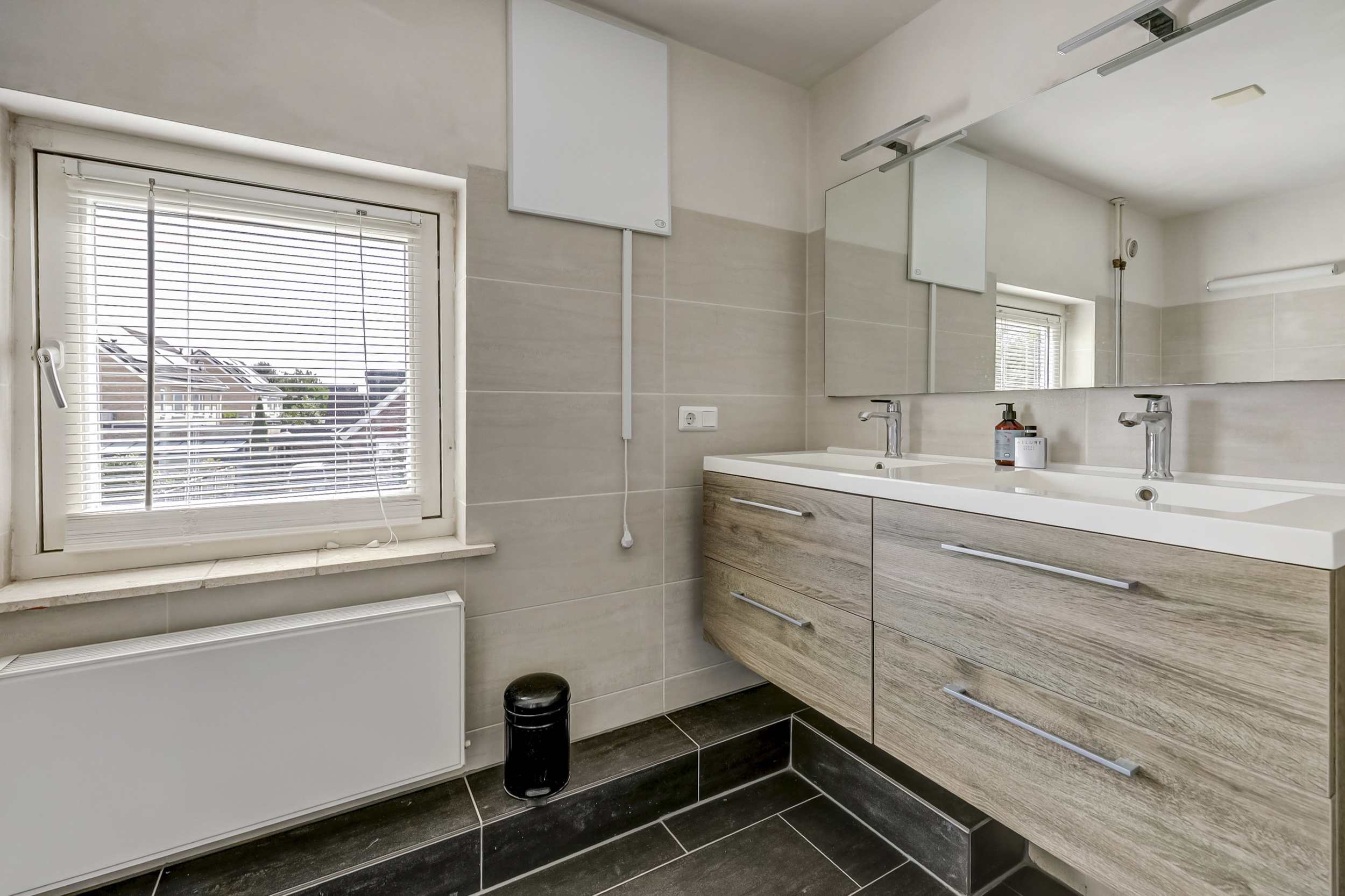 De badkamer is modern en volledig uitgerust met een dubbele wastafel met meubel, een ruime inloopdouche en een toilet. Dankzij de dakramen wordt ook deze ruimte voldoende voorzien van natuurlijk daglicht en kan er extra natuurlijke worden geventileerd tijdens bijvoorbeeld het douchen.