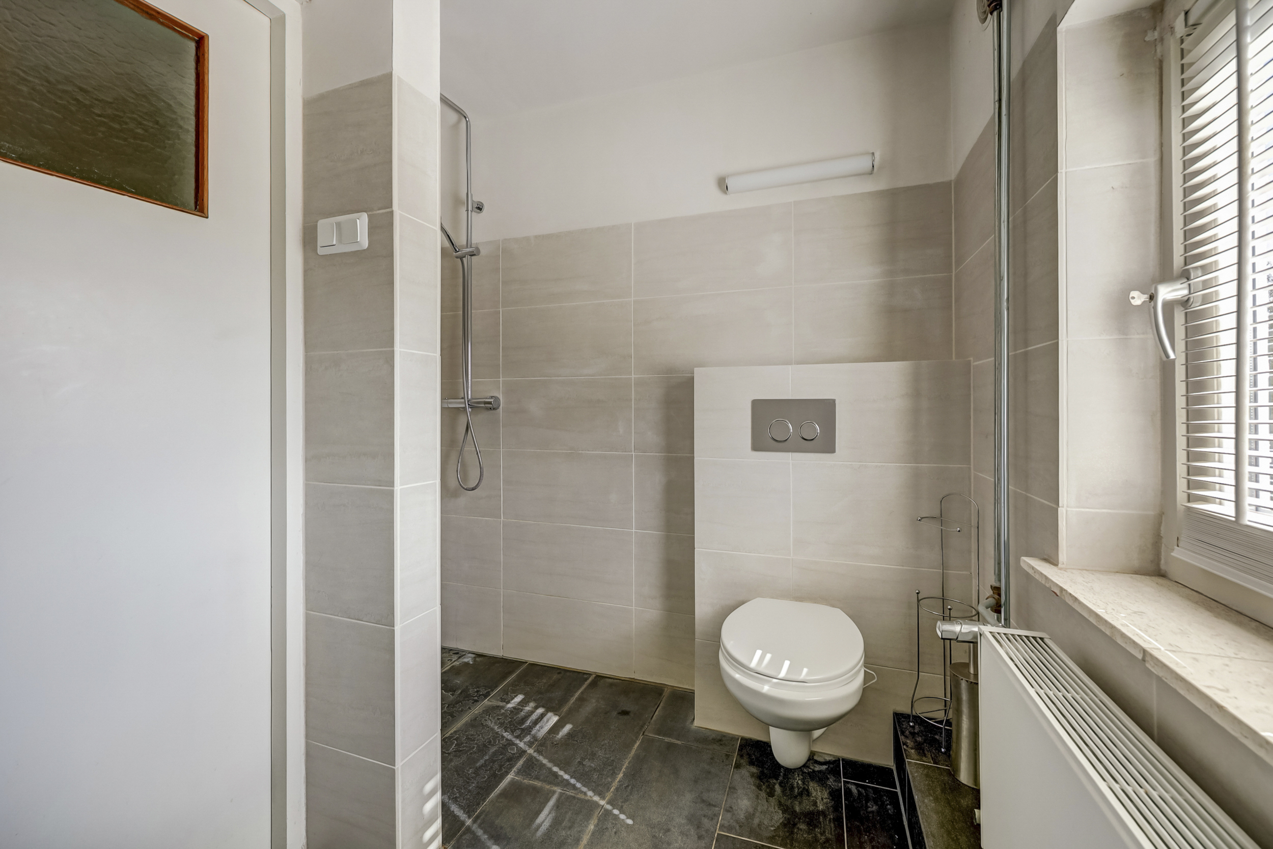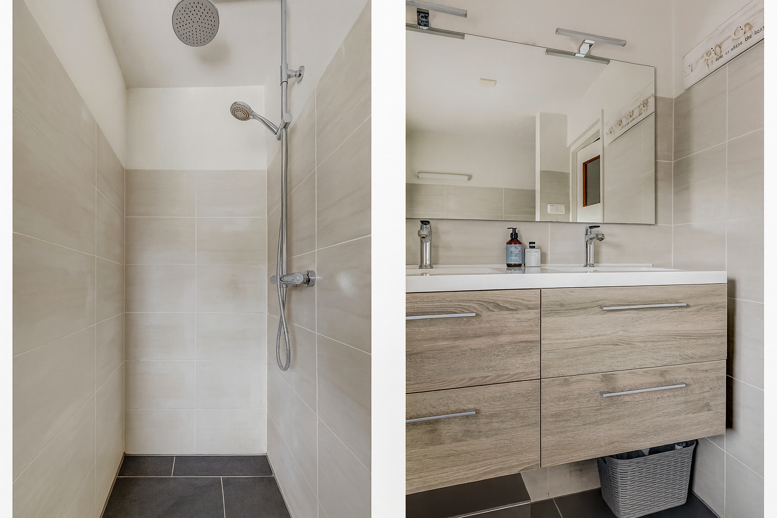 - Toilet, dubbele wastafel, wastafelmeubel, inloopdouche, douche en wastafel