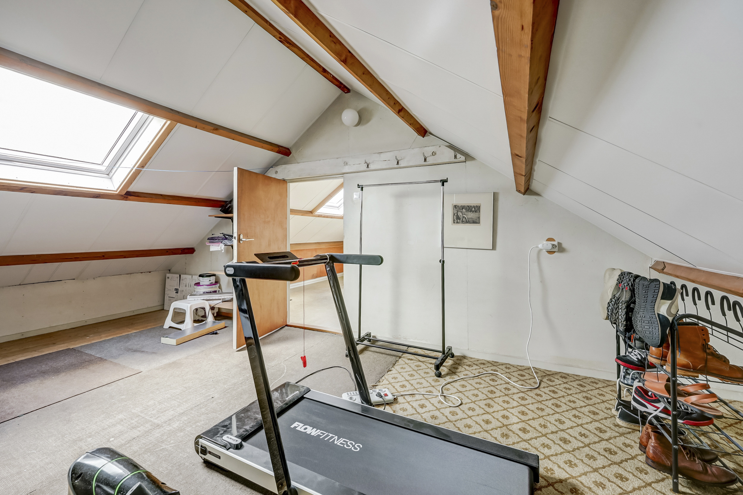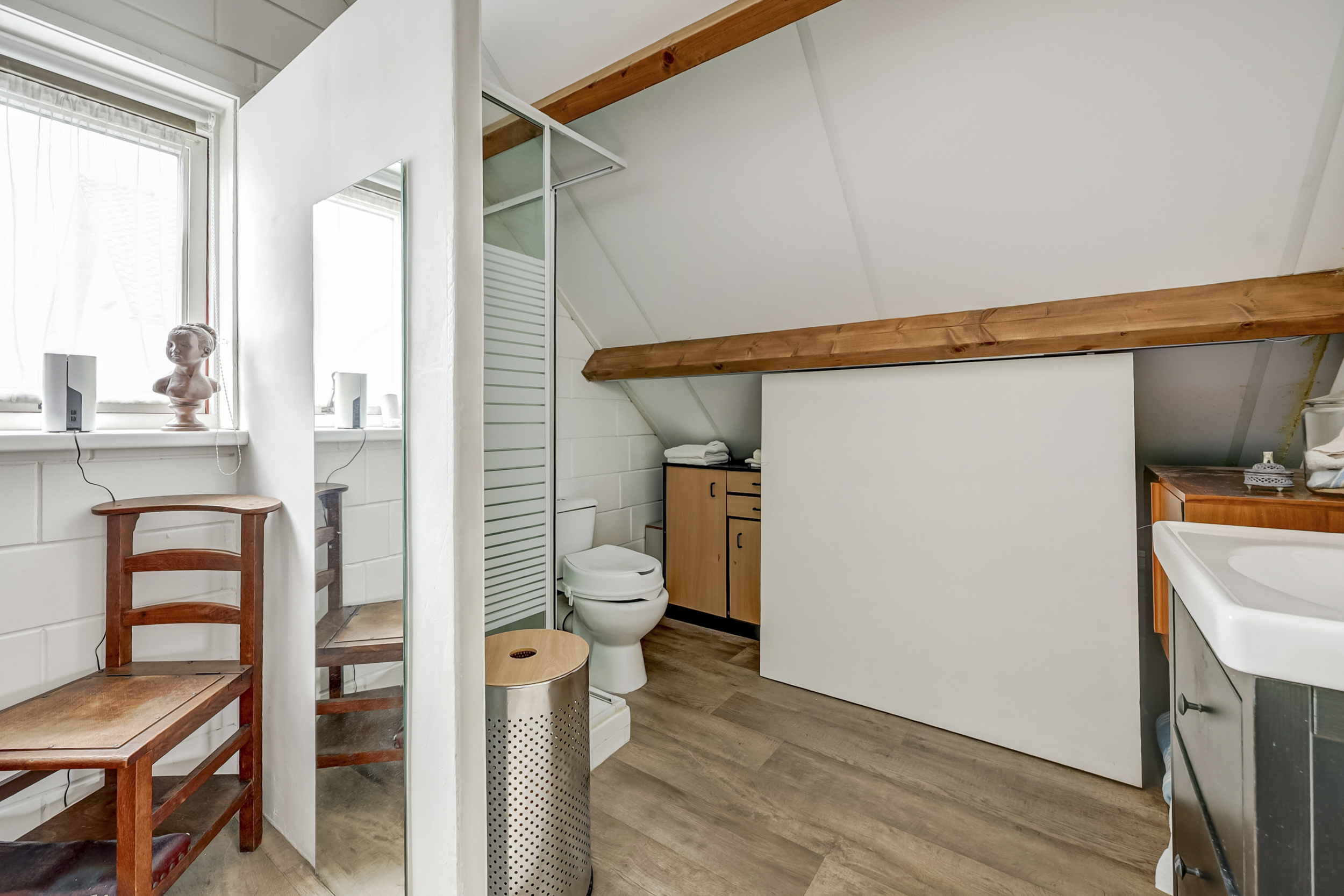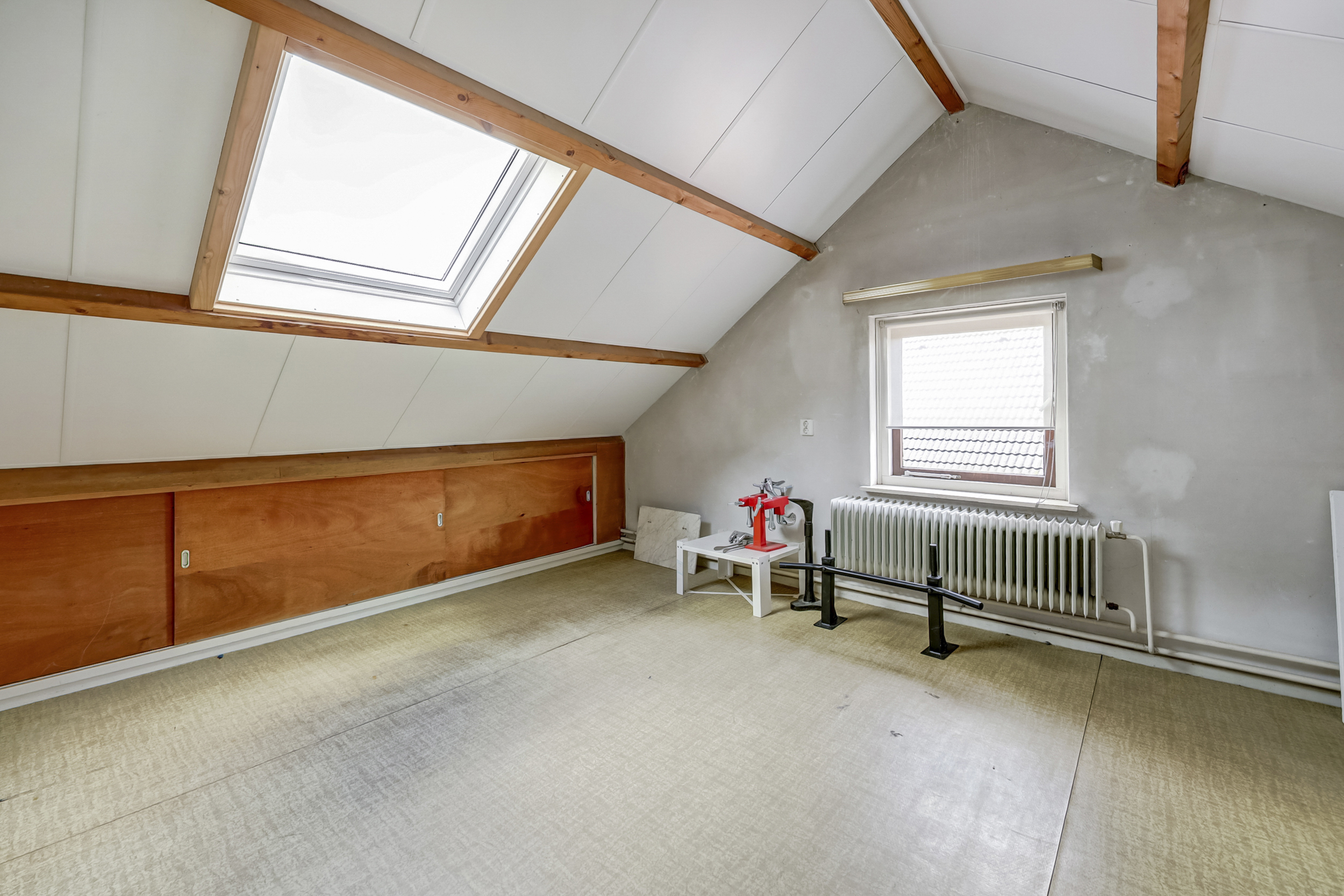 De volwaardige tweede verdieping biedt een ruime zolder, bereikbaar via een vaste trap. Deze zolder is in tweeën gedeeld, met een ruime overloop en een kamer. Op de overloop vindt u de cv-installatie uit 2010, de wasmachineaansluiting en twee dakramen, die zorgen voor extra lichtinval. De kamer op deze verdieping is flexibel in te delen en kan bijvoorbeeld dienen als extra slaapkamer, hobbyruimte of berging.