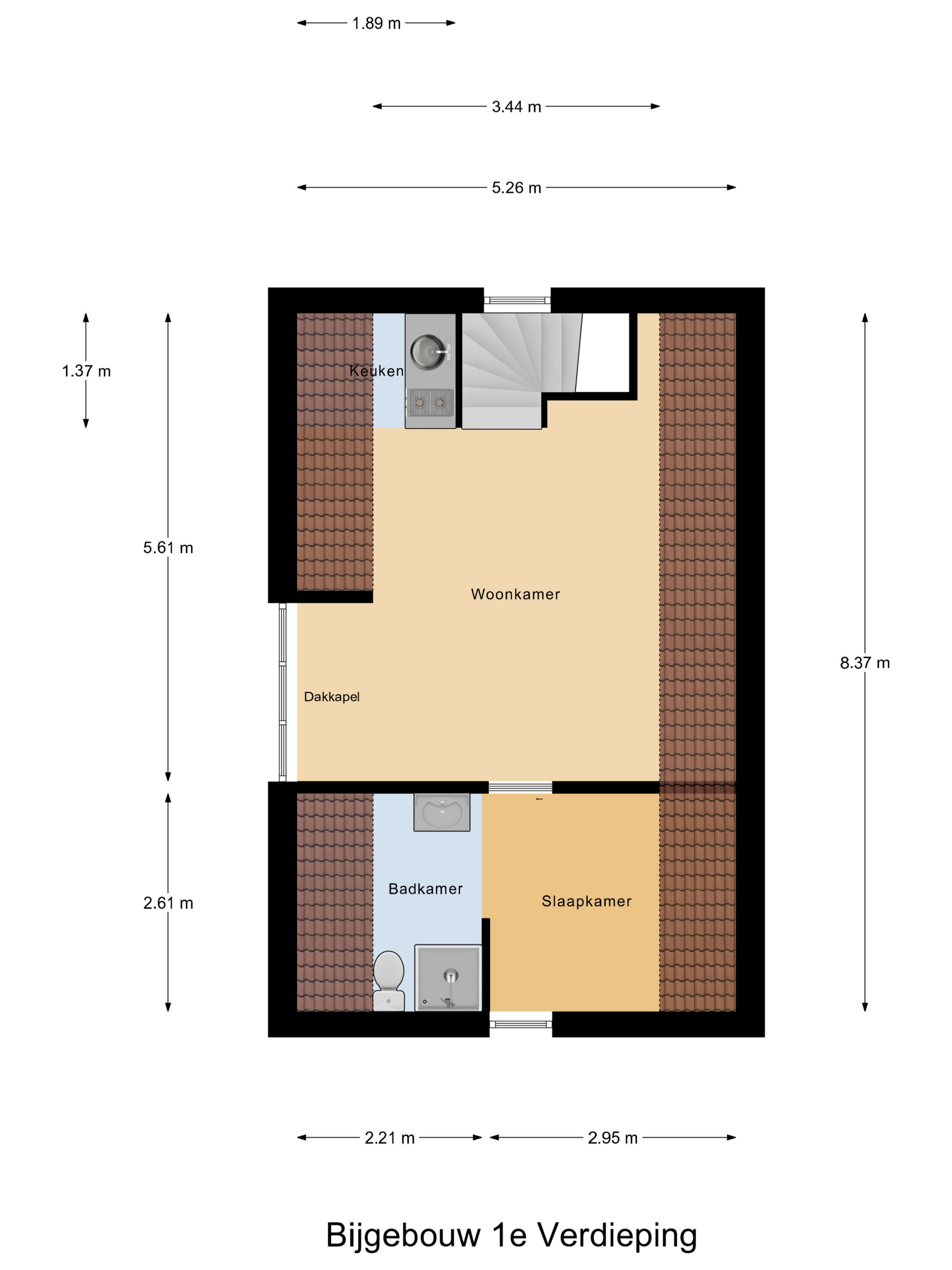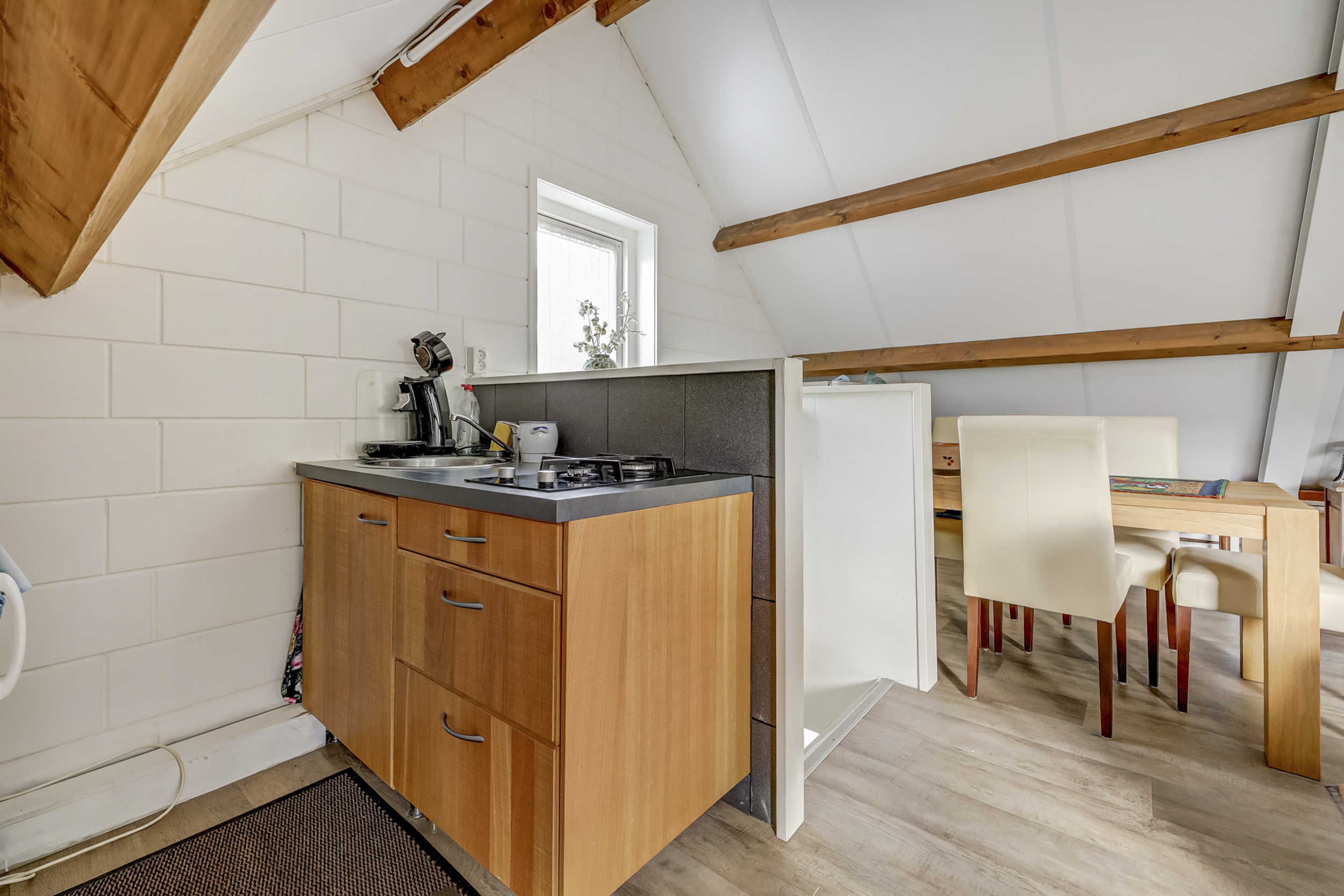 De eerste verdieping van het bijgebouw vormt een complete woonetage, met een woonkamer, keukenopstelling, badkamer en slaapkamer. Dankzij de ruime indeling en eigen voorzieningen is deze verdieping ideaal voor diverse toepassingen, zoals extra woonruimte voor kinderen/gasten of een zelfstandige werkplek.