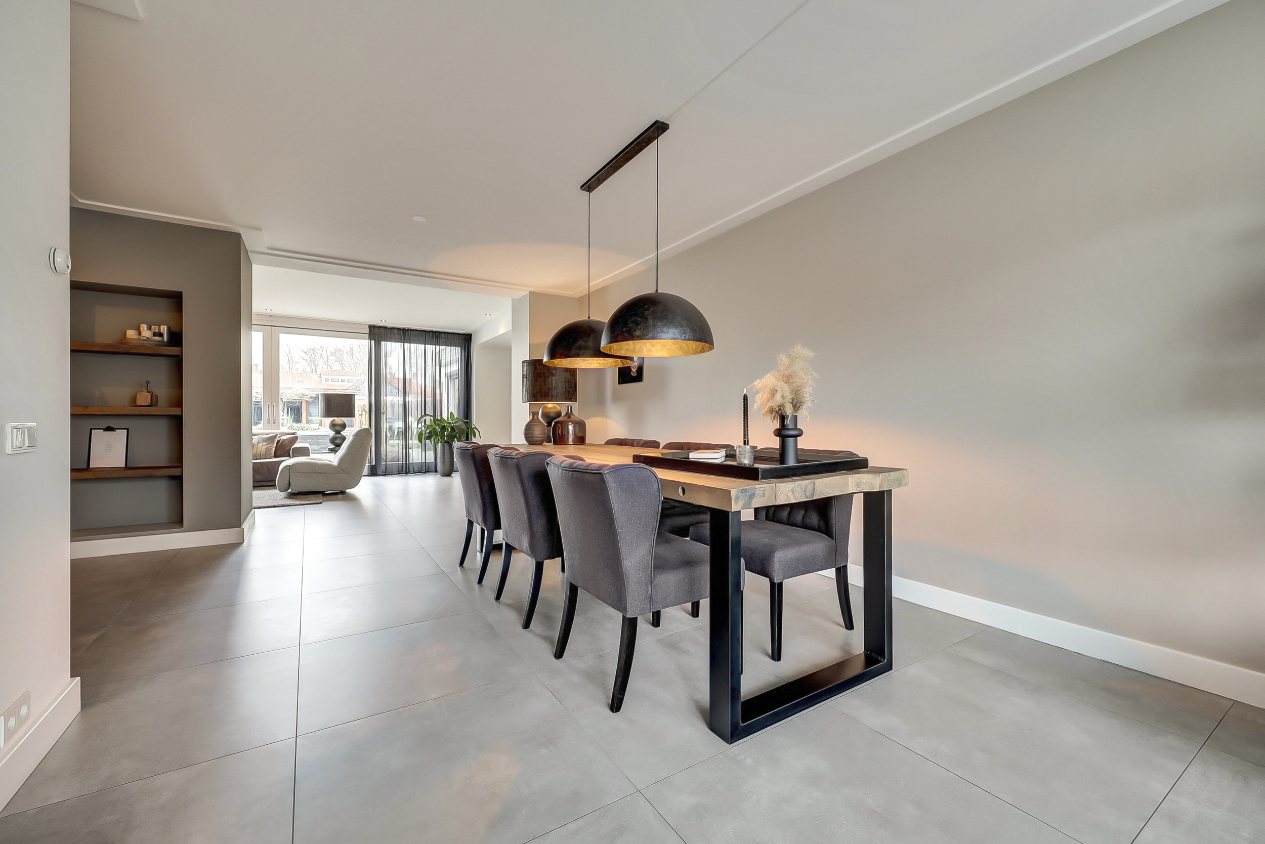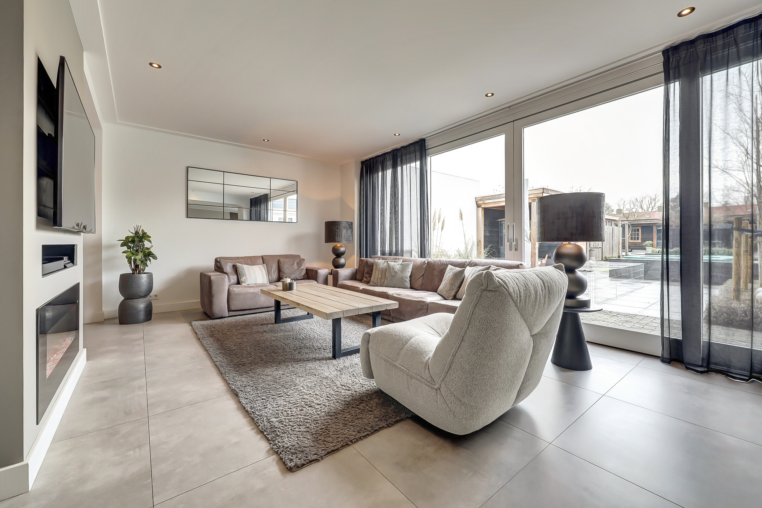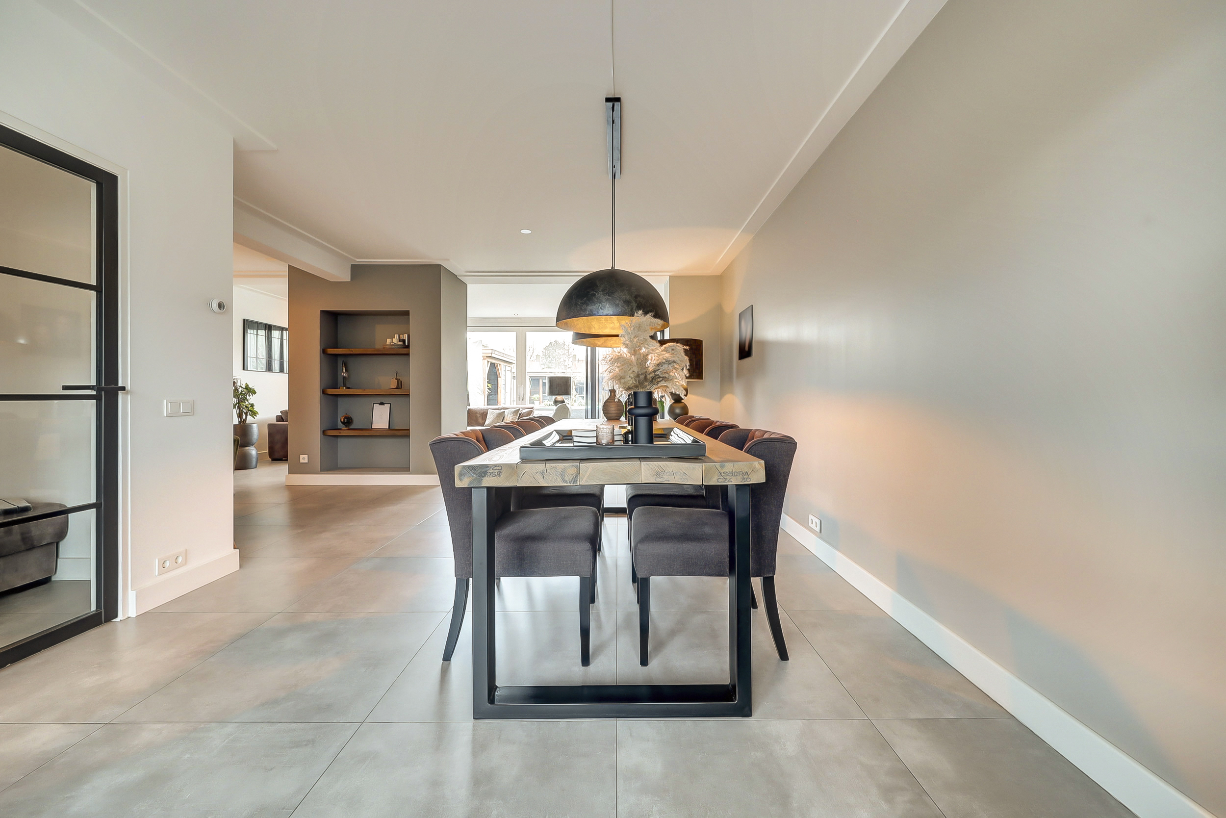 Via de eigen oprit bereikt u de entree van de woning. In de hal bevinden zich de trapopgang naar de eerste verdieping, een praktische voorraadkast en de moderne toiletruimte. Deze is luxe uitgevoerd met een hangcloset én een urinoir, een stijlvolle en praktische toevoeging. De woonkamer is door de uitbouw aan de achterzijde uitzonderlijk ruim opgezet. Aan de voorzijde bevindt zich het royale eetgedeelte met ruimte voor een grote eettafel. Aansluitend is er een extra zithoek gecreëerd, ideaal als leeshoek, speelhoek of werkplek. Centraal in de ruimte bevindt zich de moderne haard, die op elegante wijze een natuurlijke afscheiding vormt tussen het eetgedeelte en het royale zitgedeelte aan de achterzijde. Bij de schuifpui is het hoofd-zitgedeelte gesitueerd, waar u dankzij de grote glaspartij geniet van een prachtig uitzicht op de diepe tuin.