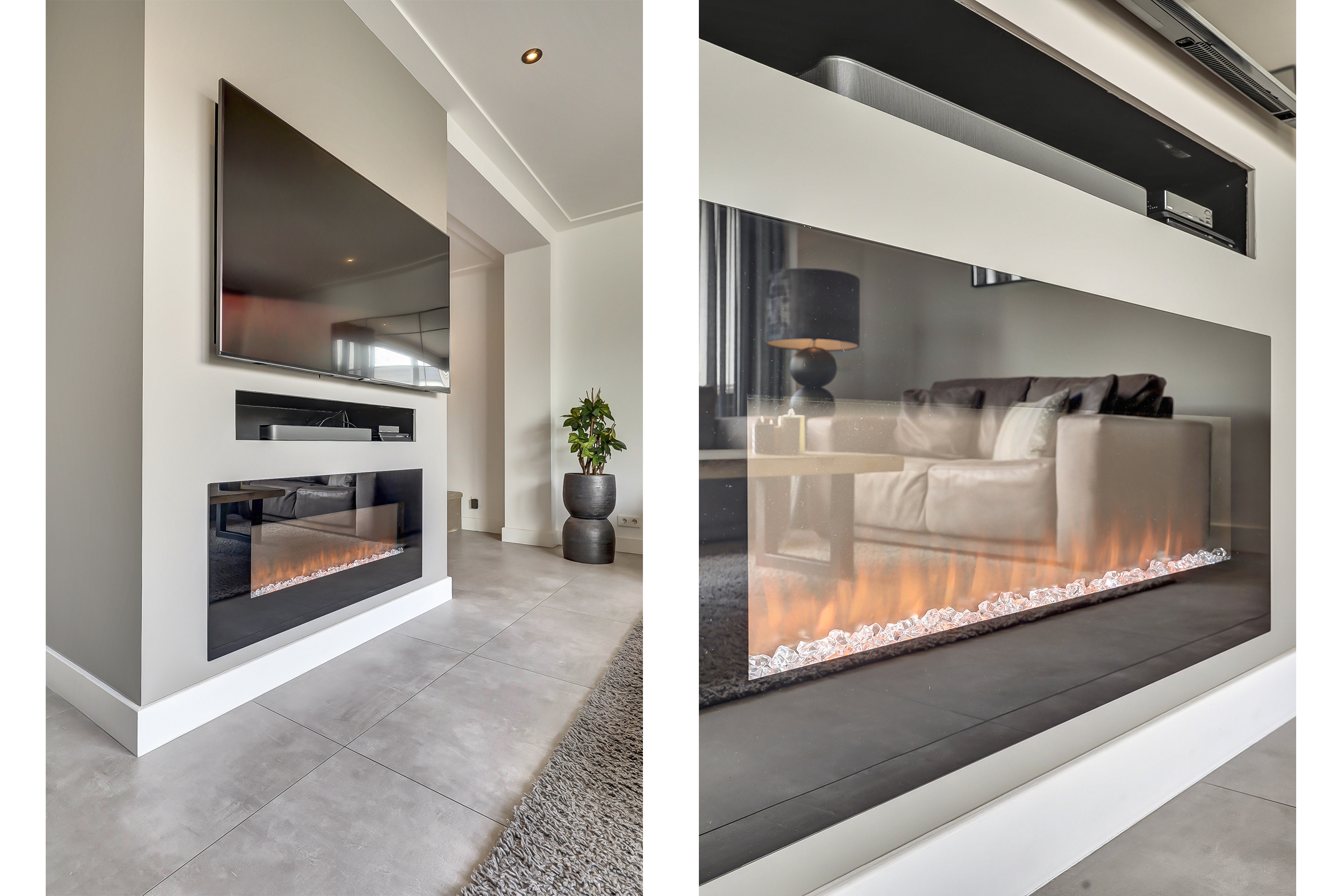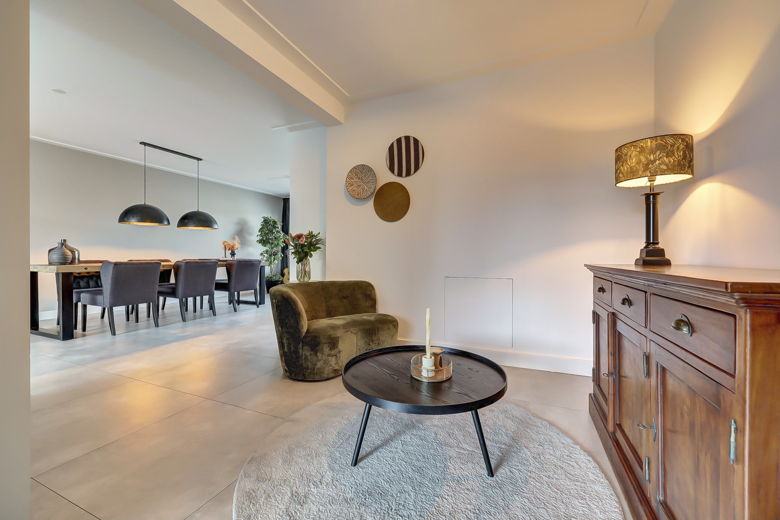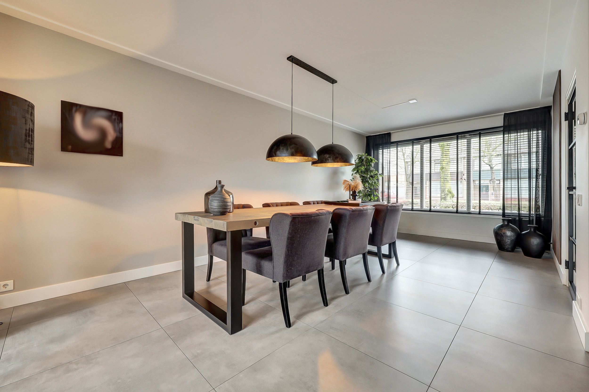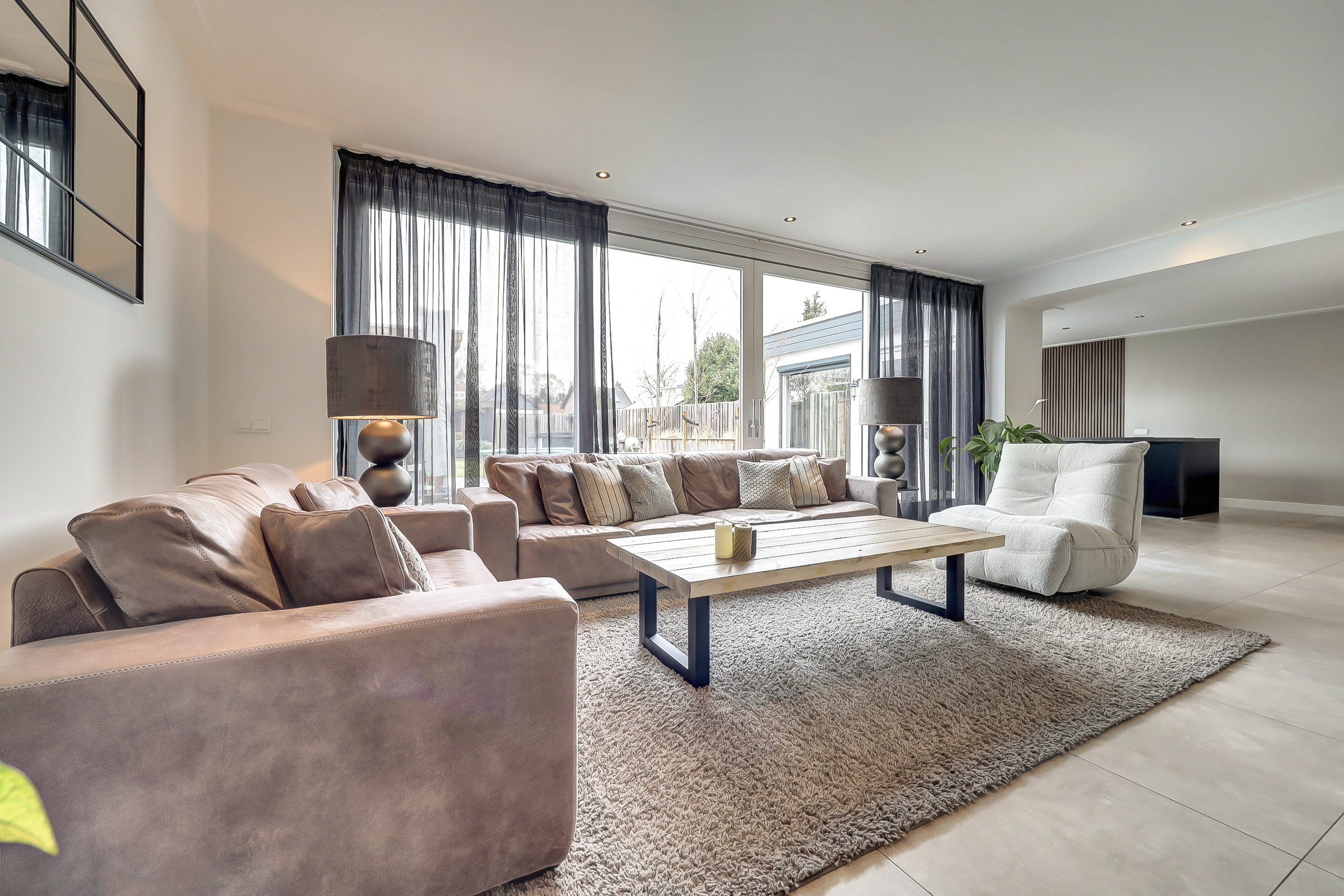 Via de eigen oprit bereikt u de entree van de woning. In de hal bevinden zich de trapopgang naar de eerste verdieping, een praktische voorraadkast en de moderne toiletruimte. Deze is luxe uitgevoerd met een hangcloset én een urinoir, een stijlvolle en praktische toevoeging. De woonkamer is door de uitbouw aan de achterzijde uitzonderlijk ruim opgezet. Aan de voorzijde bevindt zich het royale eetgedeelte met ruimte voor een grote eettafel. Aansluitend is er een extra zithoek gecreëerd, ideaal als leeshoek, speelhoek of werkplek. Centraal in de ruimte bevindt zich de moderne haard, die op elegante wijze een natuurlijke afscheiding vormt tussen het eetgedeelte en het royale zitgedeelte aan de achterzijde. Bij de schuifpui is het hoofd-zitgedeelte gesitueerd, waar u dankzij de grote glaspartij geniet van een prachtig uitzicht op de diepe tuin.