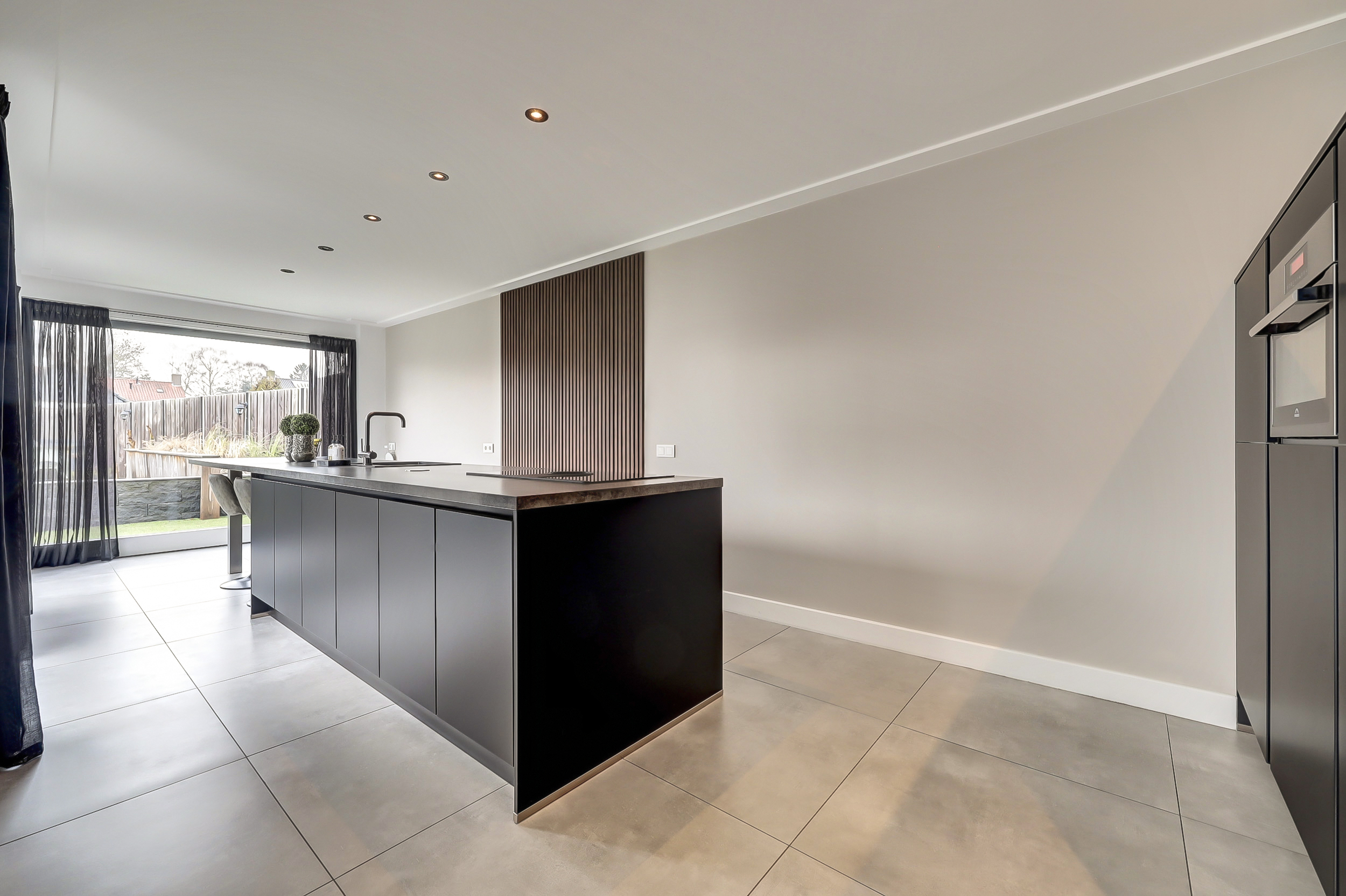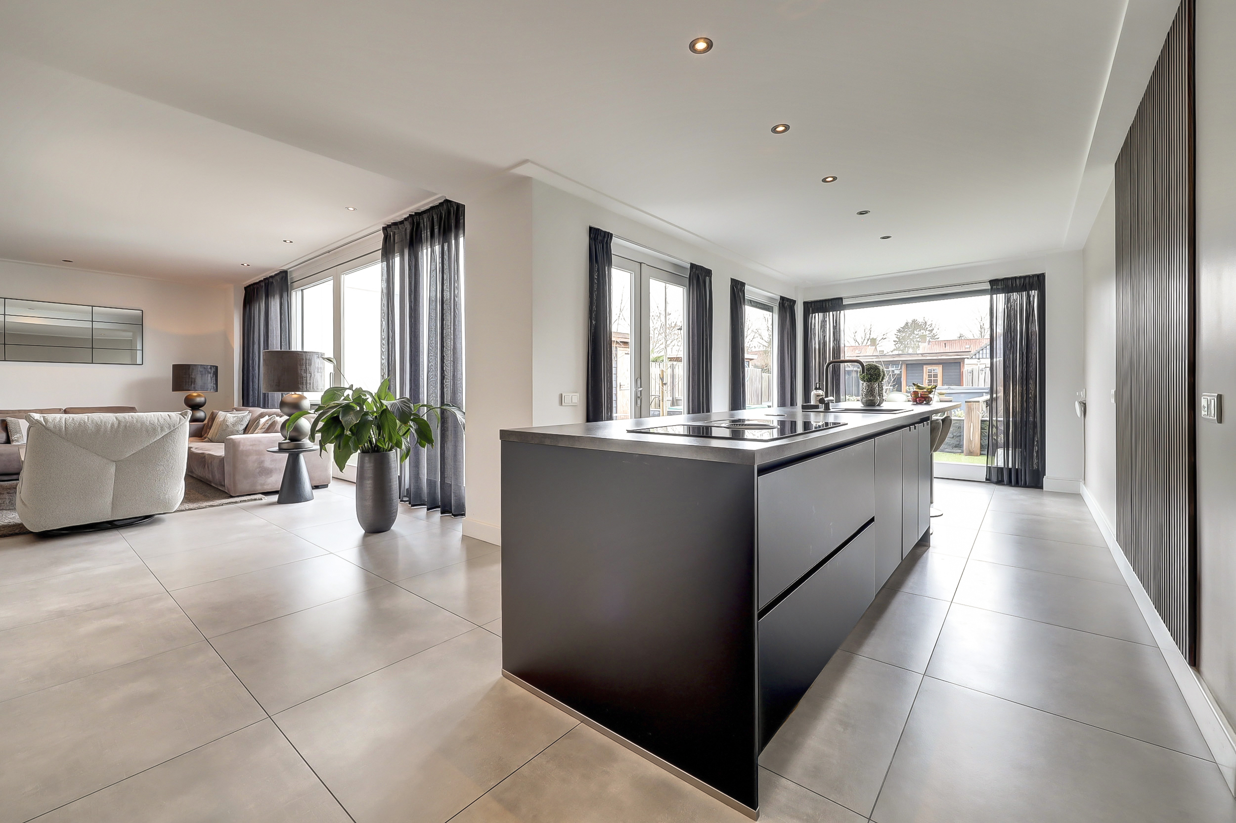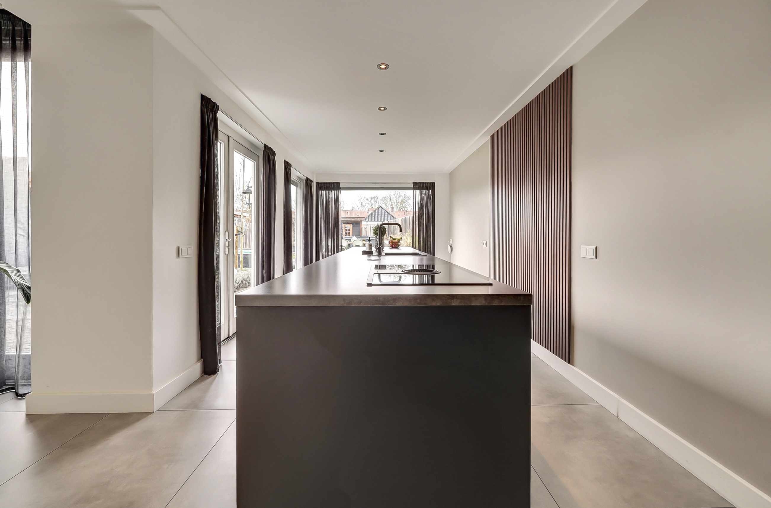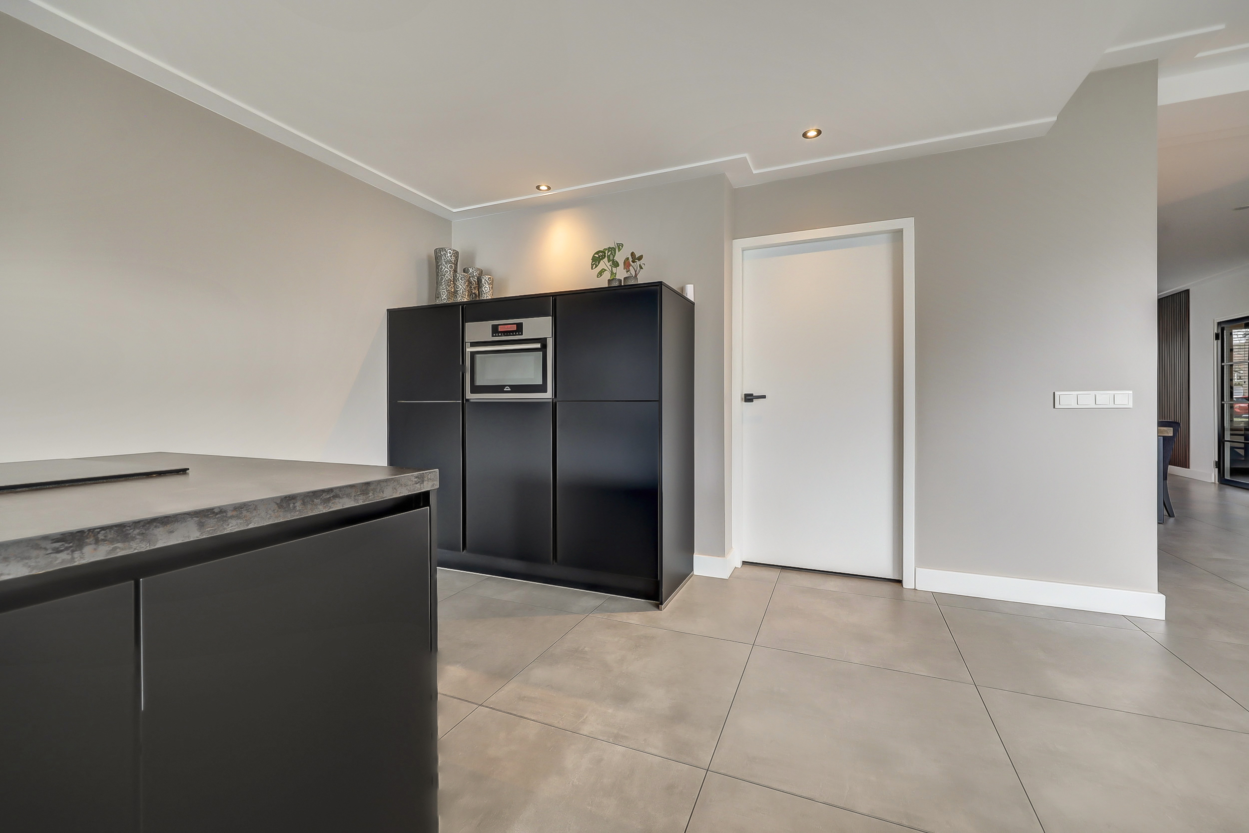 De volledige begane grond is afgewerkt met een moderne tegelvloer voorzien van comfortabele vloerverwarming. Aan de achterzijde bevindt zich de luxe leefkeuken (2018). De keuken is royaal opgezet met een groot kook-/werkeiland en een separate kastenwand. Het eiland is voorzien van een inductiekookplaat met geïntegreerde afzuiging, een strak werkblad en een Quooker-kraan. De wandpanelen zorgen voor extra warmte en karakter in de ruimte. De kastenwand beschikt over diverse inbouwapparatuur en biedt volop bergruimte. Dankzij de ruime opzet is dit een echte leefkeuken waar koken en samenkomen centraal staan. Aansluitend bevindt zich de bijkeuken, ingericht met een vaste kastenwand en functionerend als praktische tussenruimte richting de garage. Deze ruimte is opgedeeld in twee delen. Het voorste gedeelte wordt gebruikt als berging/garage en biedt volop ruimte voor fietsen en opslag. Het achterste gedeelte is ingericht als volwaardige extra ruimte, voorzien van een vaste kastenwand en de wasopstelling. Deze indeling maakt de ruimte multifunctioneel en geschikt voor diverse doeleinden, zoals hobbyruimte, werkplek of extra bergruimte.