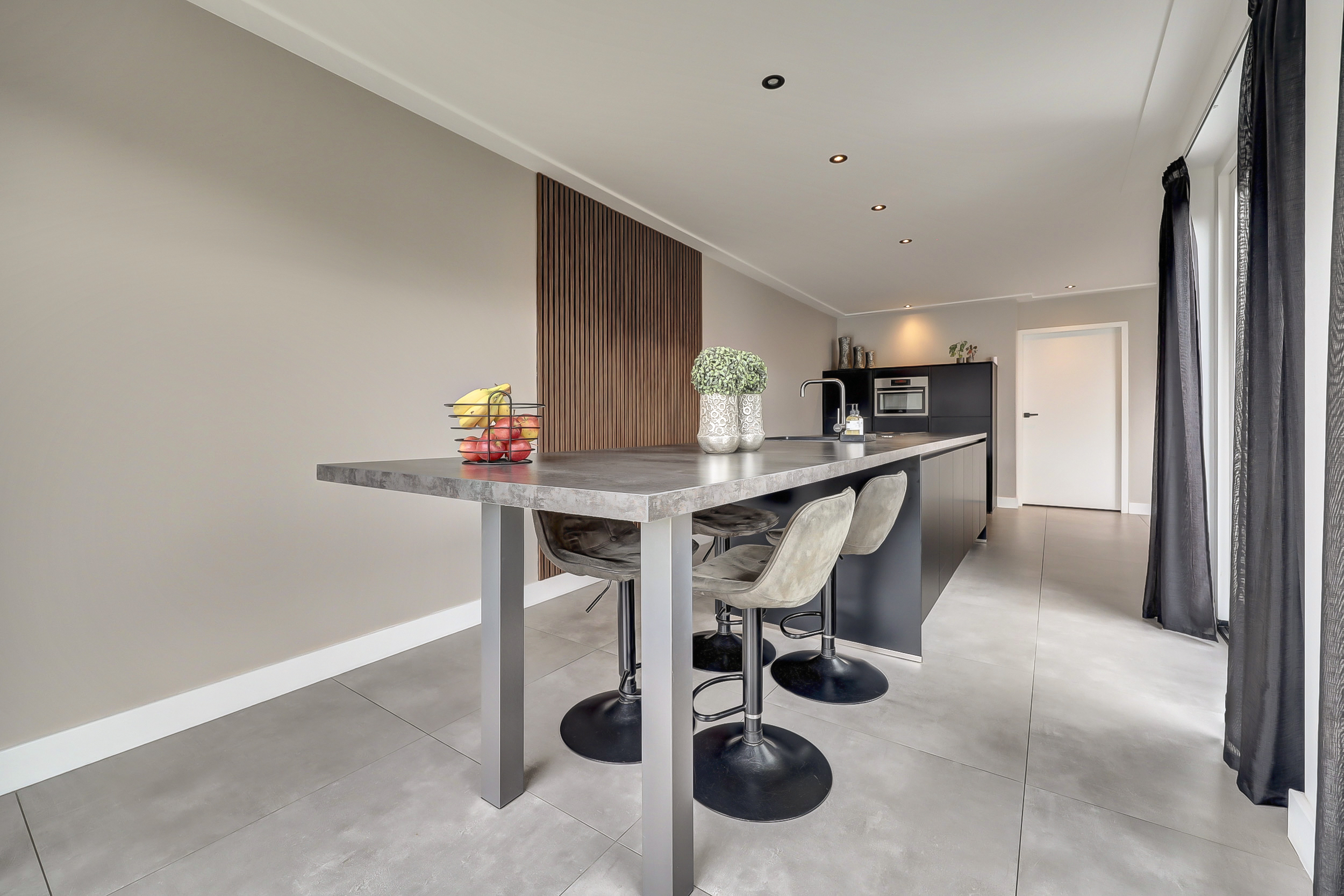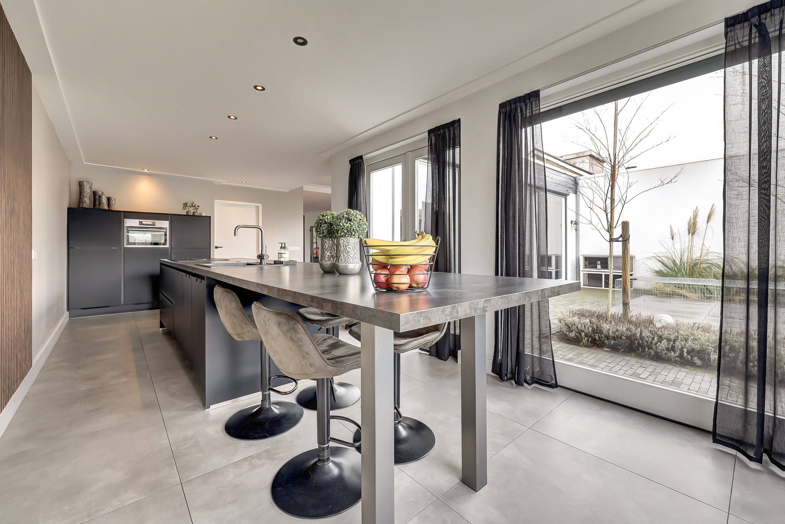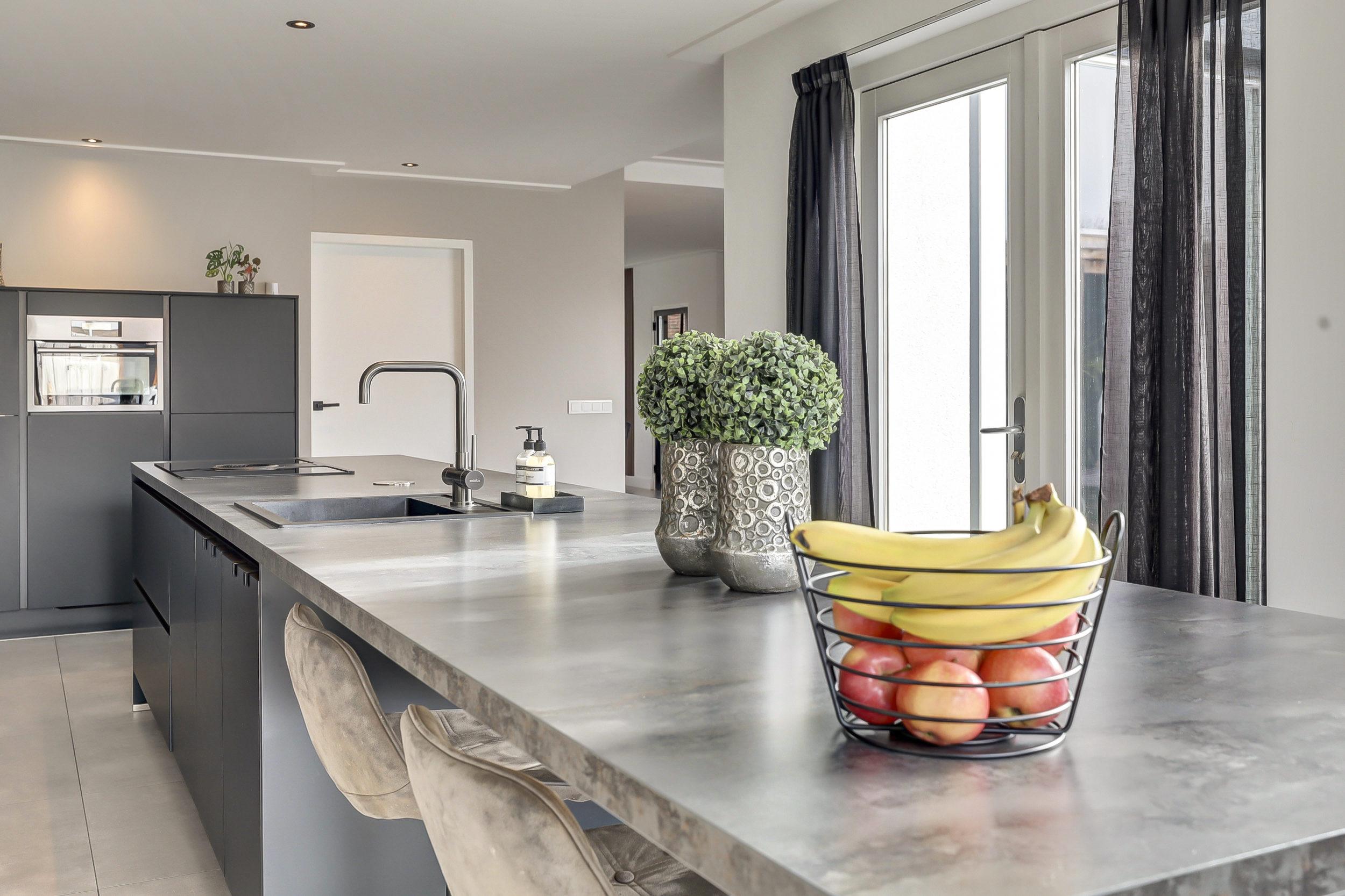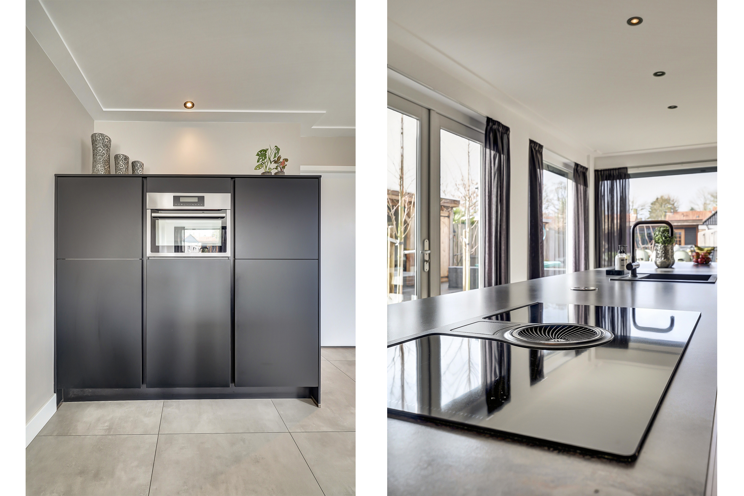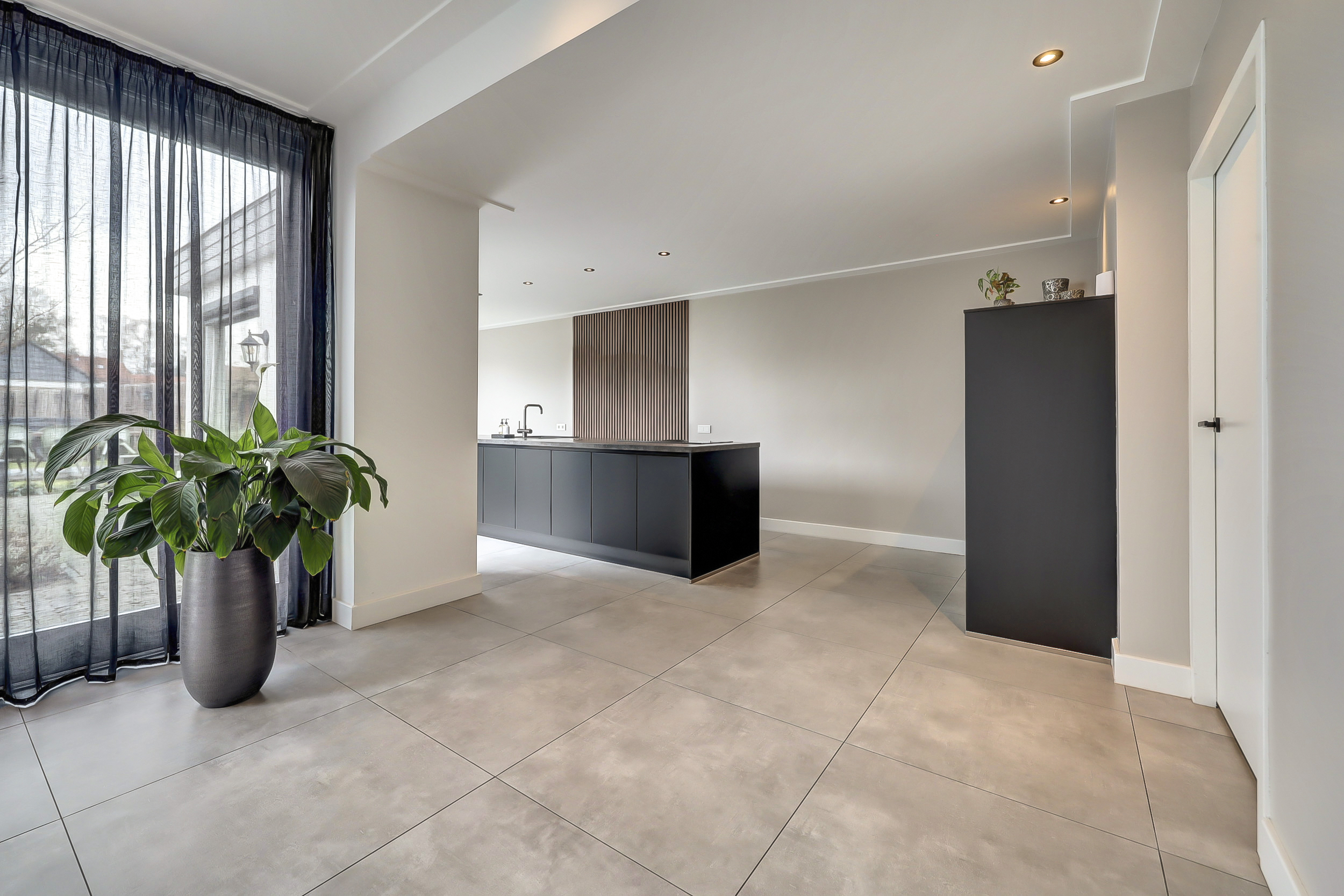 De volledige begane grond is afgewerkt met een moderne tegelvloer voorzien van comfortabele vloerverwarming. Aan de achterzijde bevindt zich de luxe leefkeuken (2018). De keuken is royaal opgezet met een groot kook-/werkeiland en een separate kastenwand. Het eiland is voorzien van een inductiekookplaat met geïntegreerde afzuiging, een strak werkblad en een Quooker-kraan. De wandpanelen zorgen voor extra warmte en karakter in de ruimte. De kastenwand beschikt over diverse inbouwapparatuur en biedt volop bergruimte. Dankzij de ruime opzet is dit een echte leefkeuken waar koken en samenkomen centraal staan. Aansluitend bevindt zich de bijkeuken, ingericht met een vaste kastenwand en functionerend als praktische tussenruimte richting de garage. Deze ruimte is opgedeeld in twee delen. Het voorste gedeelte wordt gebruikt als berging/garage en biedt volop ruimte voor fietsen en opslag. Het achterste gedeelte is ingericht als volwaardige extra ruimte, voorzien van een vaste kastenwand en de wasopstelling. Deze indeling maakt de ruimte multifunctioneel en geschikt voor diverse doeleinden, zoals hobbyruimte, werkplek of extra bergruimte.