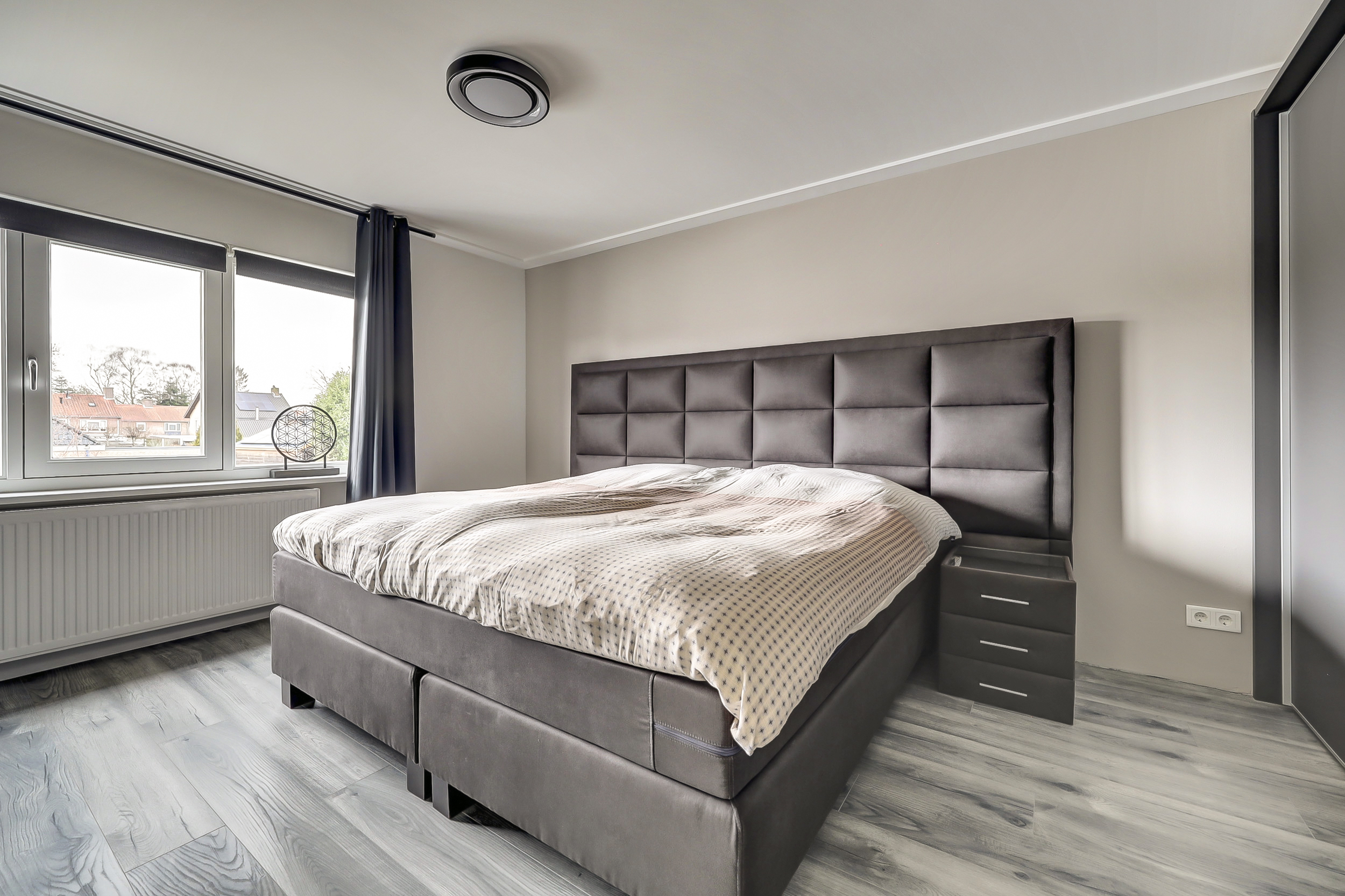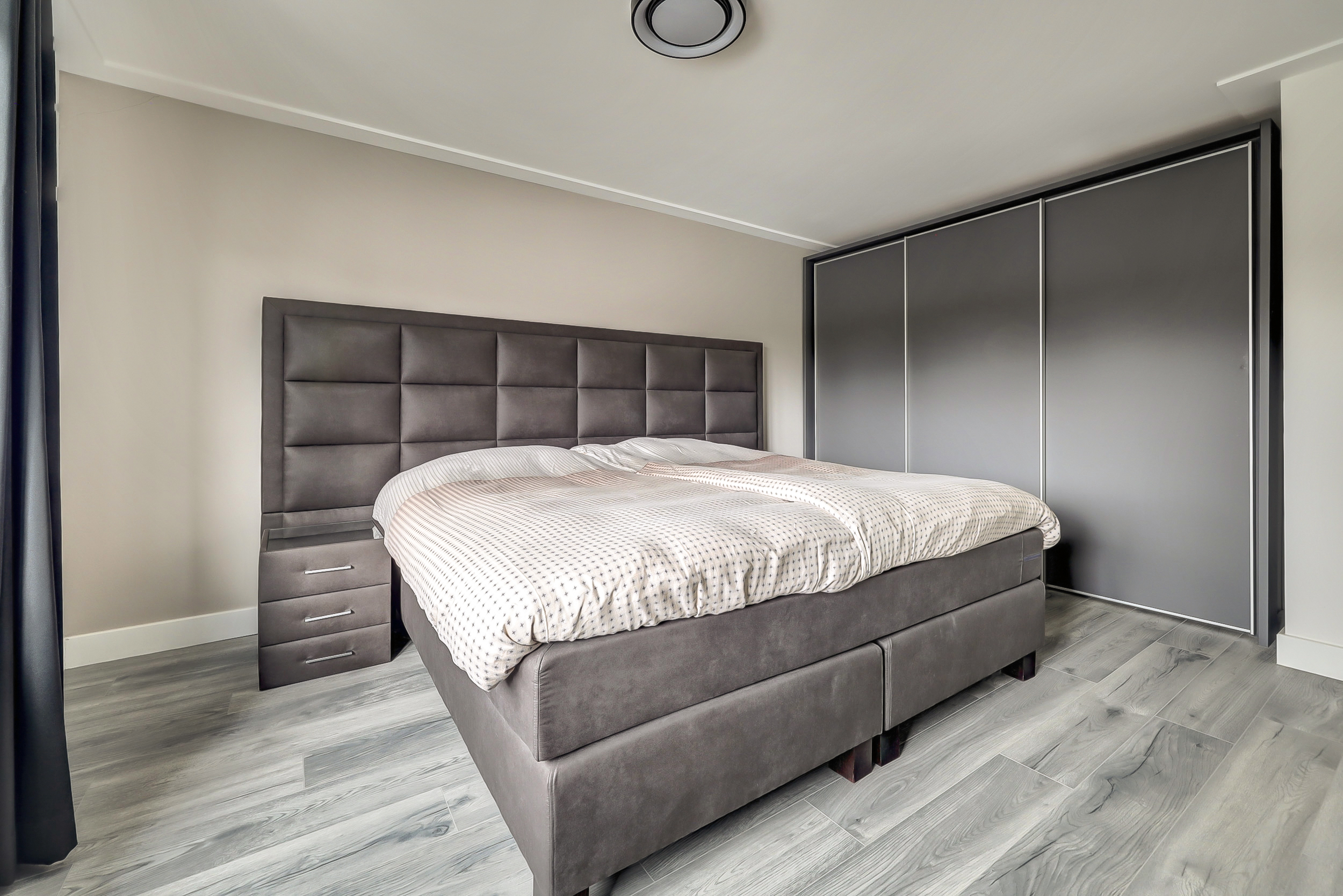 Via de trap bereikt u de ruime overloop, die toegang biedt tot de verschillende vertrekken op deze verdieping. Direct valt op dat ook hier de woning keurig is afgewerkt en een verzorgde, moderne uitstraling heeft. Aan de voorzijde bevindt zich een kamer die momenteel open toegankelijk is vanaf de overloop. Deze ruimte is multifunctioneel inzetbaar en kan desgewenst eenvoudig worden afgesloten om een volwaardige extra slaapkamer te creëren. Ook is deze ruimte uitermate geschikt als werkplek of hobbyruimte. Aan de achterzijde ligt de royale hoofdslaapkamer. Deze kamer is heerlijk licht en van een mooi formaat, waardoor er moeiteloos plaats is voor een groot bed en aanvullende kastruimte. Een prettige en rustige plek om te ontspannen. Daarnaast is er nog een derde slaapkamer aanwezig, eveneens ruim opgezet en ideaal als kinder-, logeer- of werkkamer. De badkamer, vernieuwd in 2018, is modern en stijlvol uitgevoerd in neutrale tegels en heeft een zeer verzorgde en tijdloze uitstraling. De ruimte is voorzien van een dubbele wastafel met meubel, een toilet en een royale inloopdouche. Dankzij de vloerverwarming geniet u hier van extra comfort. Een complete en comfortabele badkamer die volledig aansluit bij het hoogwaardige niveau van de woning.