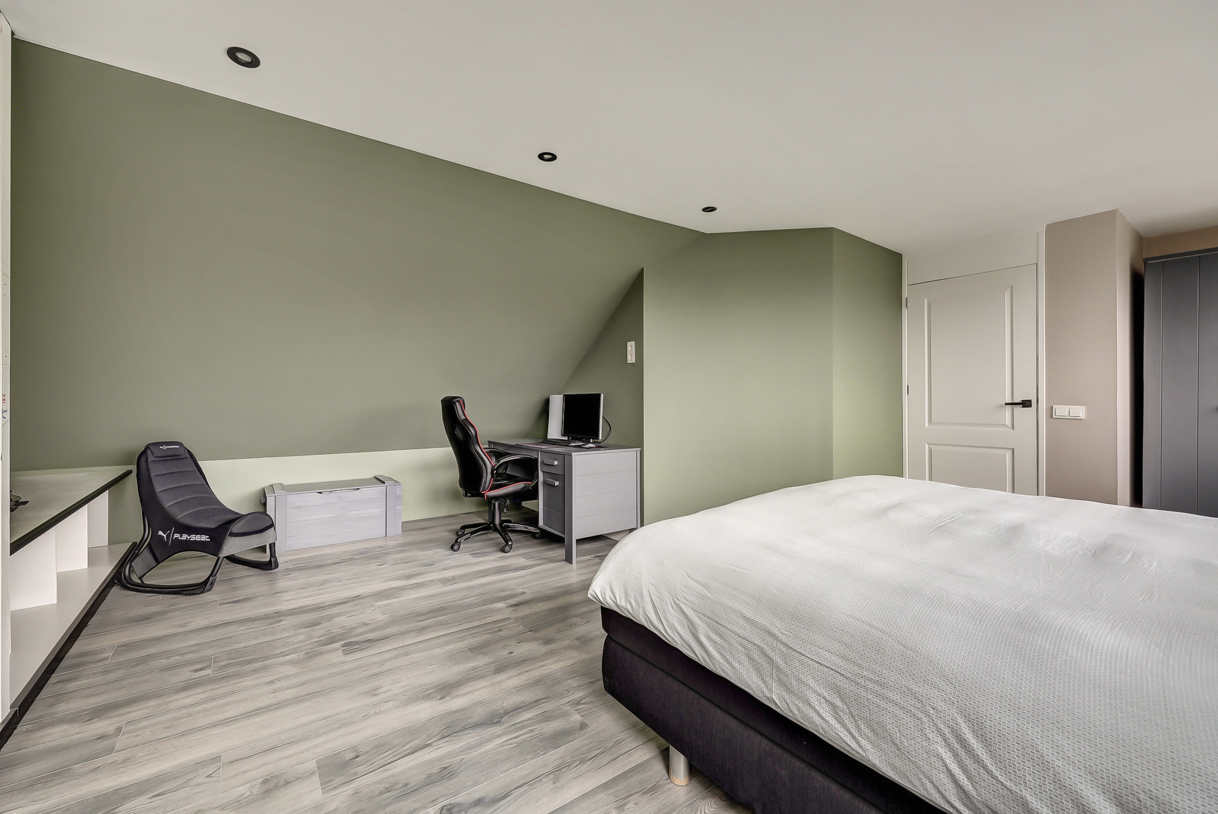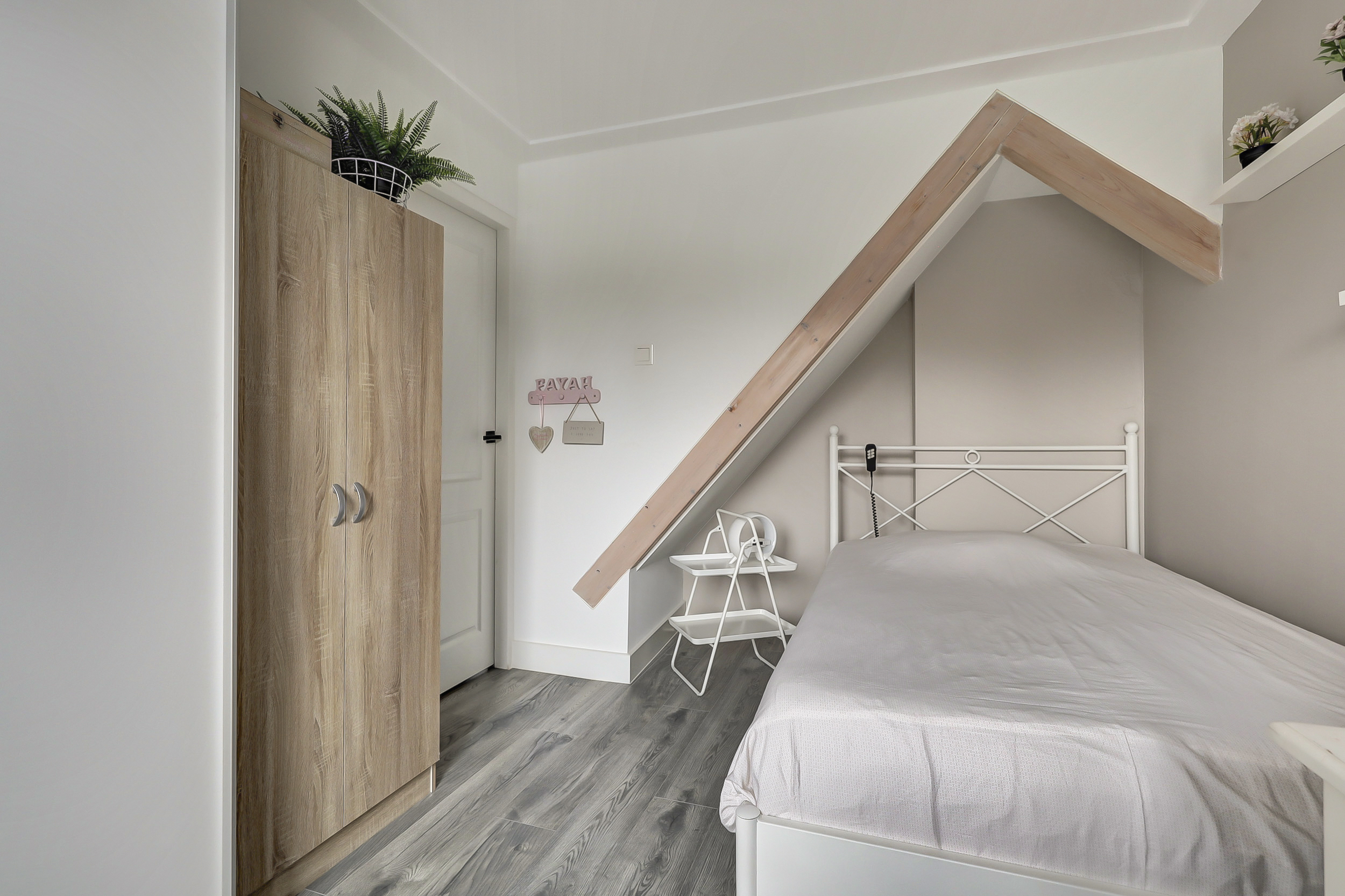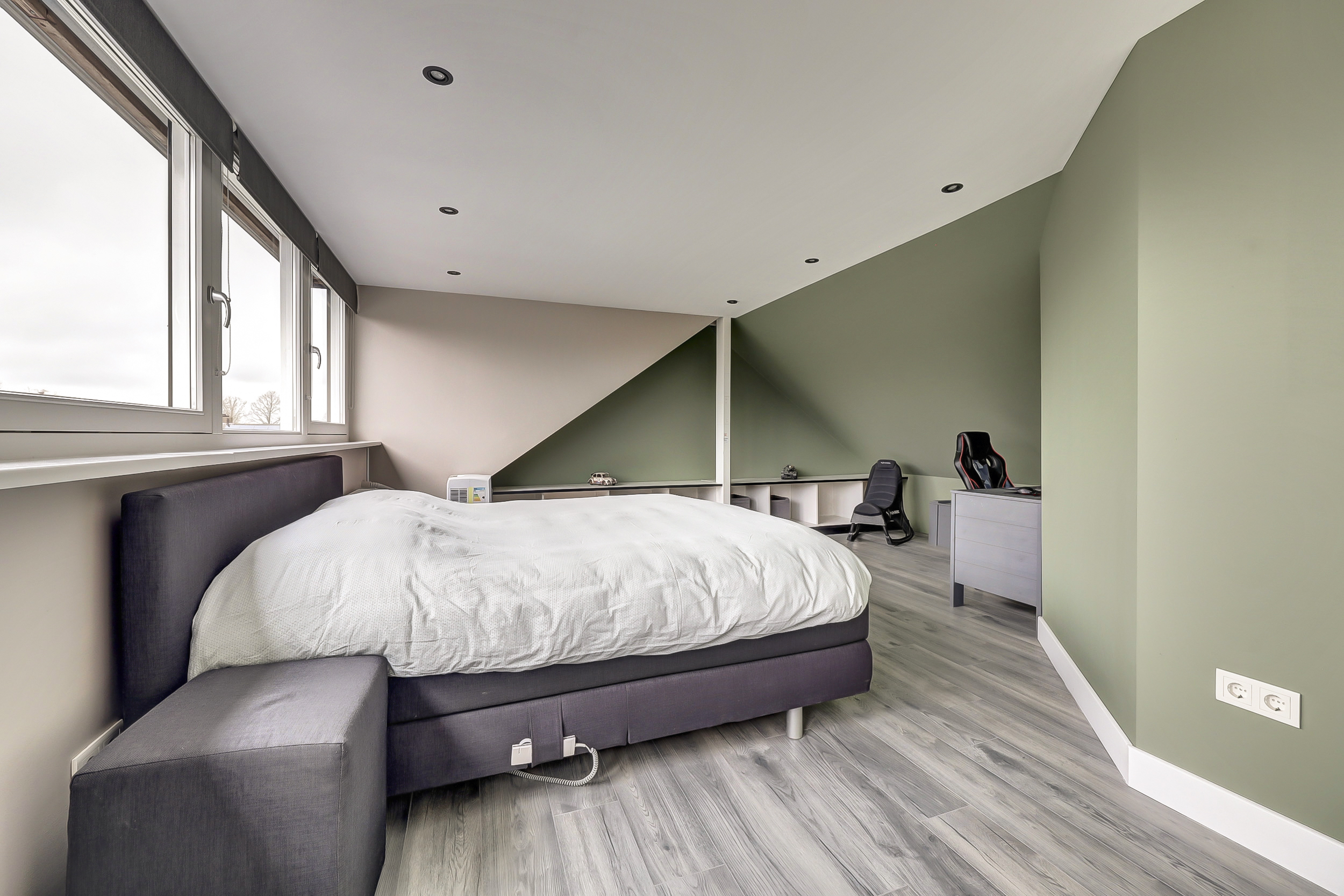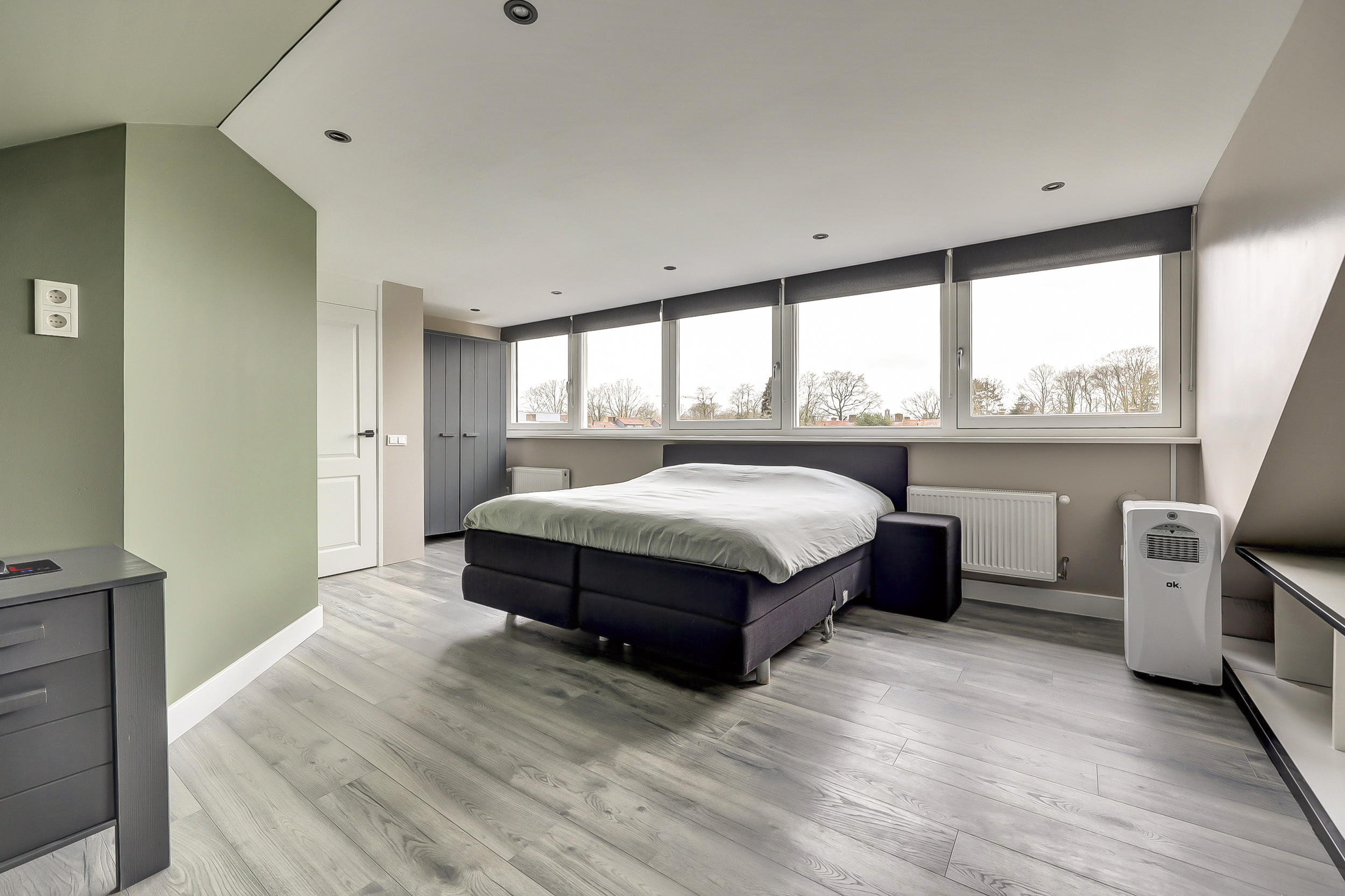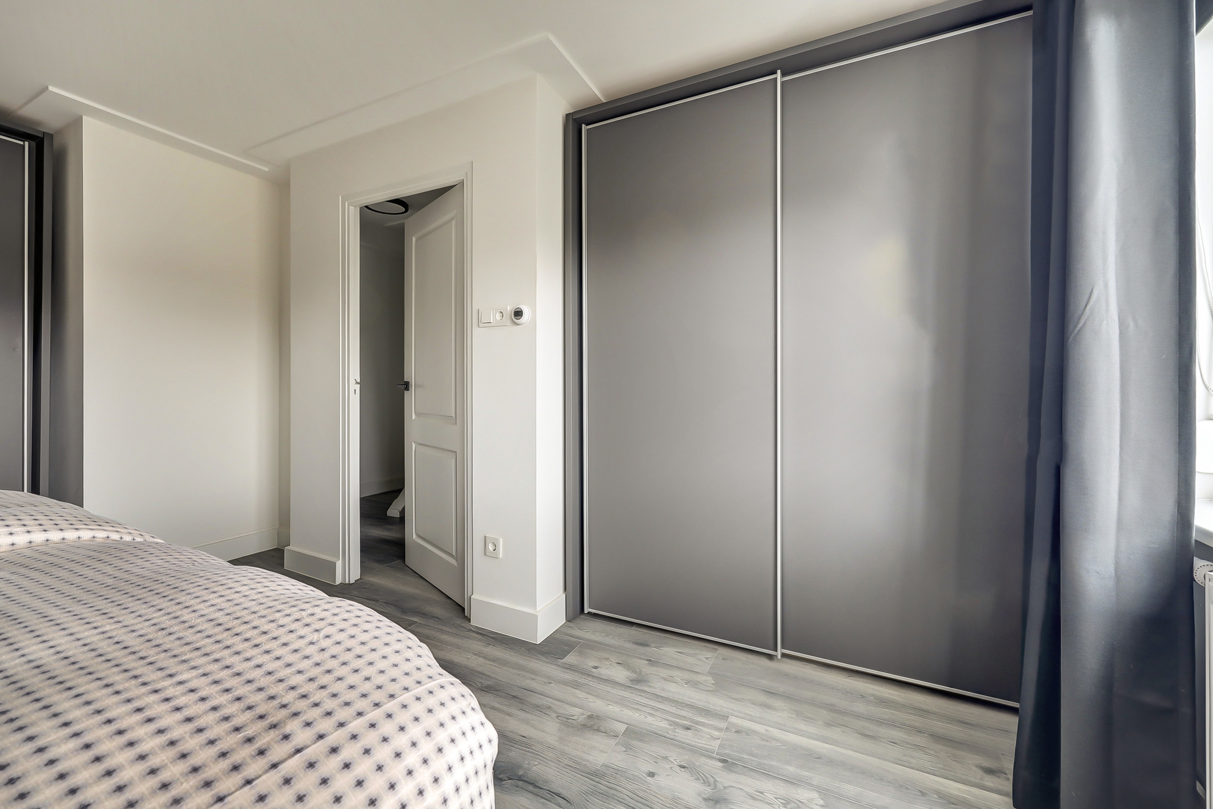 De overloop biedt praktische bergruimte en toegang tot een bijzonder royale slaapkamer. Deze kamer is van dusdanig formaat dat deze uitstekend kan dienen als volwaardige master bedroom. Dankzij de dakkapel is er veel daglicht en een prettige ruimtelijke beleving.