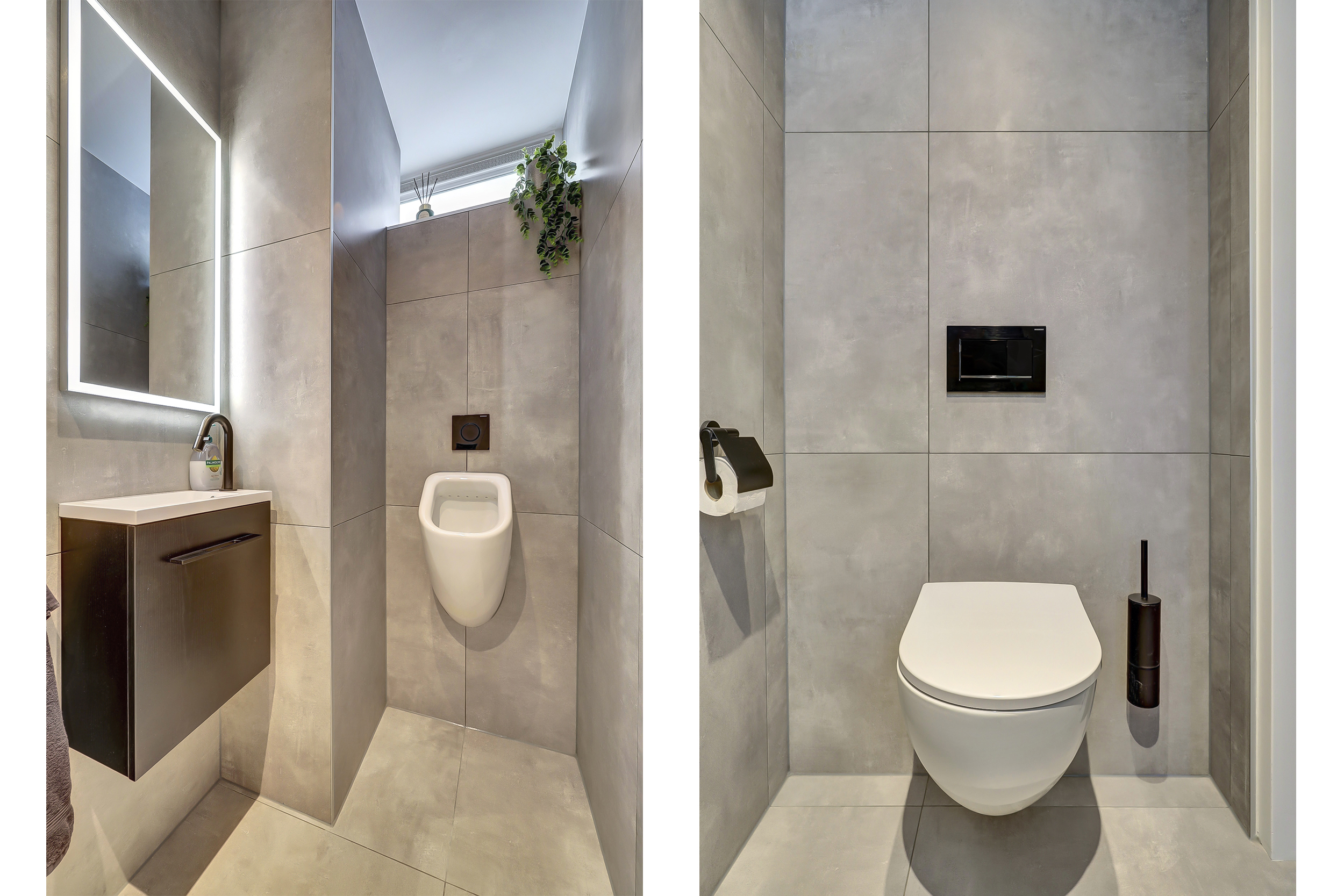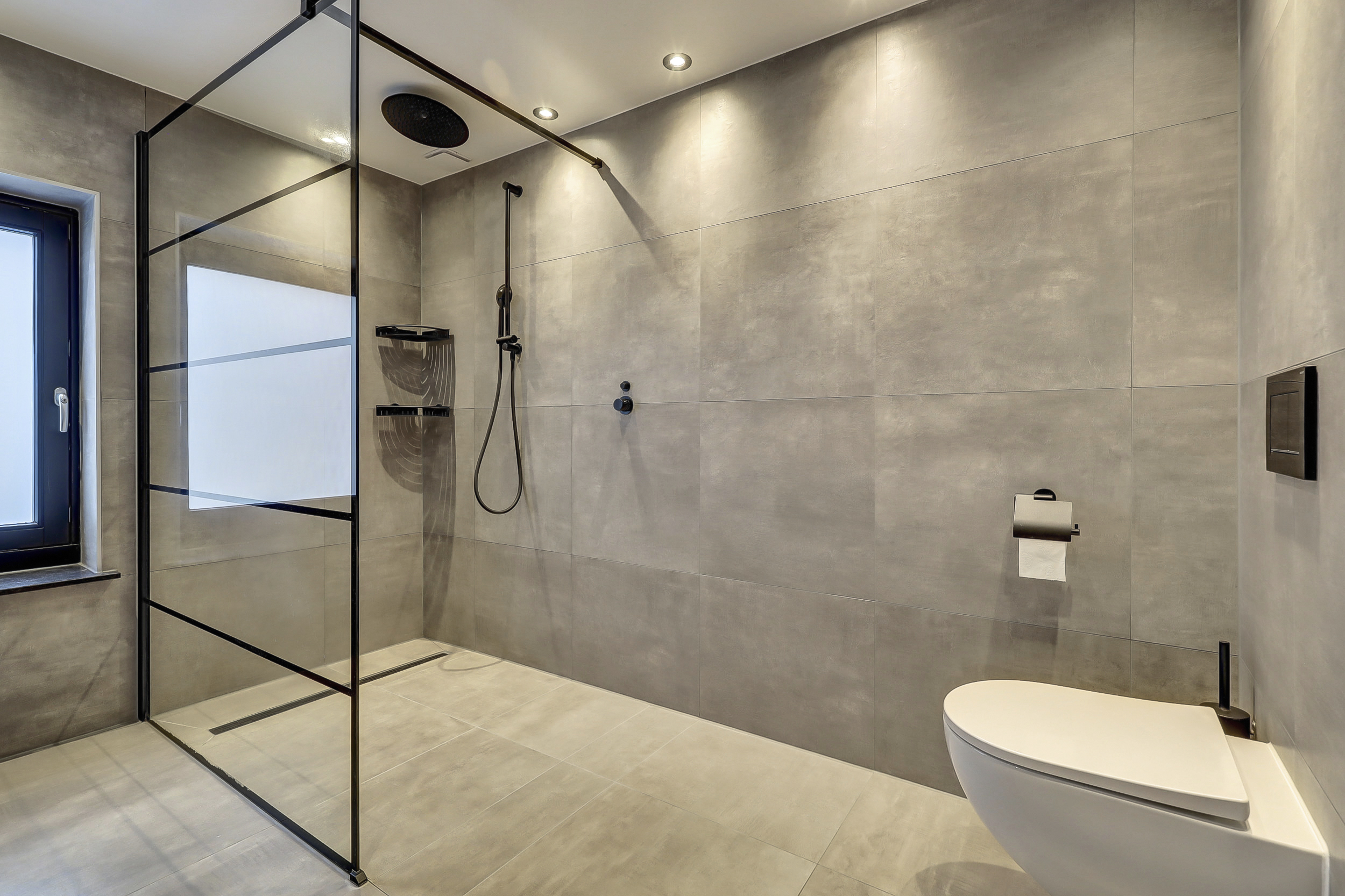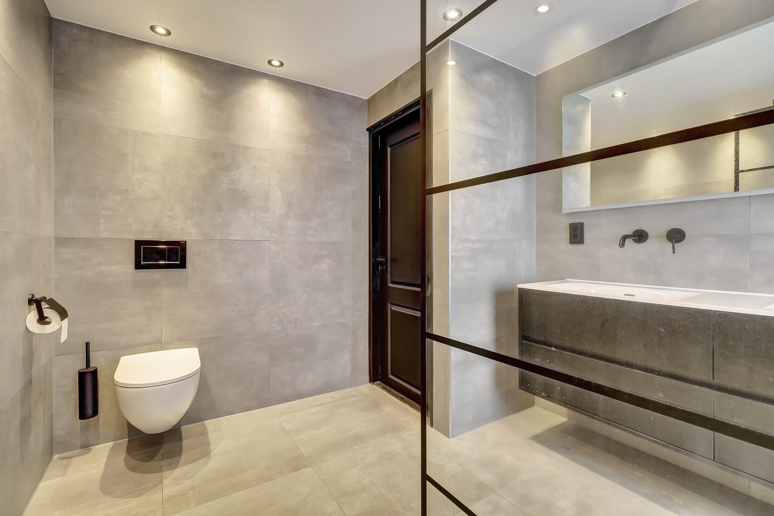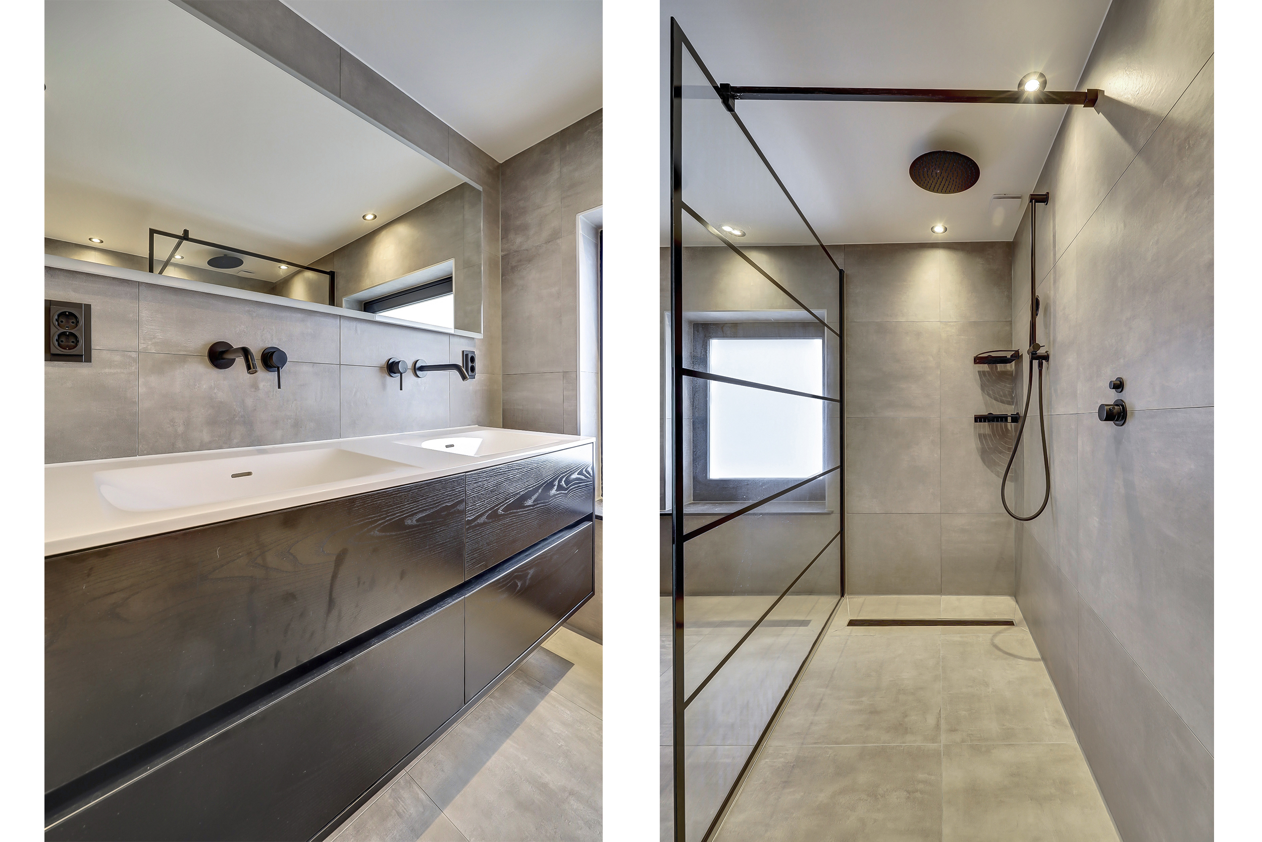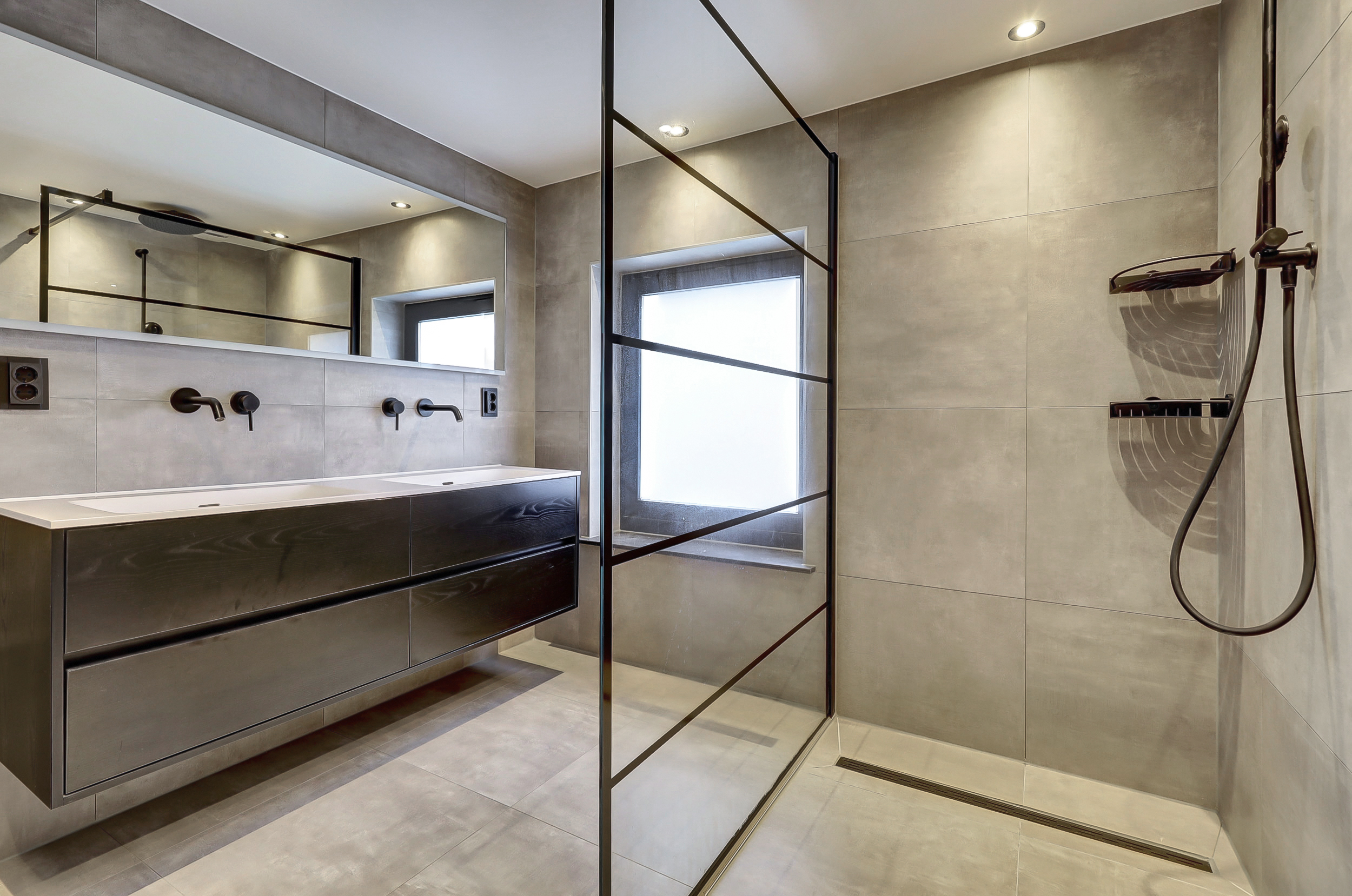 - Toilet, dubbele wastafel, wastafelmeubel en inloopdouche