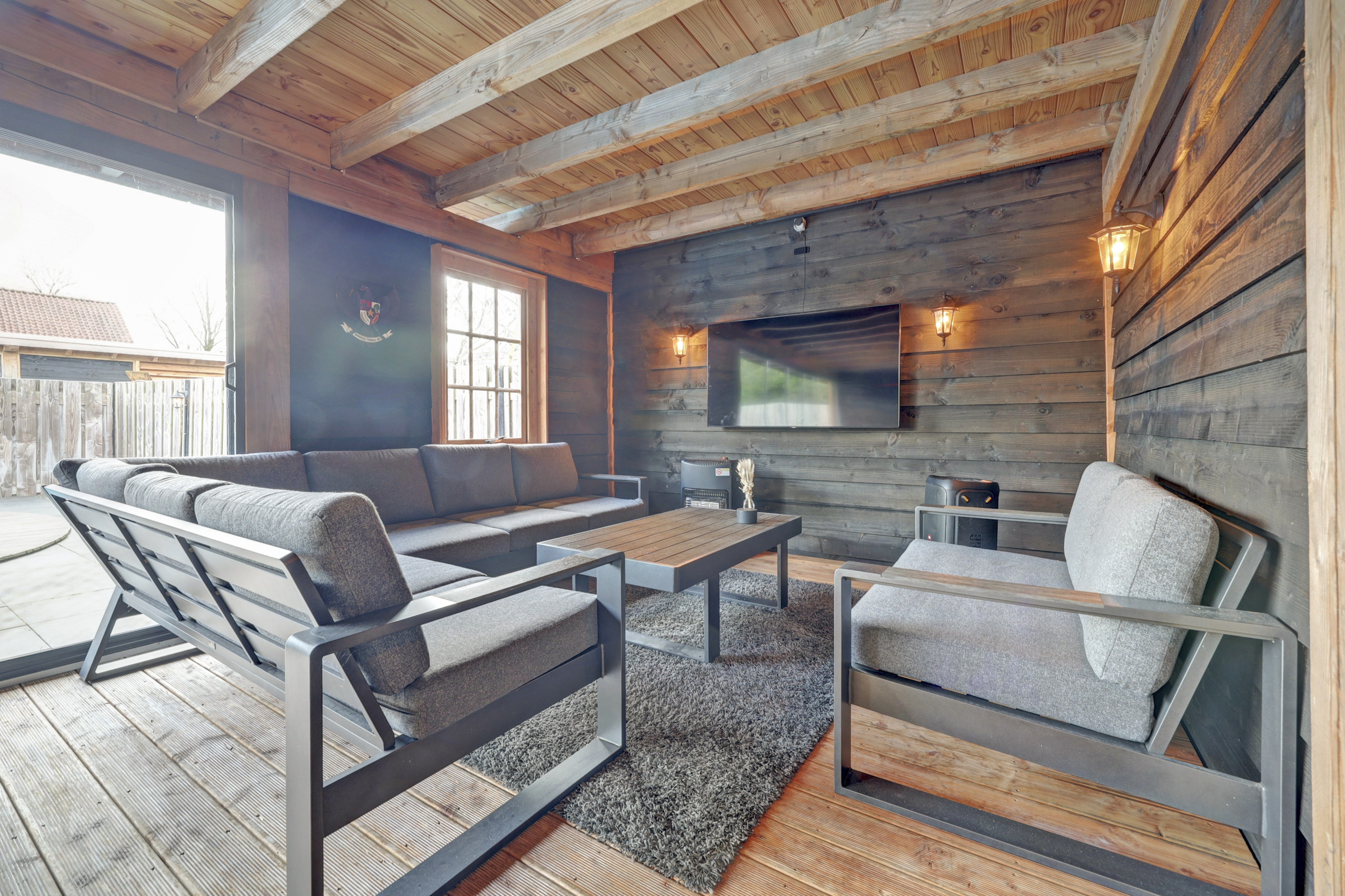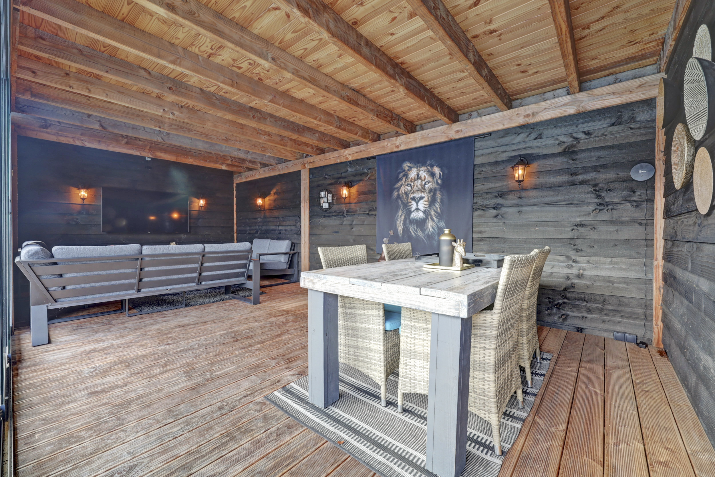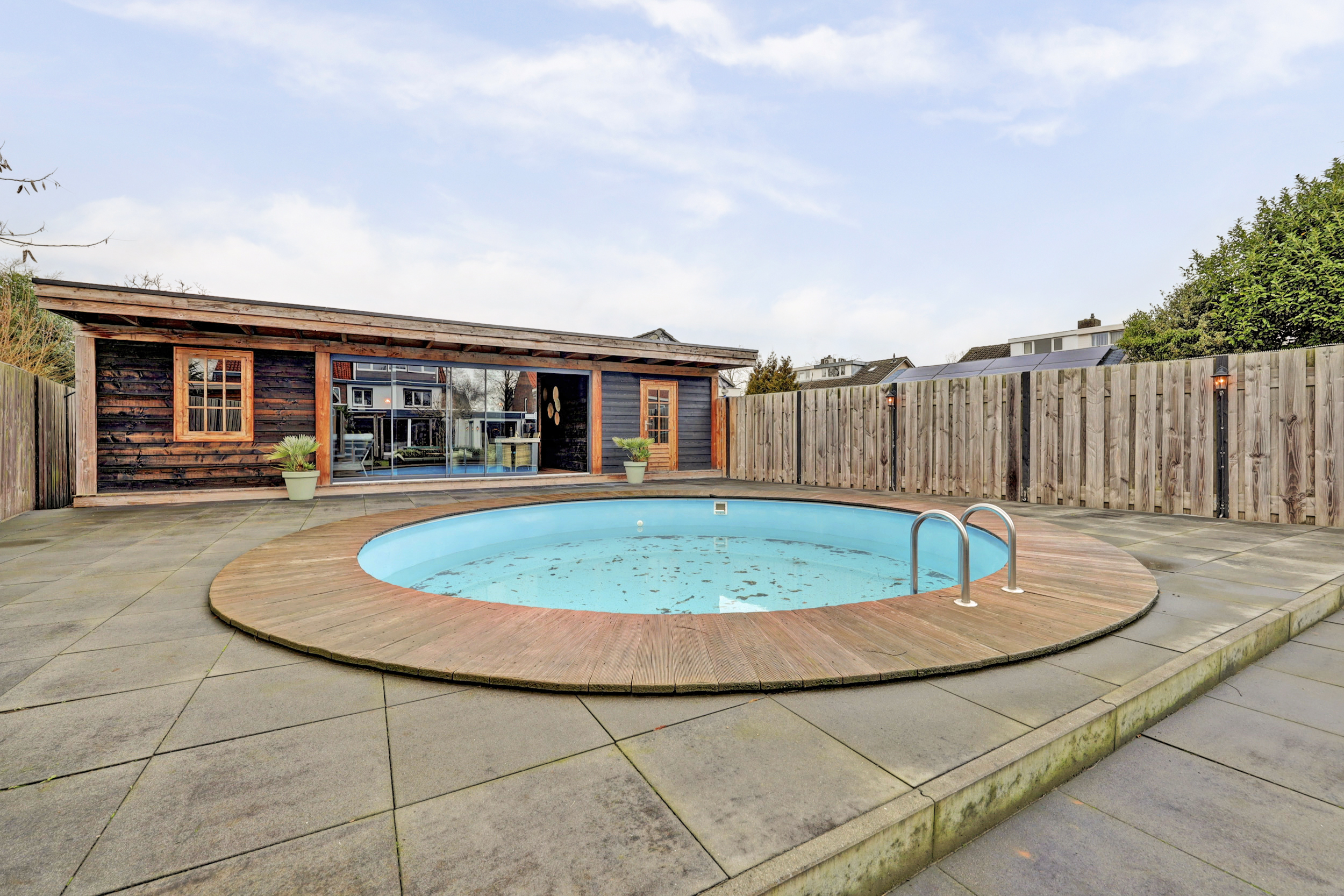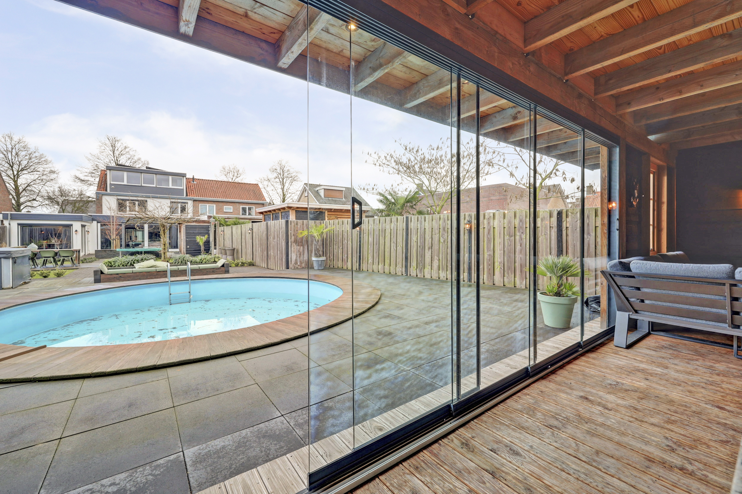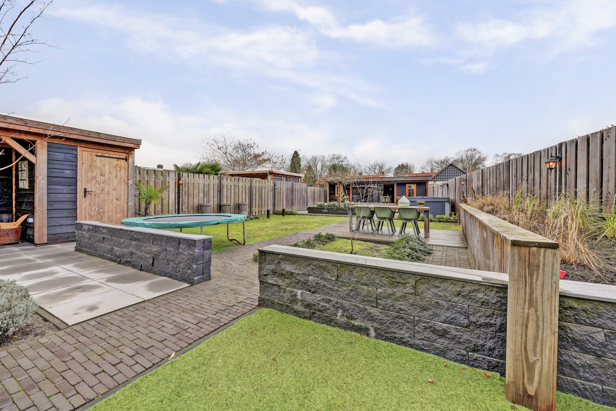De tuin is zonder twijfel één van de absolute hoogtepunten van deze woning. Het perceel is uitzonderlijk diep en fraai aangelegd met een combinatie van gazon, bestrating en houten terrassen. Direct aan de woning bevindt zich het terras, gevolgd door een ruim grasgedeelte dat zorgt voor een open en groene uitstraling. In de tuin bevindt zich het zwembad, wat zorgt voor een ultiem vakantiegevoel in eigen achtertuin. Links in de tuin staat een kleinere berging voor extra opslag. Achterin de tuin treft u de royale tuinkamer, waar u het hele jaar door comfortabel kunt zitten. Aansluitend bevindt zich nog een extra berging. Door de diepte van het perceel, de slimme indeling en de volwassen erfafscheidingen geniet u hier van maximale privacy. Dit is buitenleven op hoog niveau.