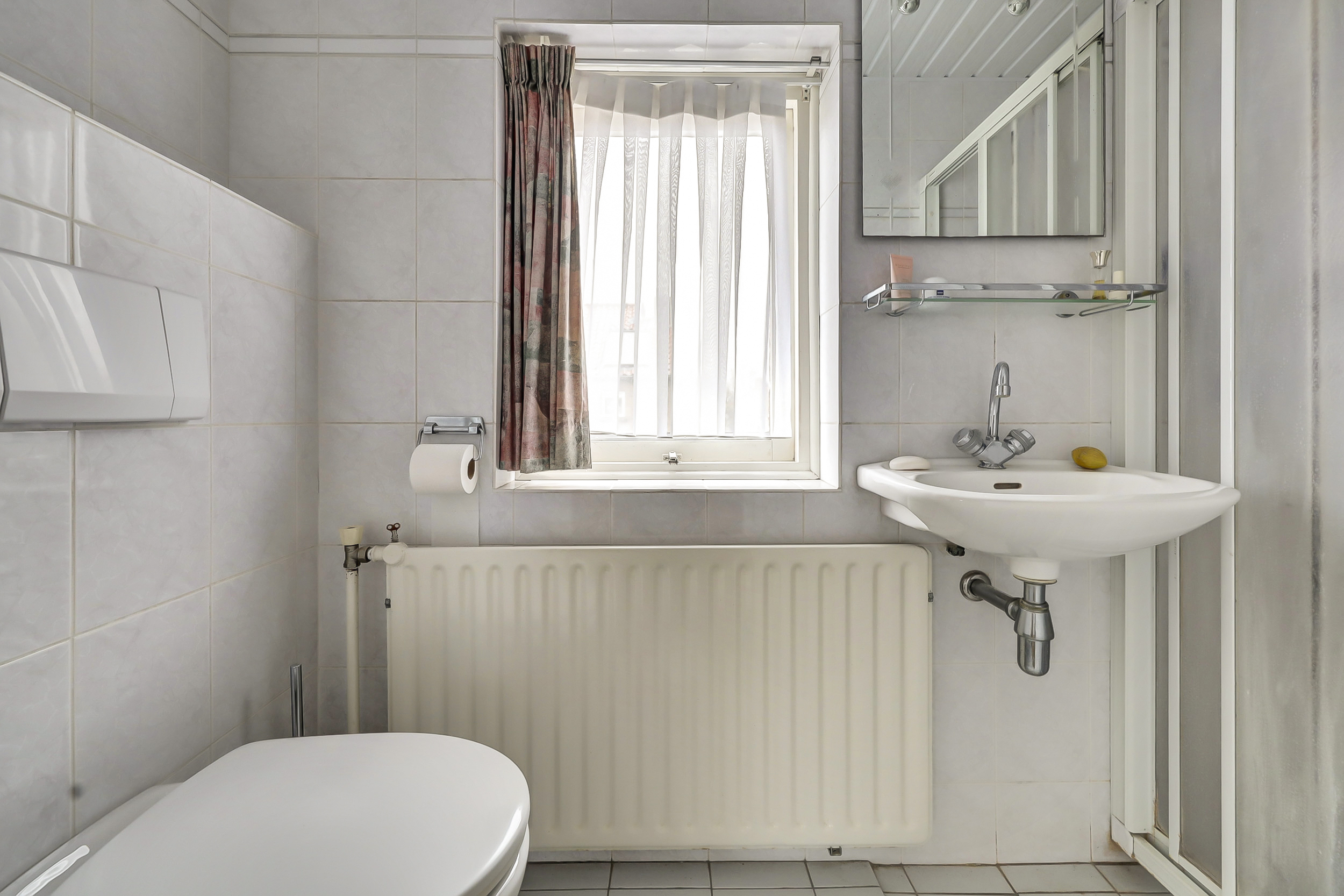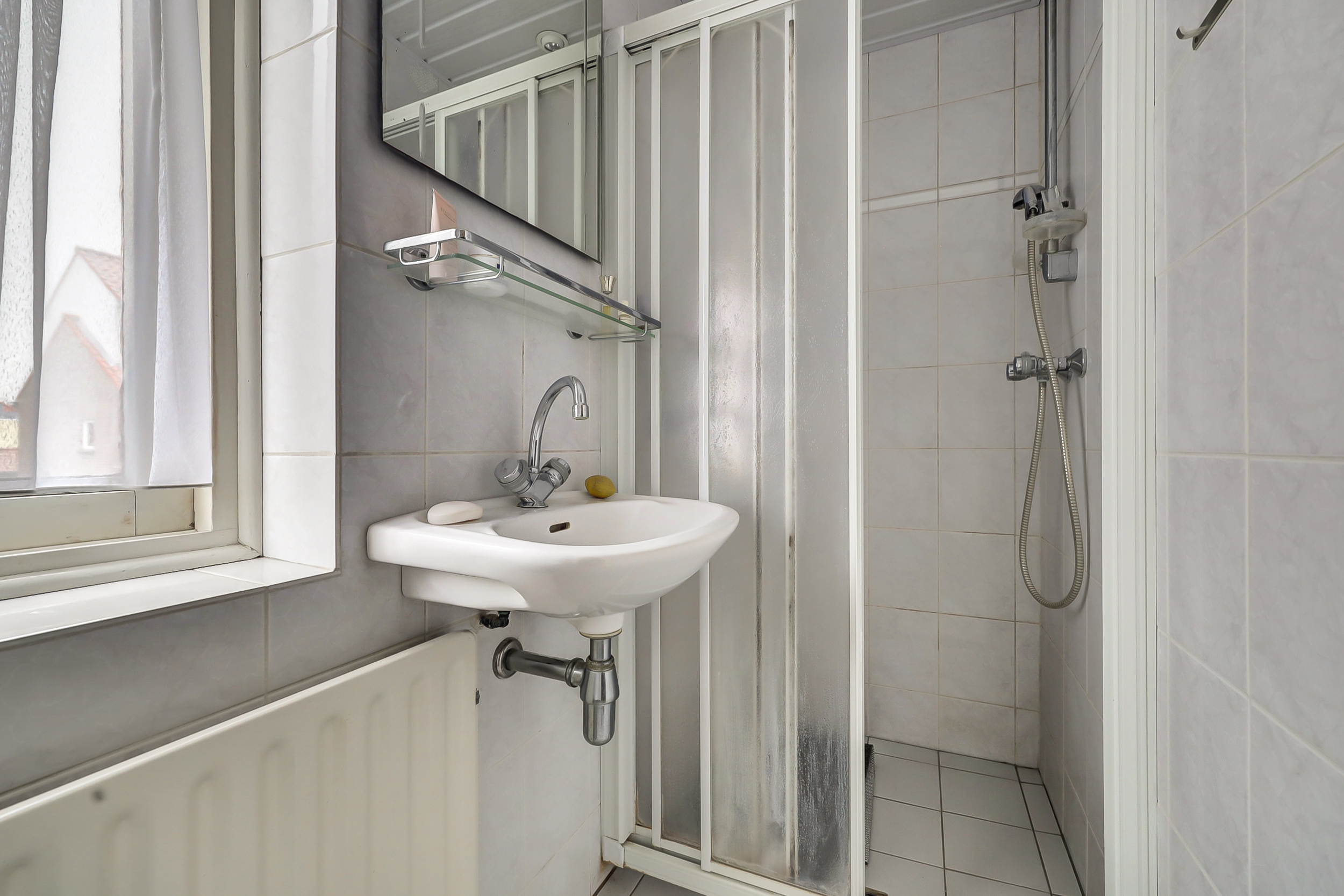 De badkamer is compact uitgevoerd en voorzien van een douche, wastafel en toilet. De ruimte is functioneel ingericht en dient, net als de rest van de woning, gemoderniseerd te worden. Dit biedt de mogelijkheid om hier een eigentijdse badkamer te realiseren die volledig aansluit bij jouw woonwensen.