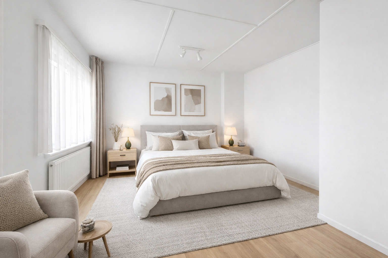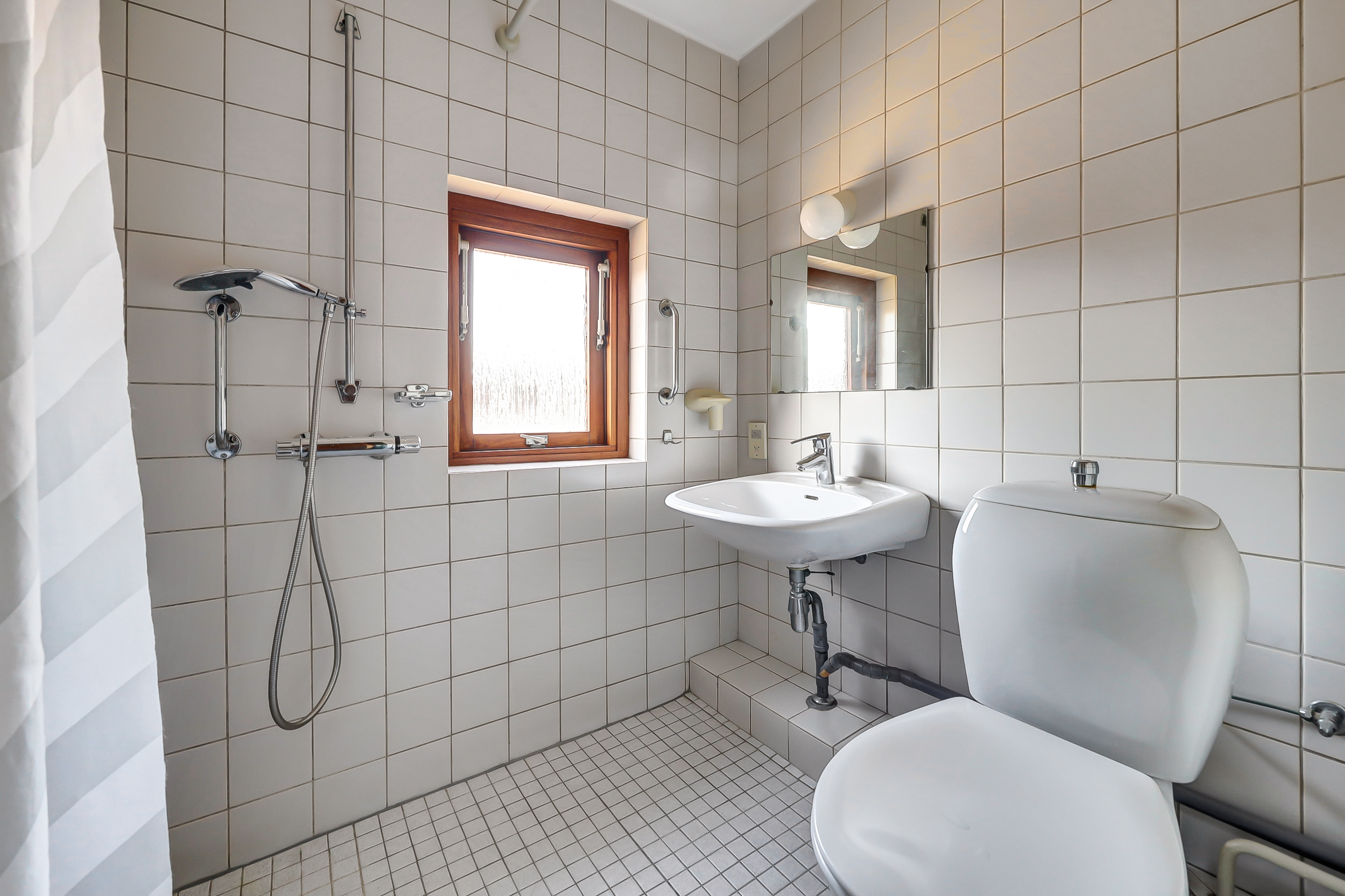 Oorspronkelijk waren hier drie slaapkamers. Twee kamers zijn samengevoegd tot één grote slaapkamer, maar met het plaatsen van een eenvoudige wand zijn hier weer drie slaapkamers van te maken. De badkamer beschikt over een douche, wastafel, tweede toilet en een raam voor daglicht en ventilatie.
