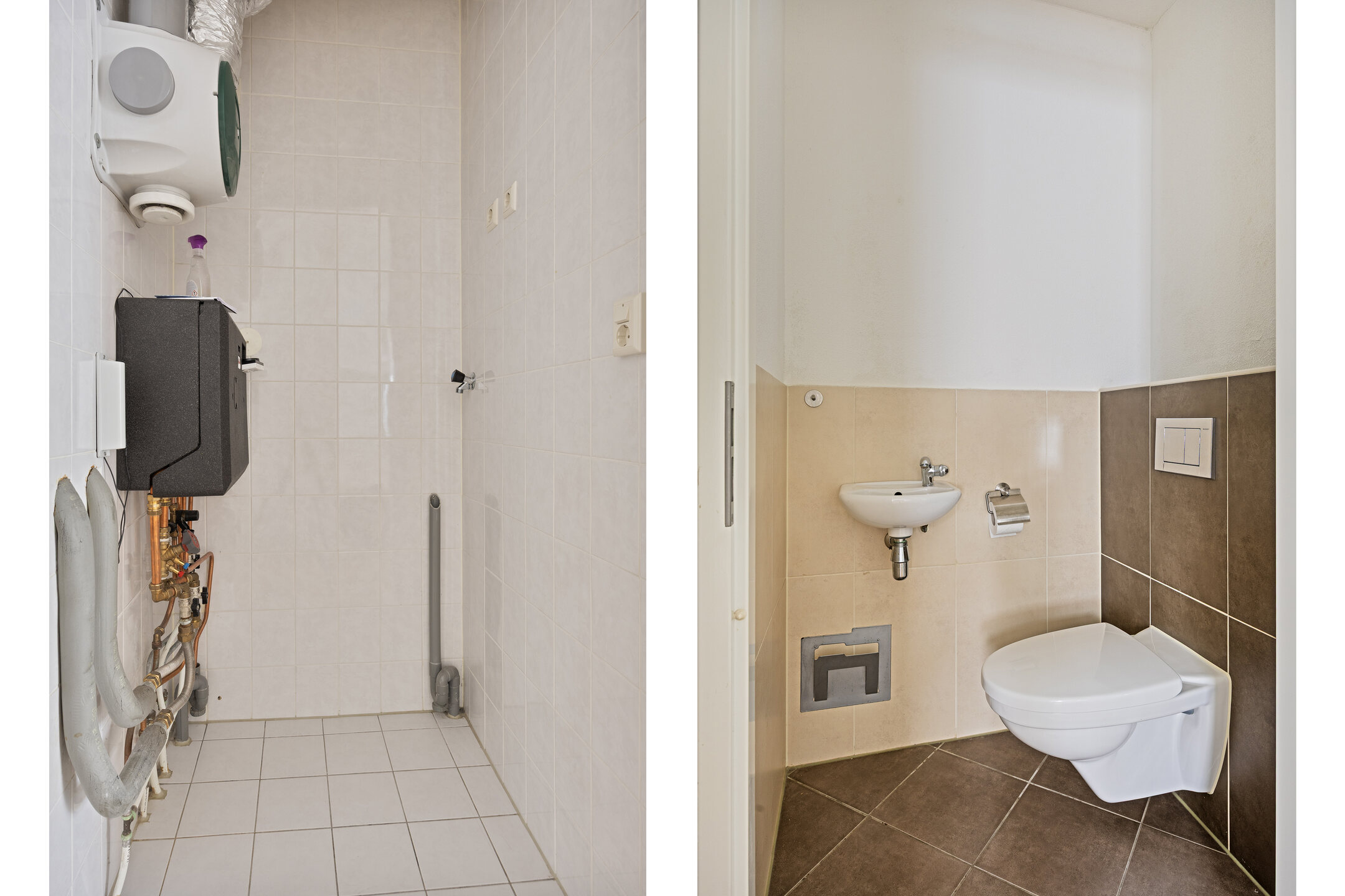 De badkamer is netjes afgewerkt en voorzien van een ligbad met douche en een wastafelmeubel. Daarnaast is er een separate toiletruimte met zwevend toilet en fonteintje. Vanuit de hal is tevens het washok bereikbaar met aansluitingen voor wasapparatuur en de opstelling van de installaties.