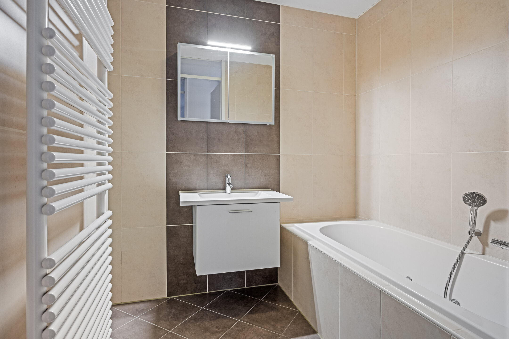 - Ligbad, wastafel, wastafelmeubel en inloopdouche