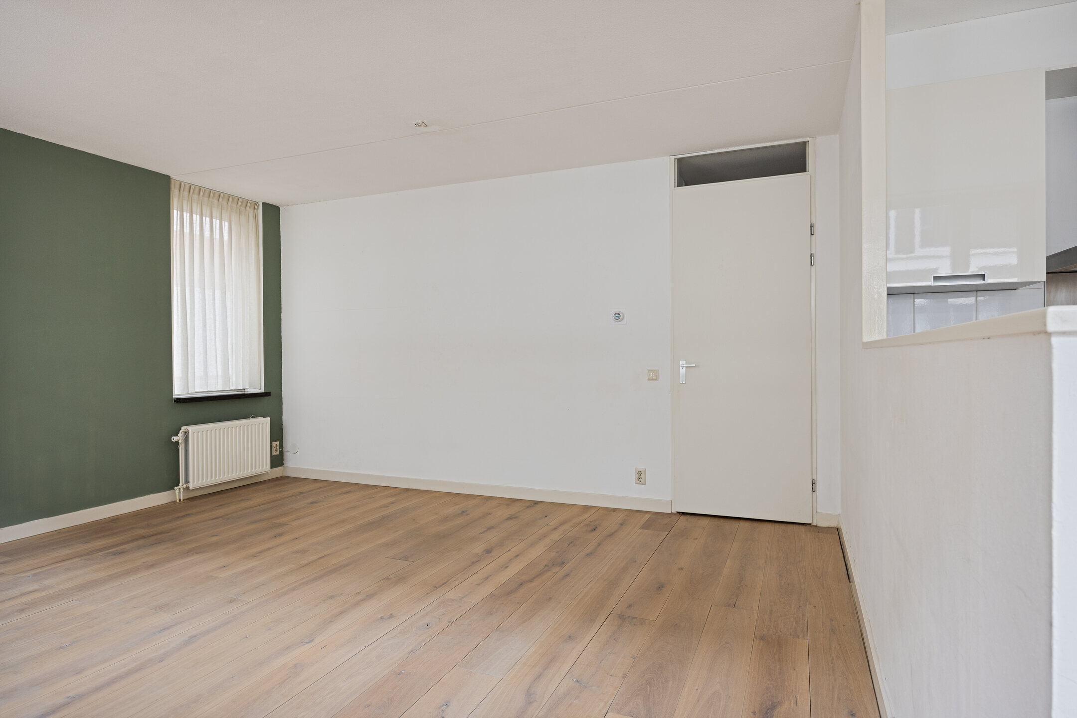 De woonkamer is ruim en licht en biedt veel indelingsvrijheid. Door de hoekligging en grote raampartijen geniet u hier van een prettige woonbeleving en een fijne lichtinval. De fraaie eikenhouten vloer zorgt voor een warme en luxe uitstraling en vormt een mooi geheel met de rest van de afwerking. Vanuit de woonkamer heeft u directe toegang tot het royale terras.