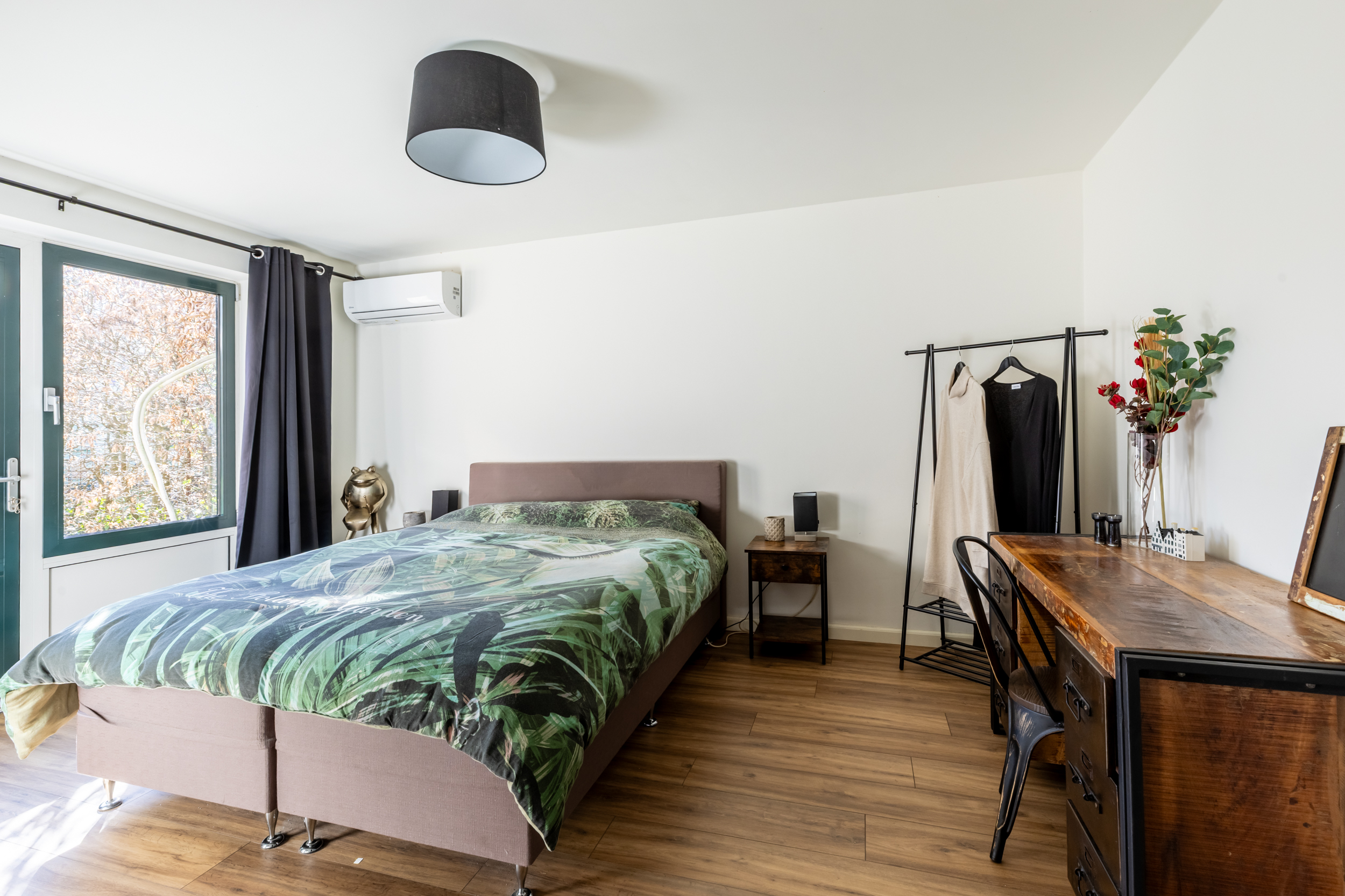 De ruime slaapkamer heeft een grote raampartij met toegang tot buiten, een airco unit en een inloopkast. Vanuit hier is ook de badkamer met vloerverwarming bereikbaar.