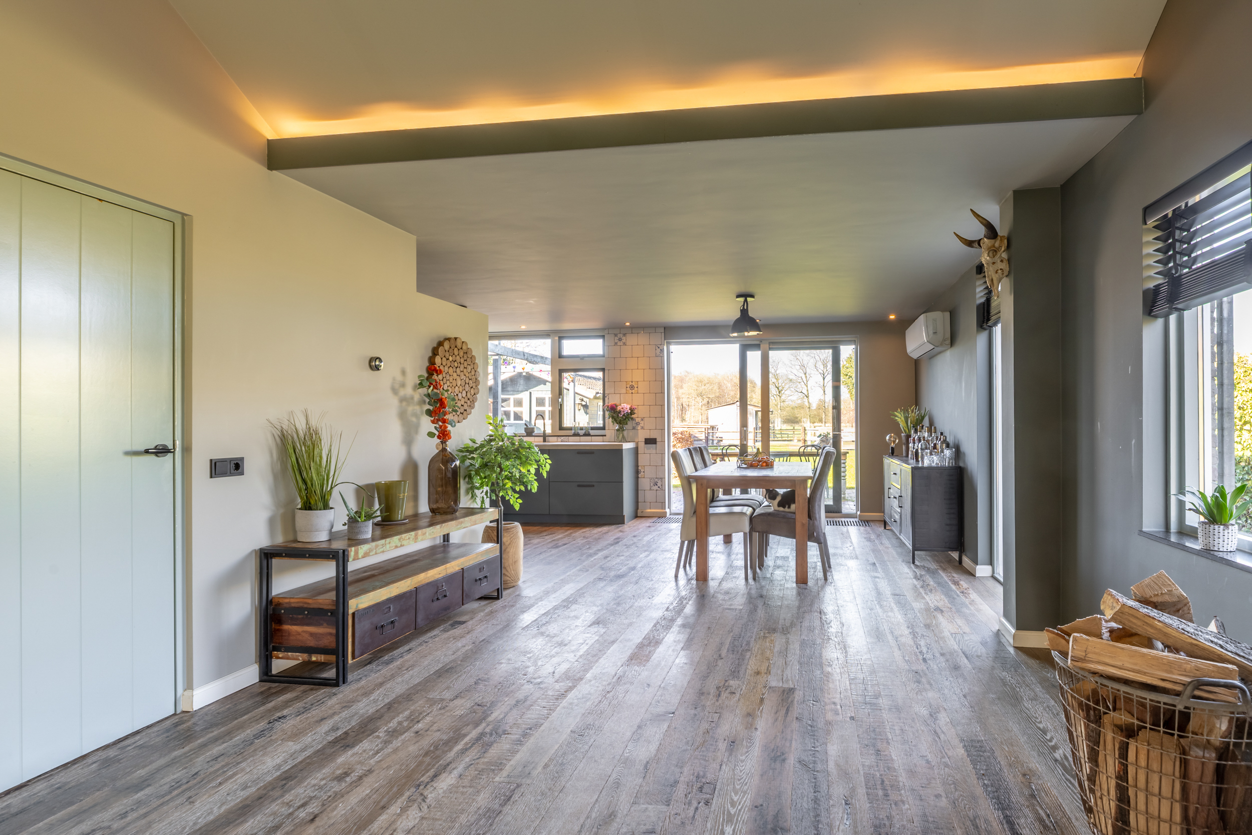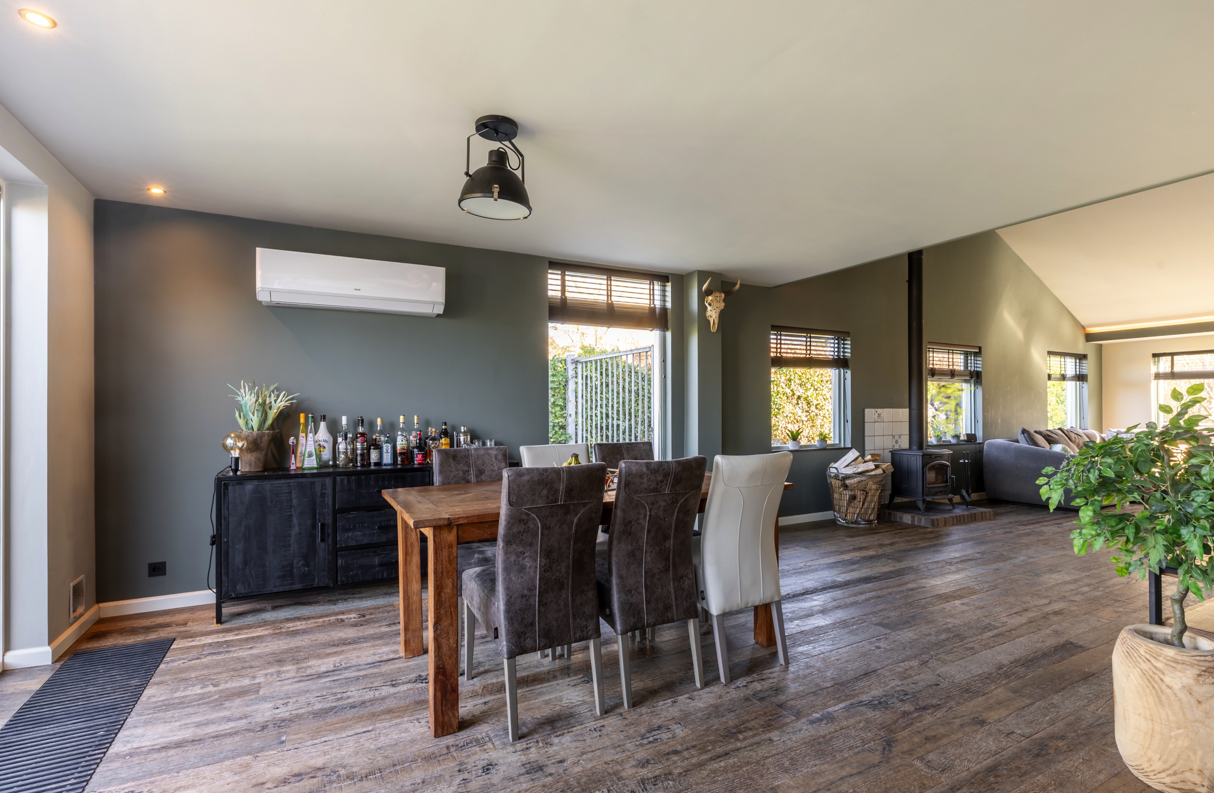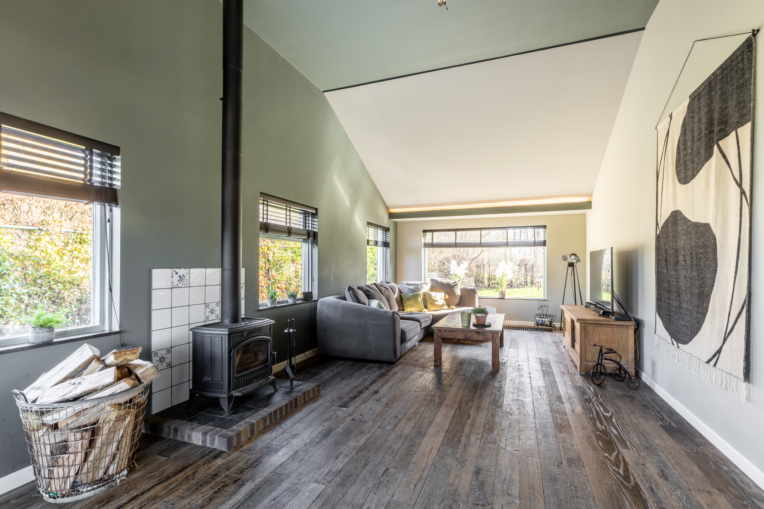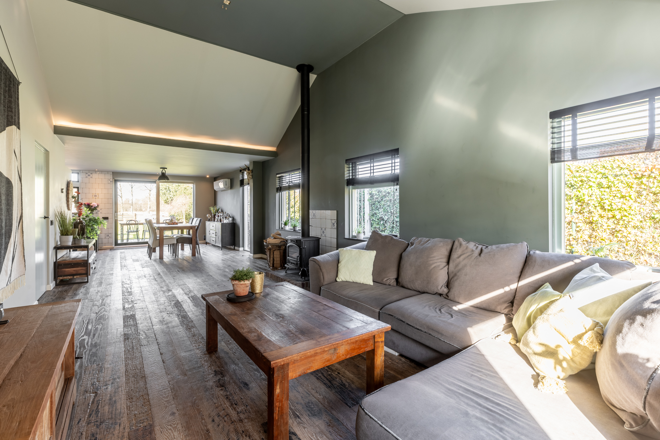 Woonkamer met massieve vloerdelen, rookkanaal met houtkachel, gestucte muren en -wanden, isolerende beglazing en met de nok in het zicht ervaar je hier een fantastisch ruimtelijk gevoel.