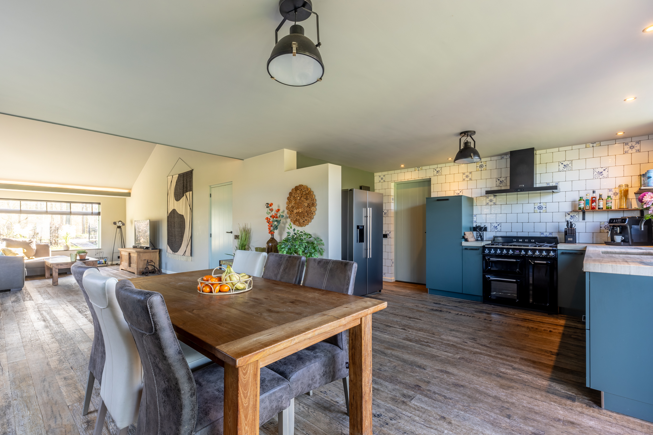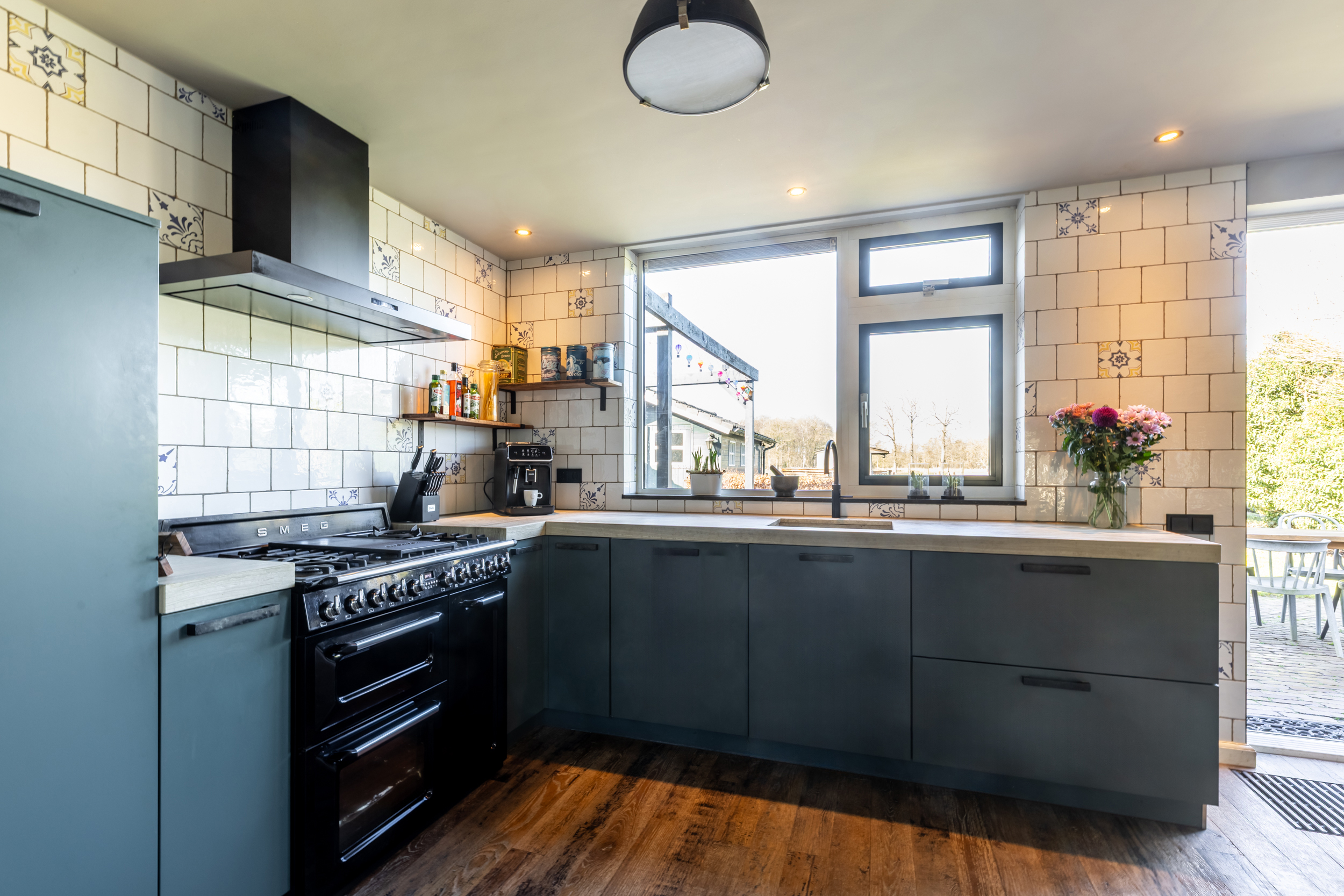 Royaal keukenmeubel met Quooker kraan, Smeg fornuis met 5 gaspitten en ovens, vaatwasser en veel werkruimte op het natuurstenen werkblad. In de woonkeuken hangt een airco/warmte unit voor extra comfort tijdens warme of koude dagen.