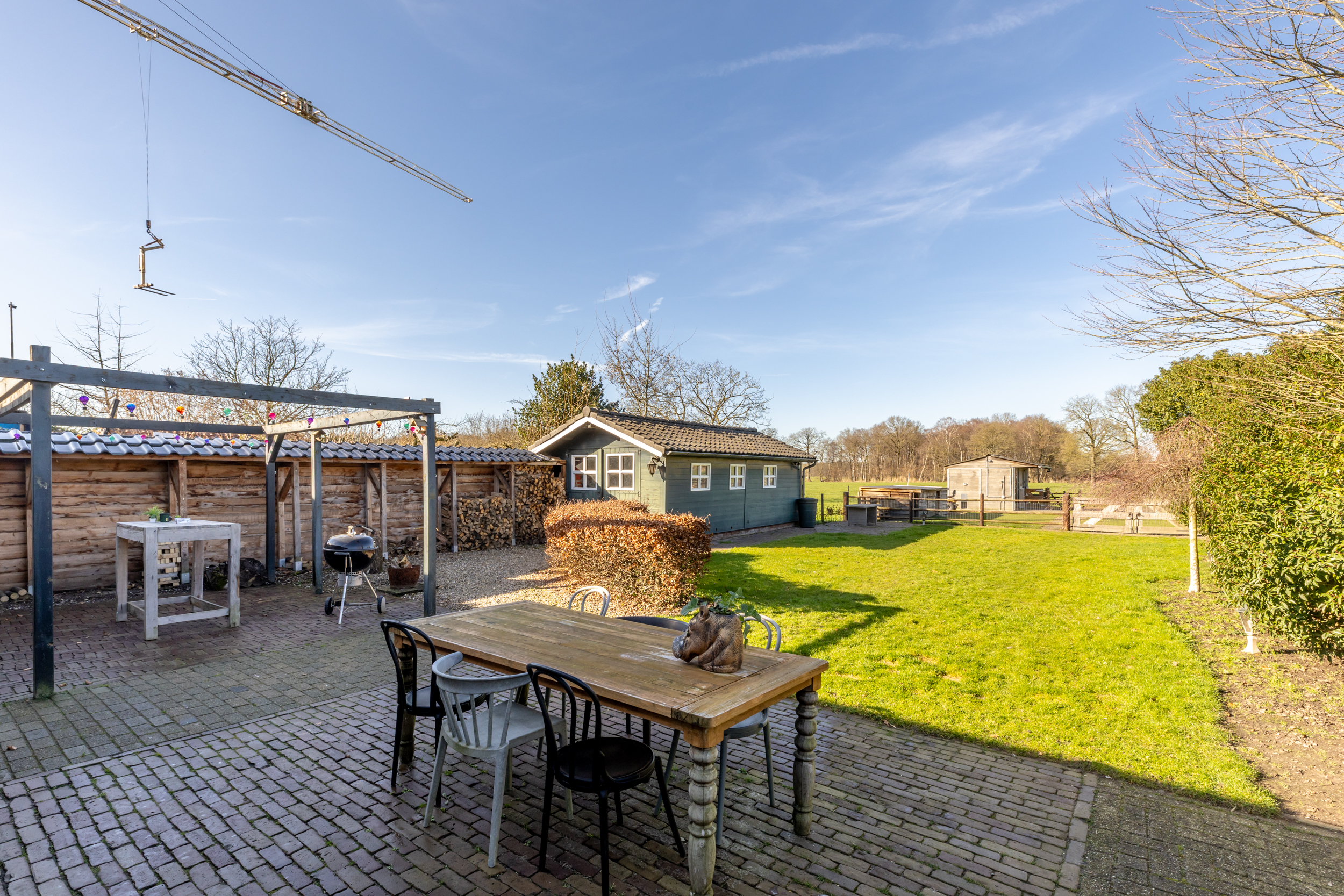 Achter het huis is een ruim bestraat terras aanwezig dat grenst aan een groot gazon wat overloopt in het achtergelegen weiland. Wat een uitzicht!