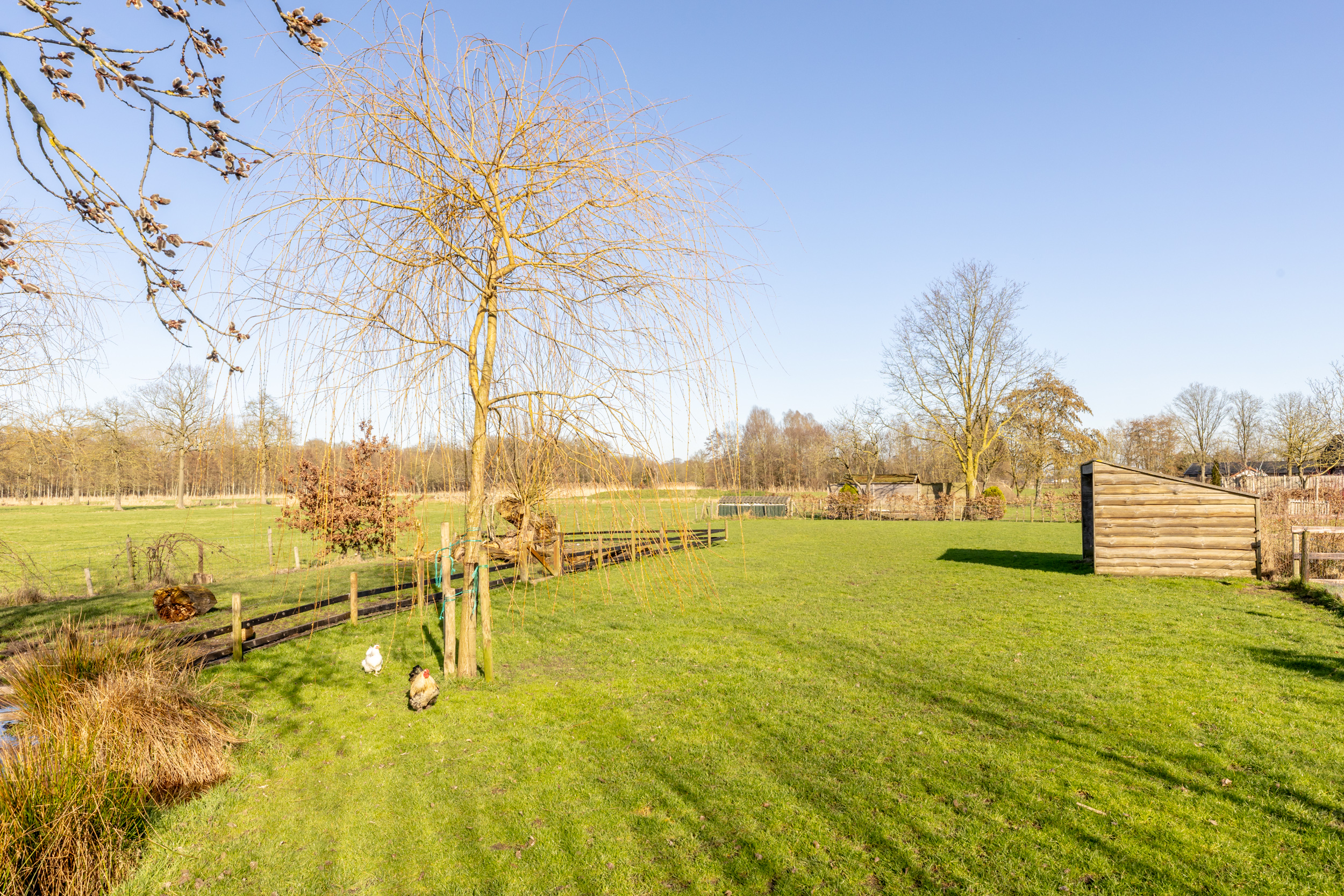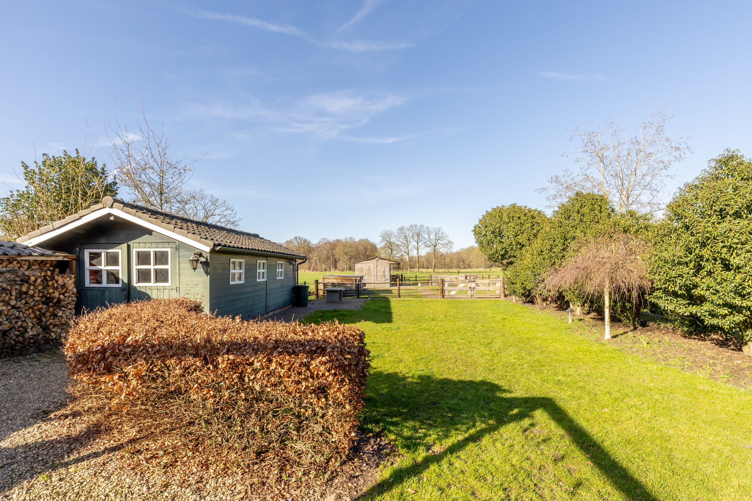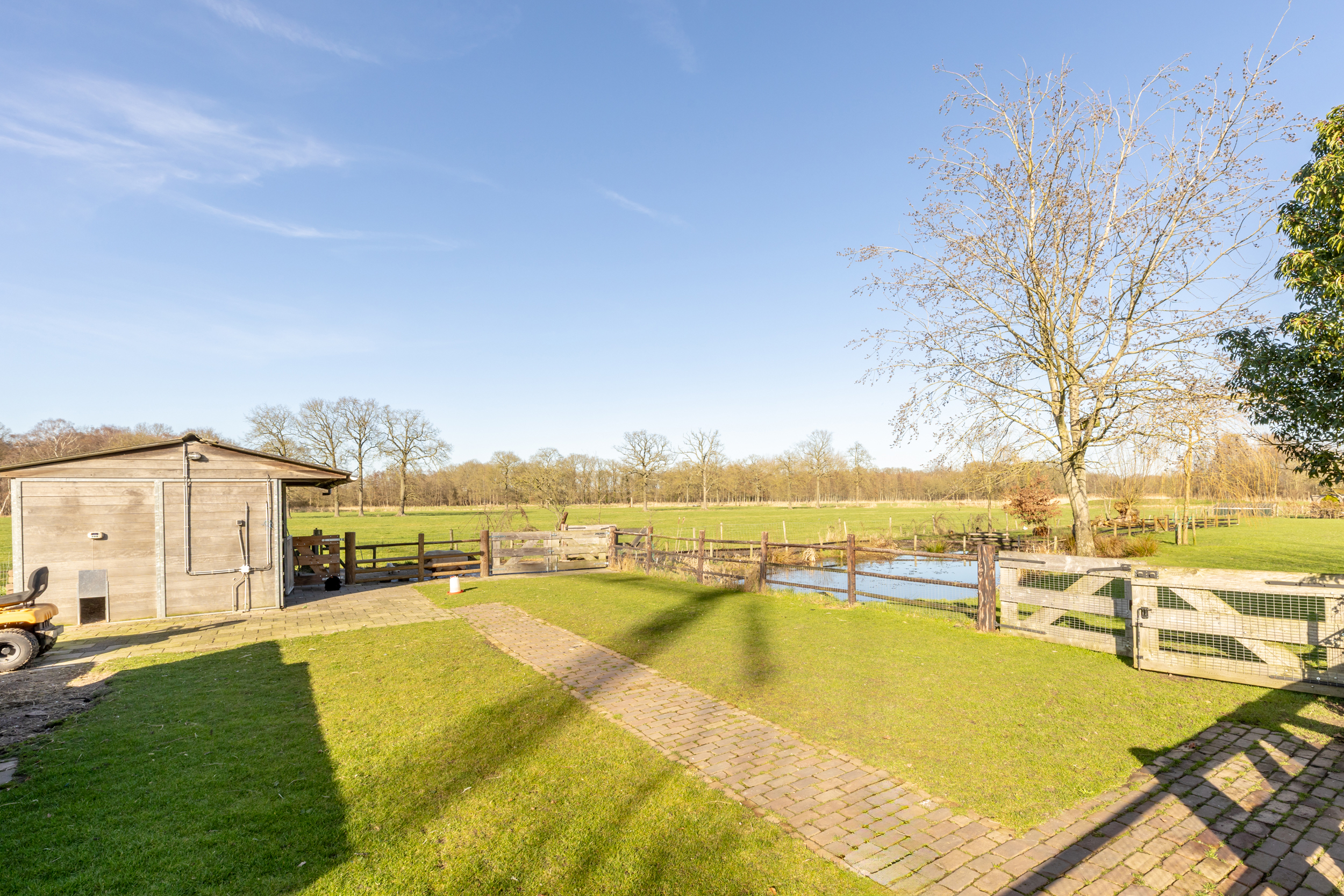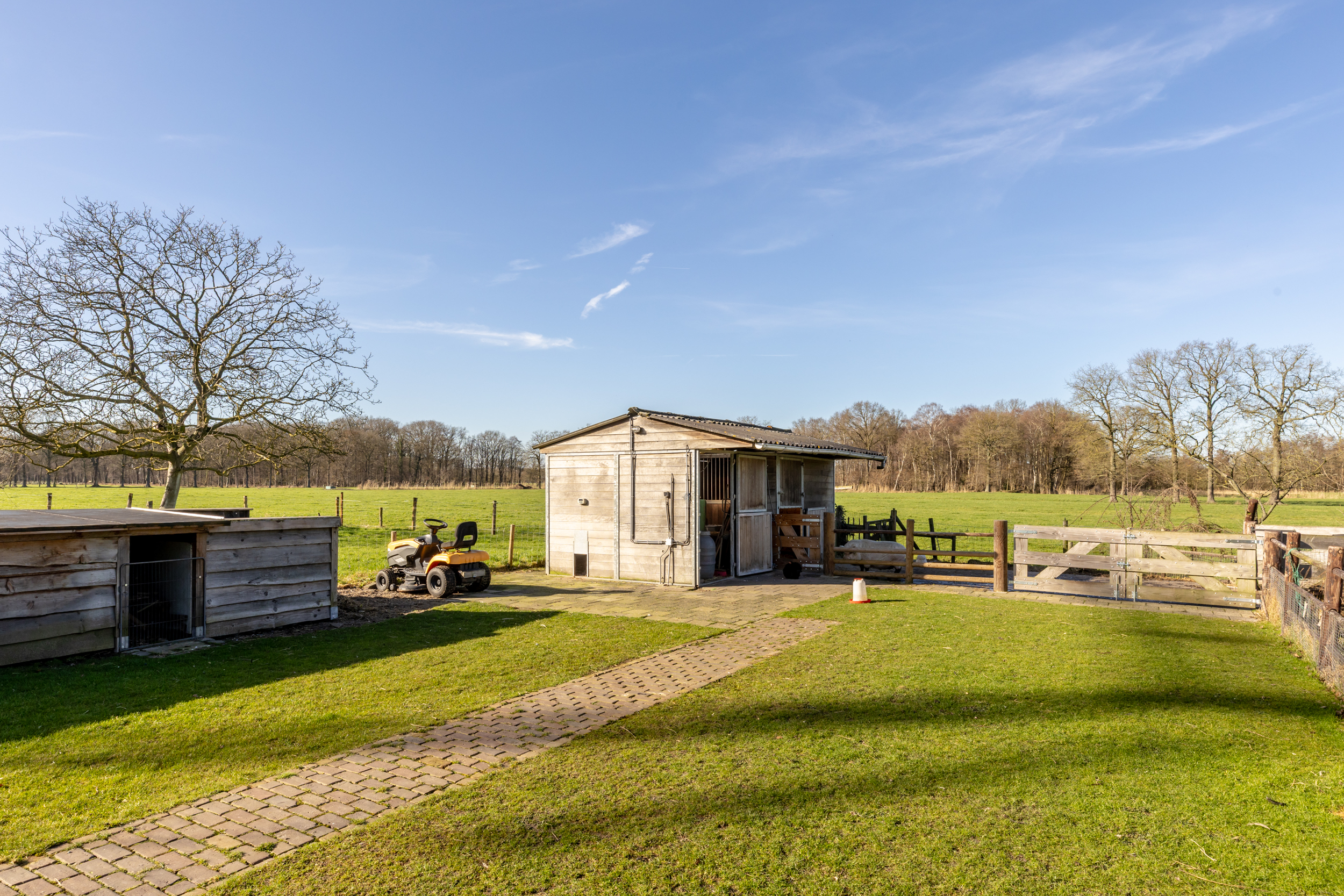 Verder naar achteren wordt de tuin middels een tuinhek afgescheiden van de paardenstallen, de weide en de vijver. Hier is ook de grondwaterput aanwezig voor de besproeiing van het weiland. Er zijn twee paardenboxen aanwezig van ieder bijna 9m2 groot.