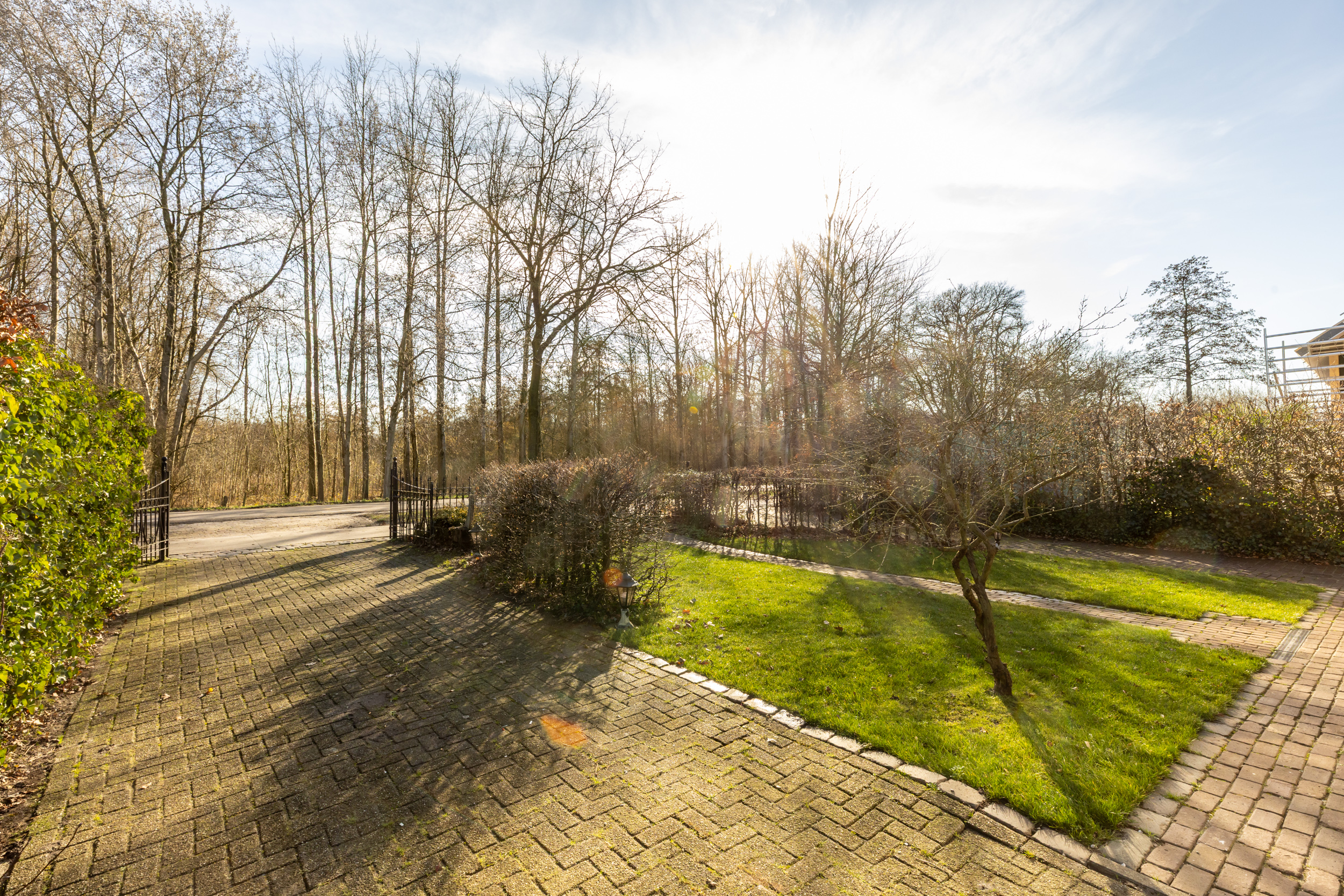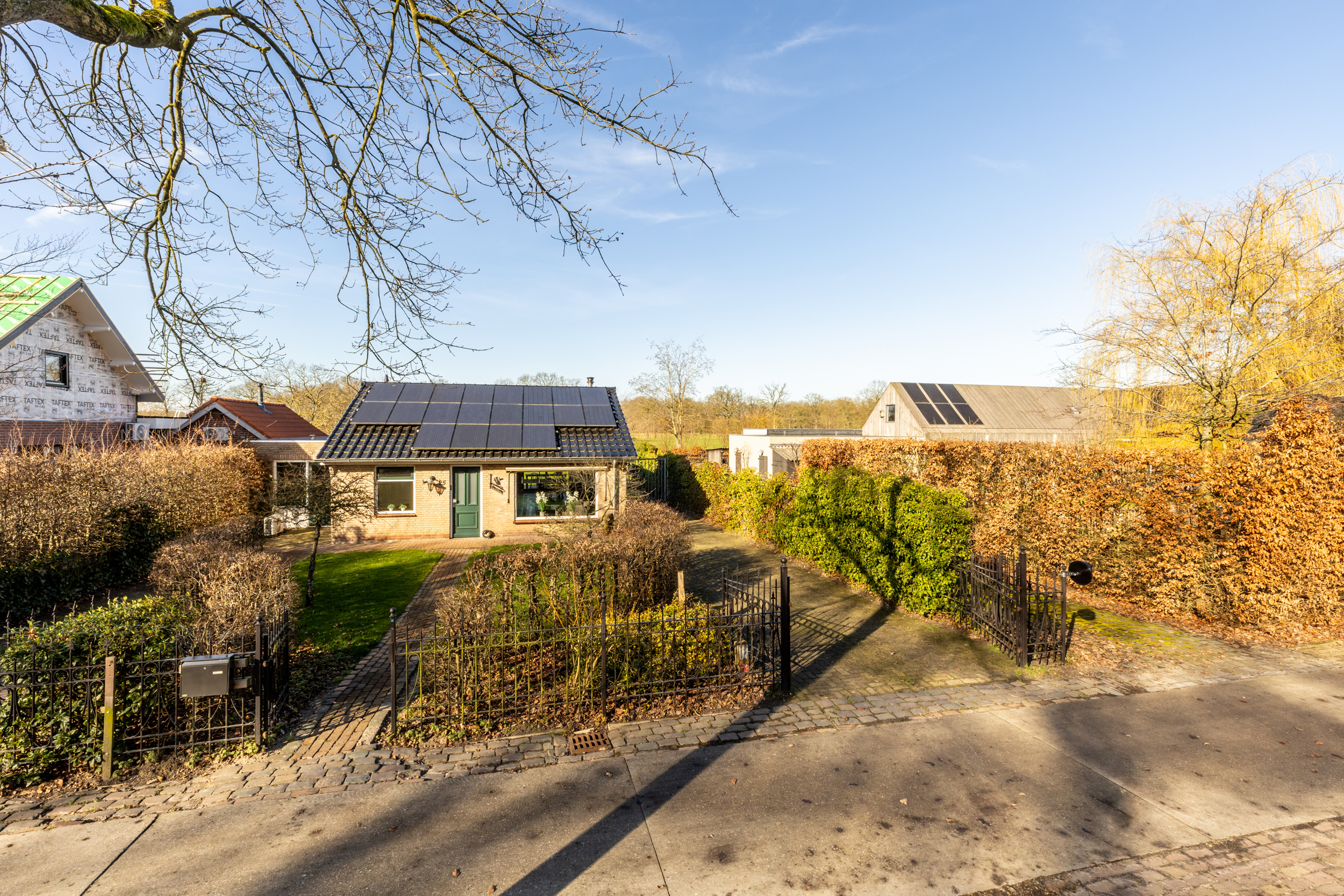 Wat een ruimte en vergezichten tref je rondom de woning aan. Aan de voorzijde van de woning zorgen de twee opritten voor voldoende parkeerplaatsen op eigen terrein. Aansluitend aan de oprit is poort gelegen ten behoeve van de achterom.