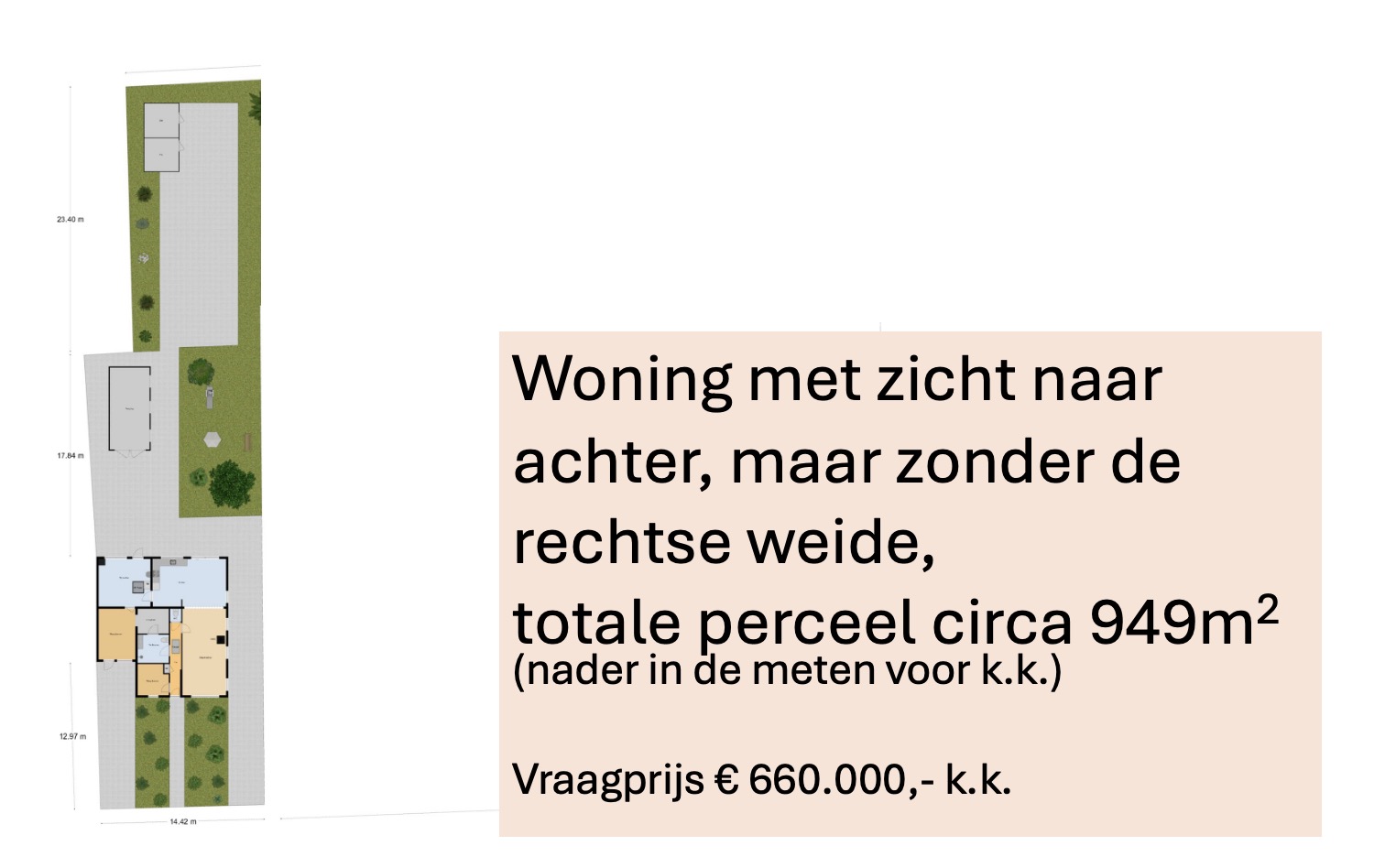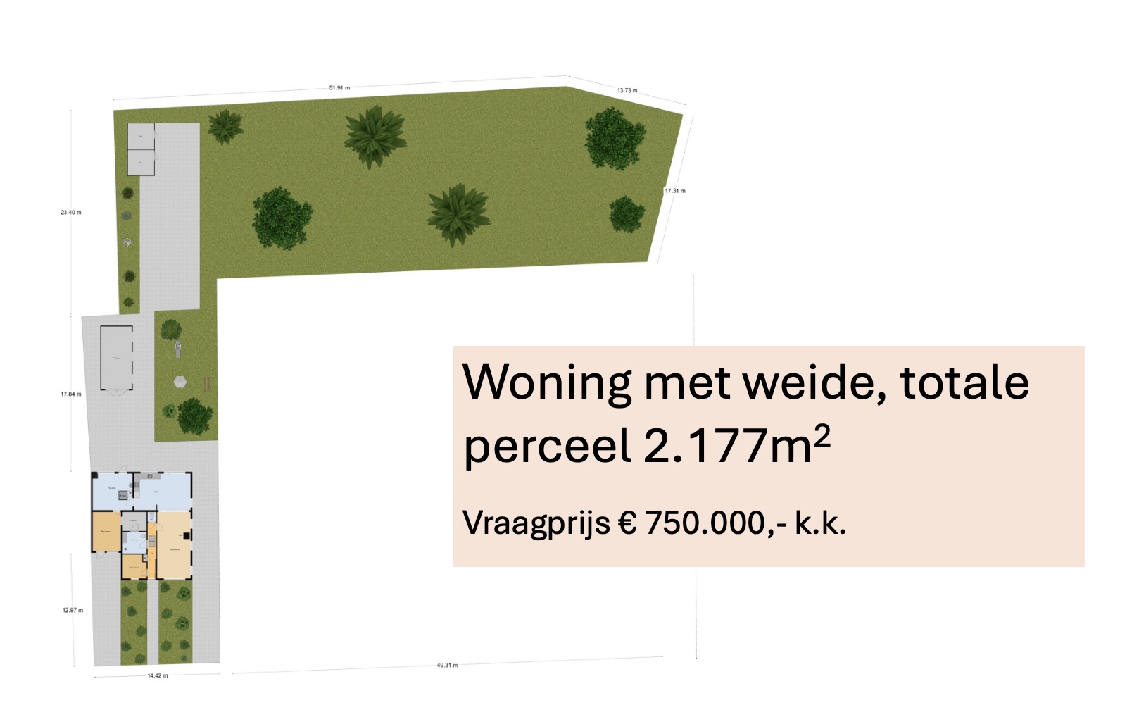 De woning is ook met het rechtse weiland te koop, het totale perceel is dan 2.177m2 groot. De vraagprijs bedraagt voor het totaal € 750.000,- k.k.
